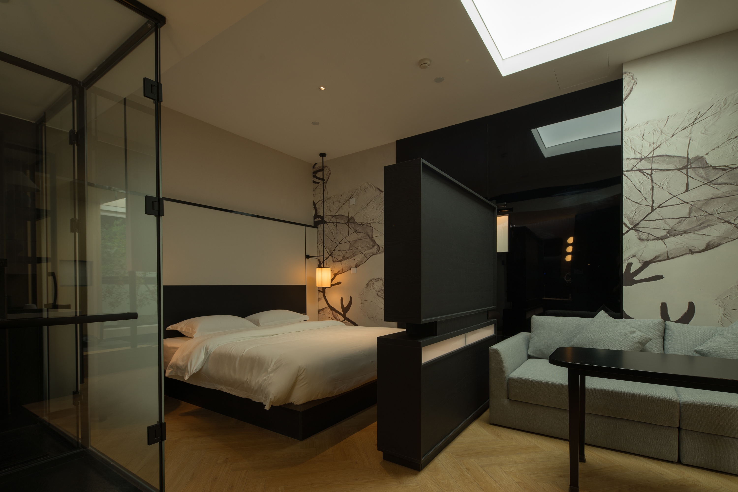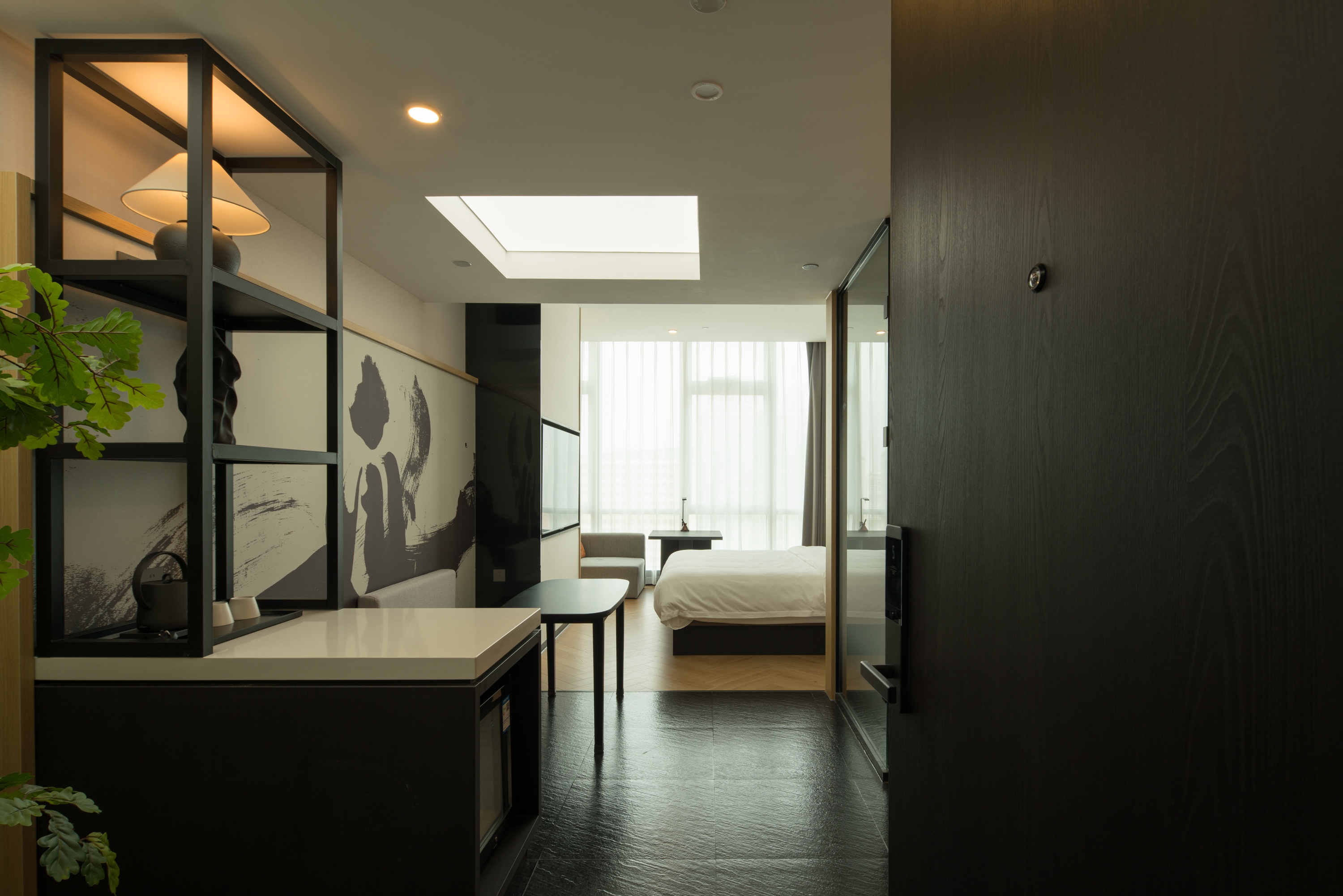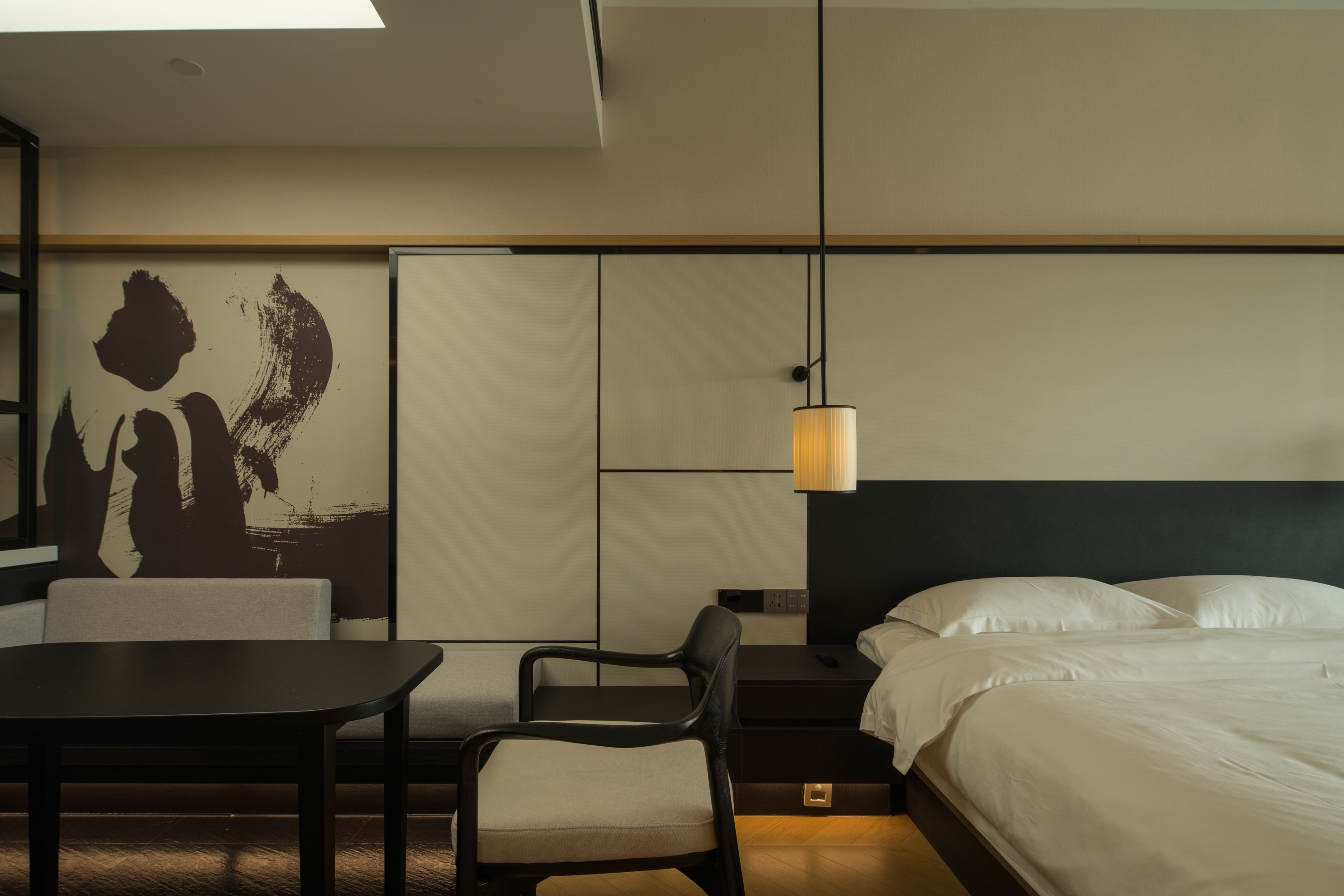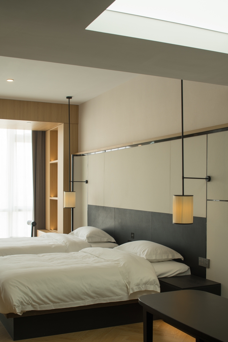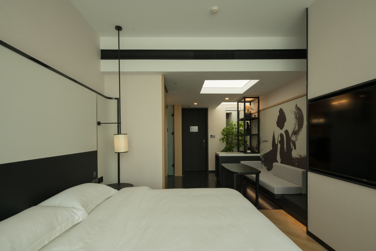 Guest rooms feature minimalist lines and warm wood tones as a modern base, enhanced by Oriental accents such as screen partitions and ink-inspired motifs. Floor-to-ceiling windows bring in natural greenery, seamlessly connecting the interior to the surrounding environment.