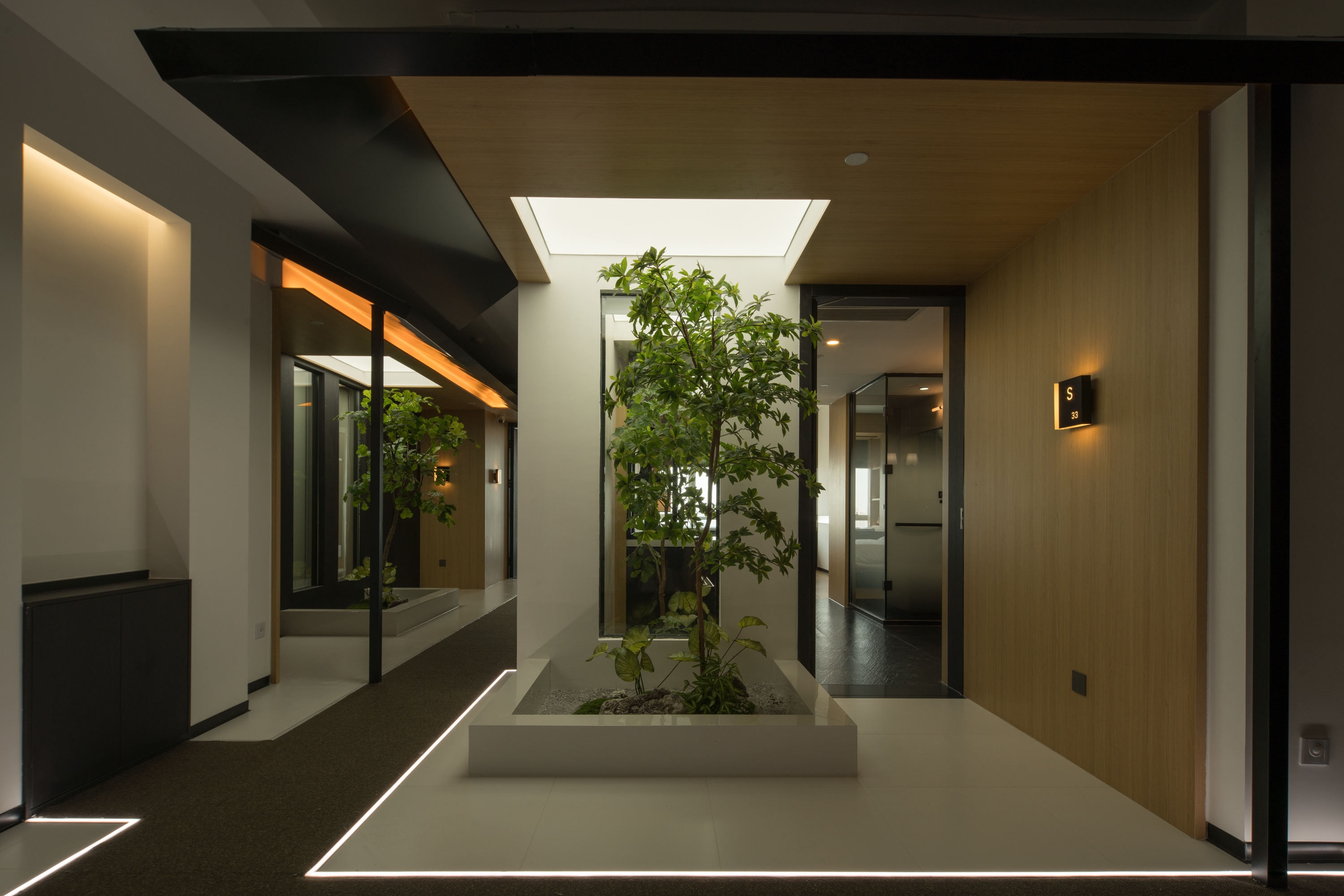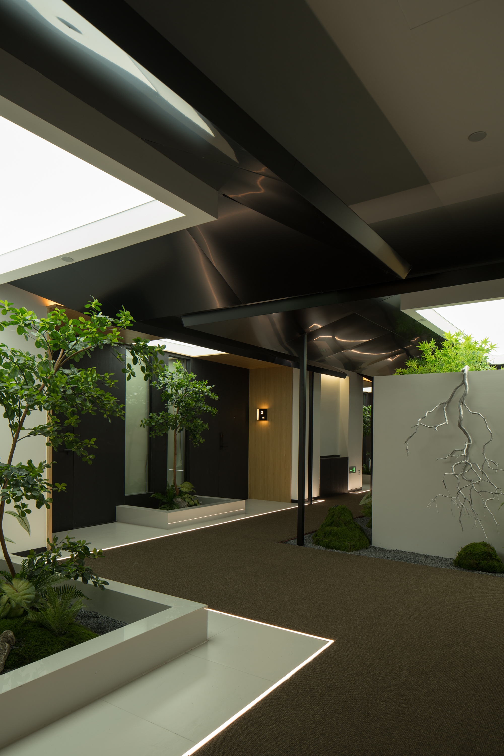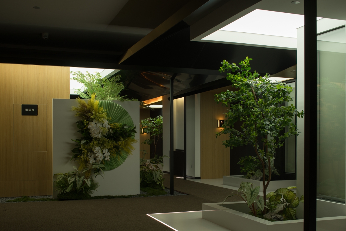 Public areas are lush with layered green landscapes, where tropical broad-leaved plants and mosses blur the lines between indoors and outdoors. These dynamic spaces invite guests to immerse themselves in nature, offering changing views and a tranquil ambiance.