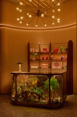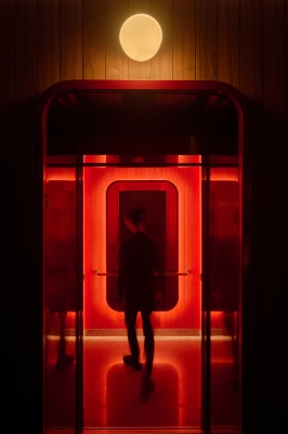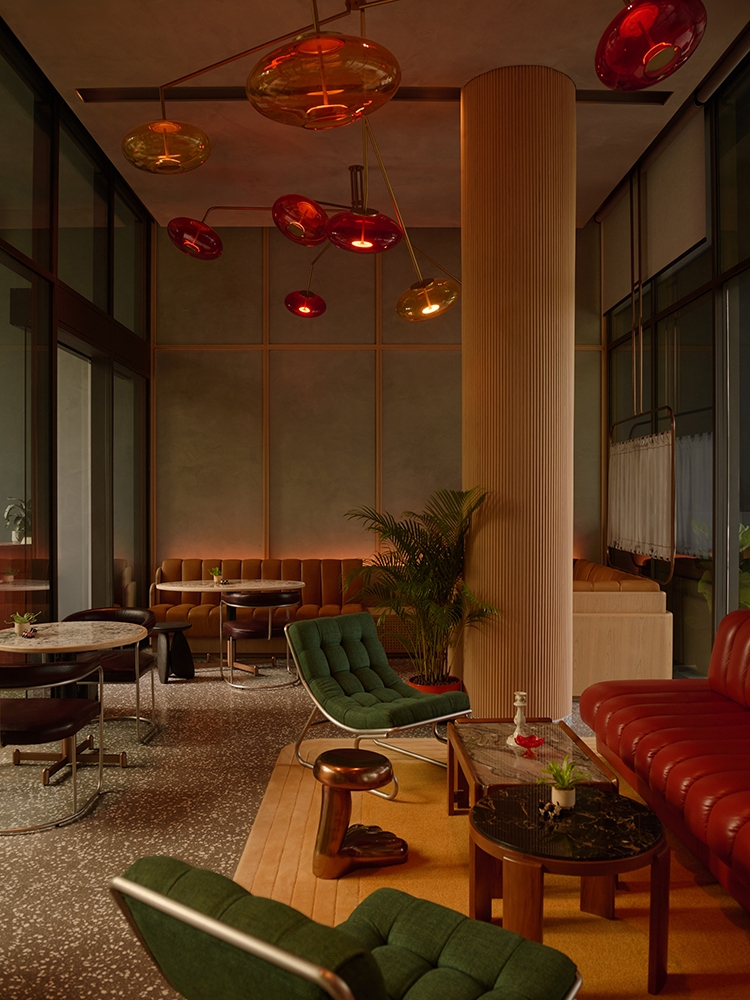 Curving walls adorned with warm timber battens sweep through the double-heighted space, and draw you from the playful Reception to the Cafe Standard, where plant-filled nooks with an inviting bar, quirky couches and cocktails await. The custom-designed light installation floats above: a colour-filled anti-chandelier channelling a distinctive mid-century modern vibe.