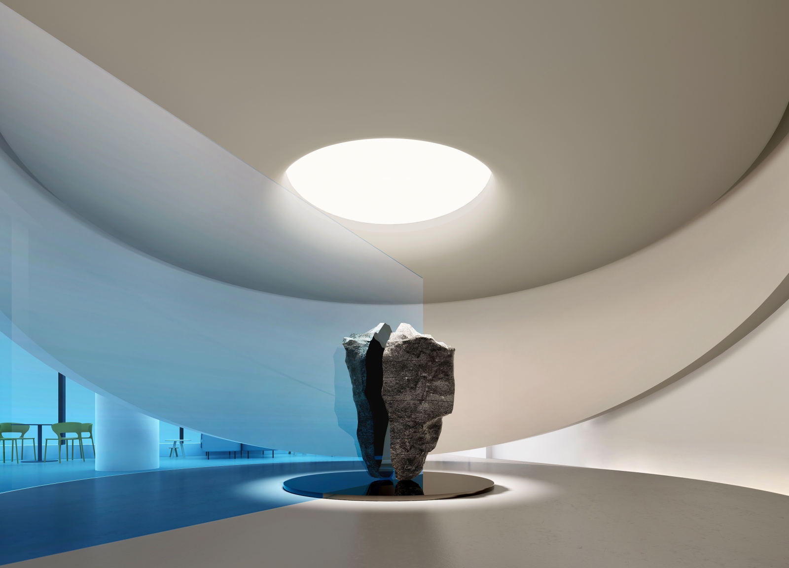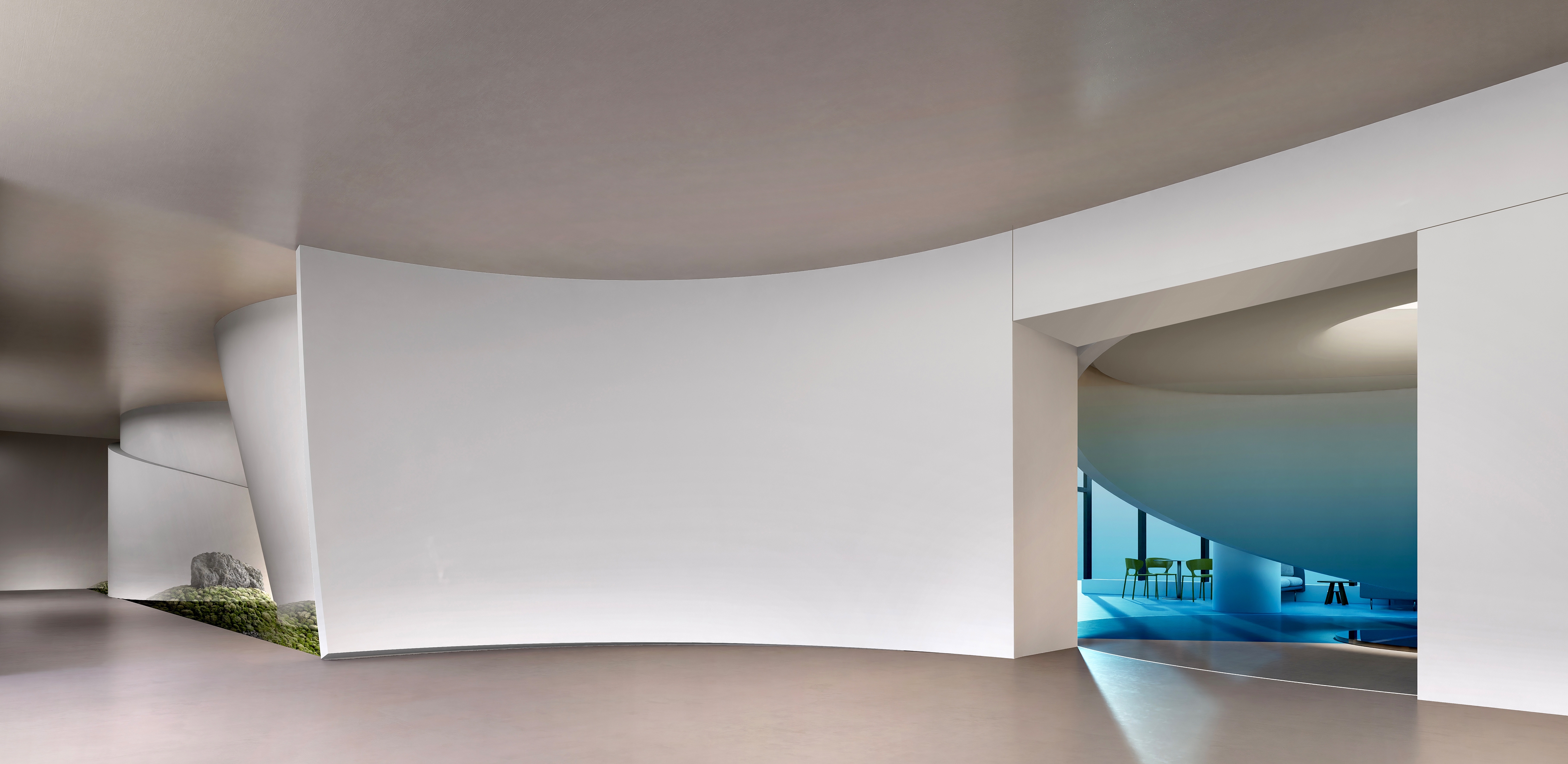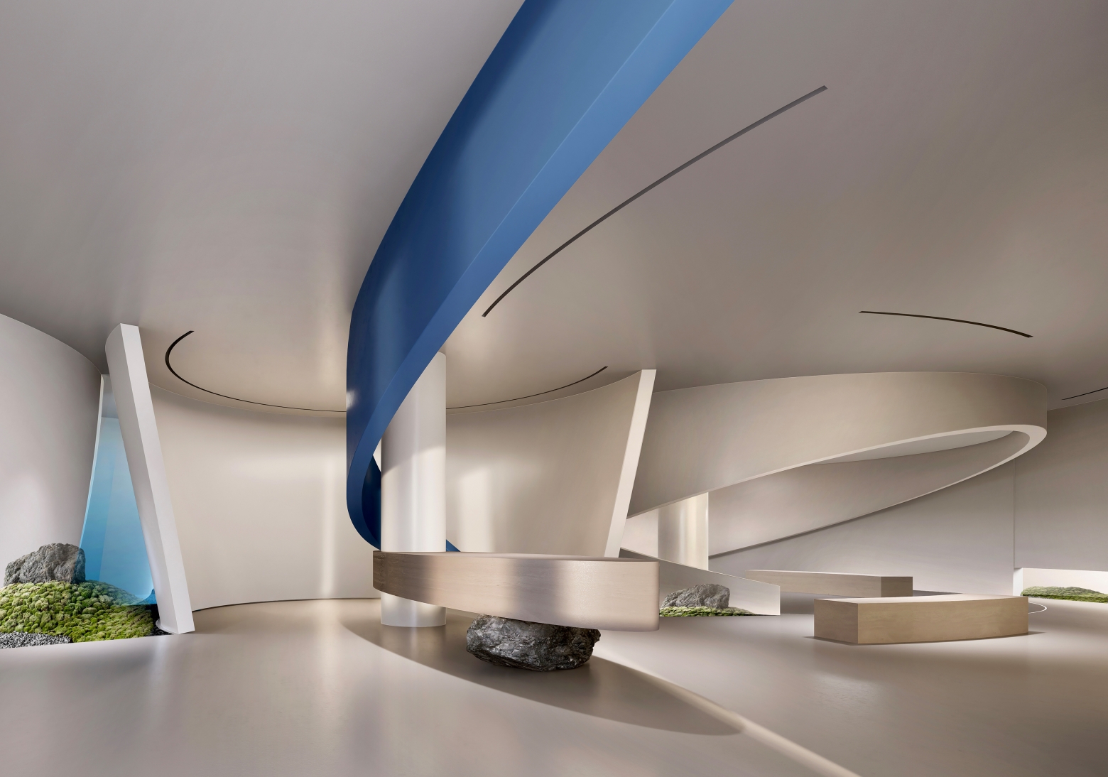 1.The project is located beside the Thomson Lake in Wuhan. The designer used water as the design inspiration for the space. The changing state of water is dynamic and full of energy. We drew inspiration from water and creatively applied it to the exhibition hall space. At the same time, the integration of landscape injects vitality into the space, and the light travels through the space, bringing a different experience.