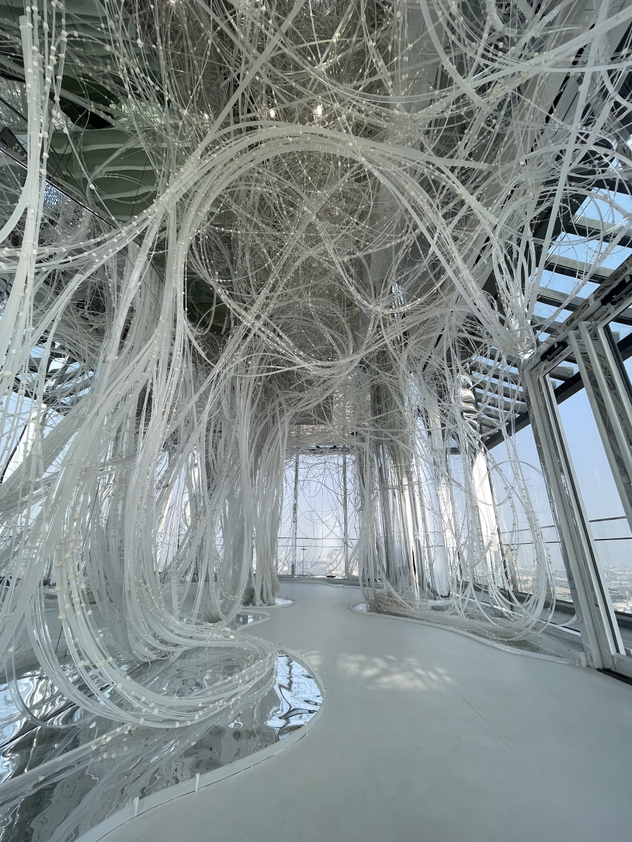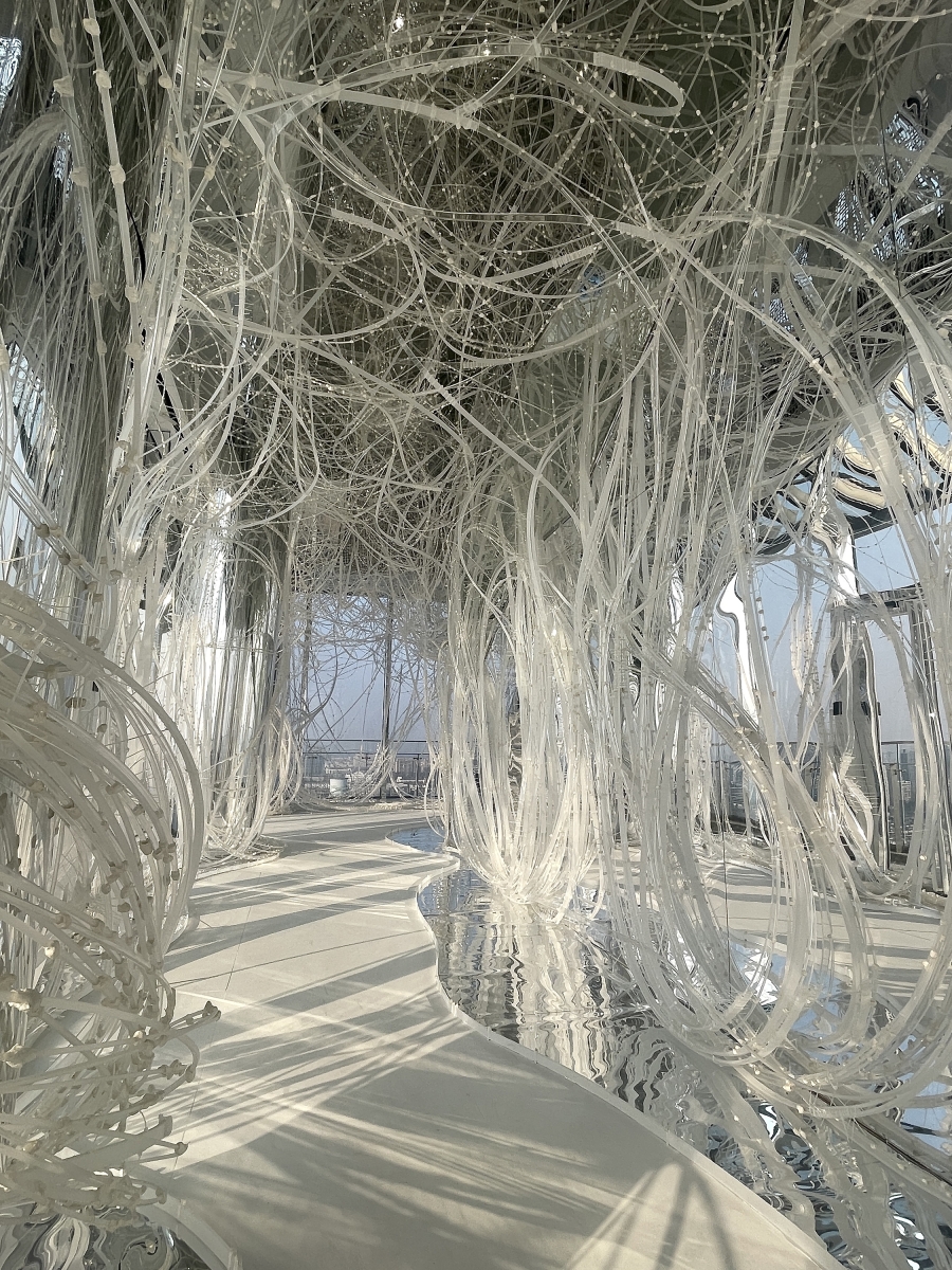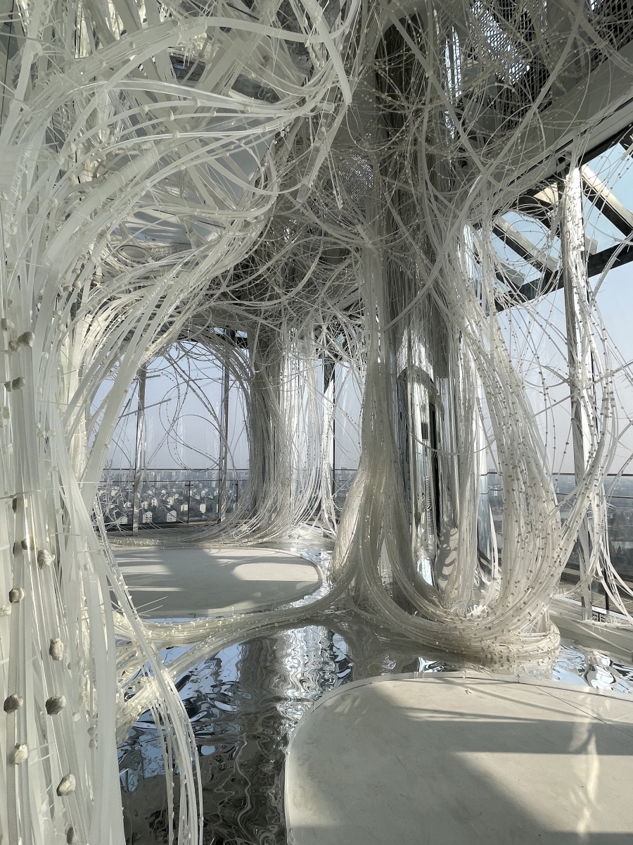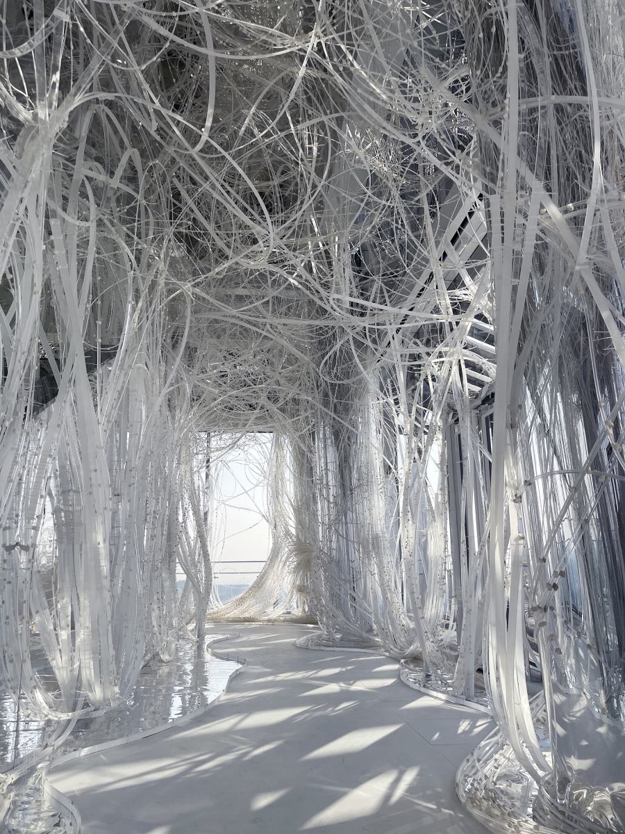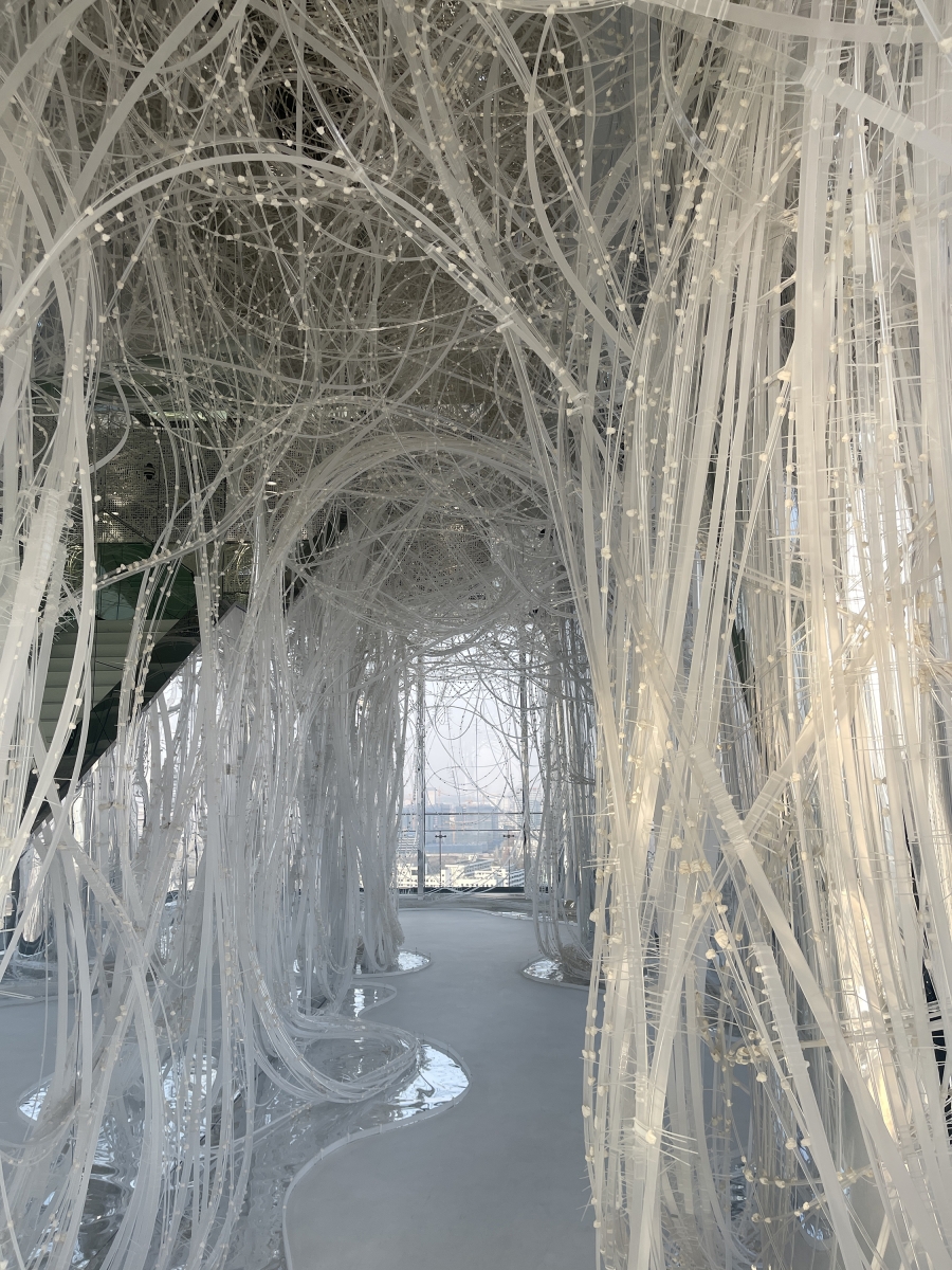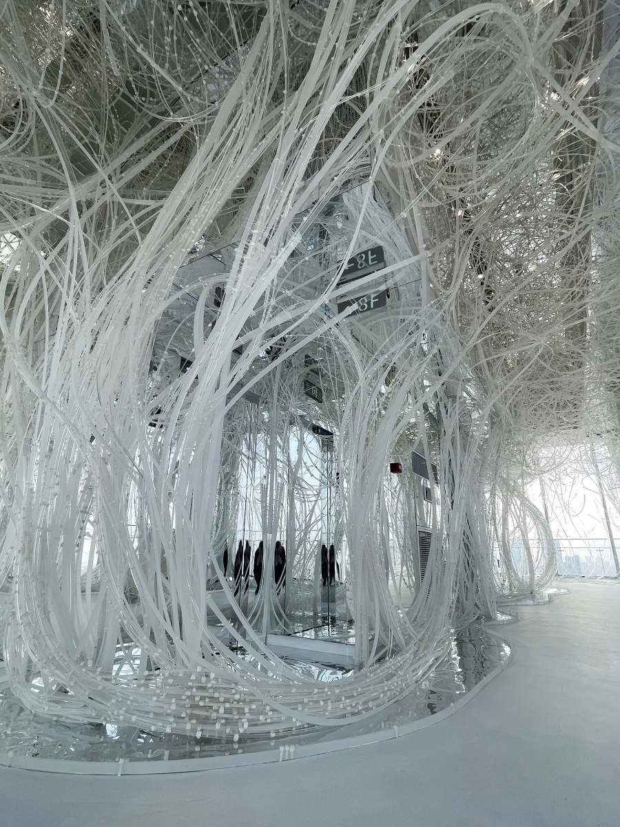 Comprising 33,000 acrylic resin rods spanning 64,000 meters, this installation forms a dynamic structure based on the flexibility and fortuitous power of the material, inspired by trees taking root and growing into a robust system. On this foundation, the xuan paper is applied to the "branches," imparting a unique spatial experience and evoking a flowering plum forest in snow.