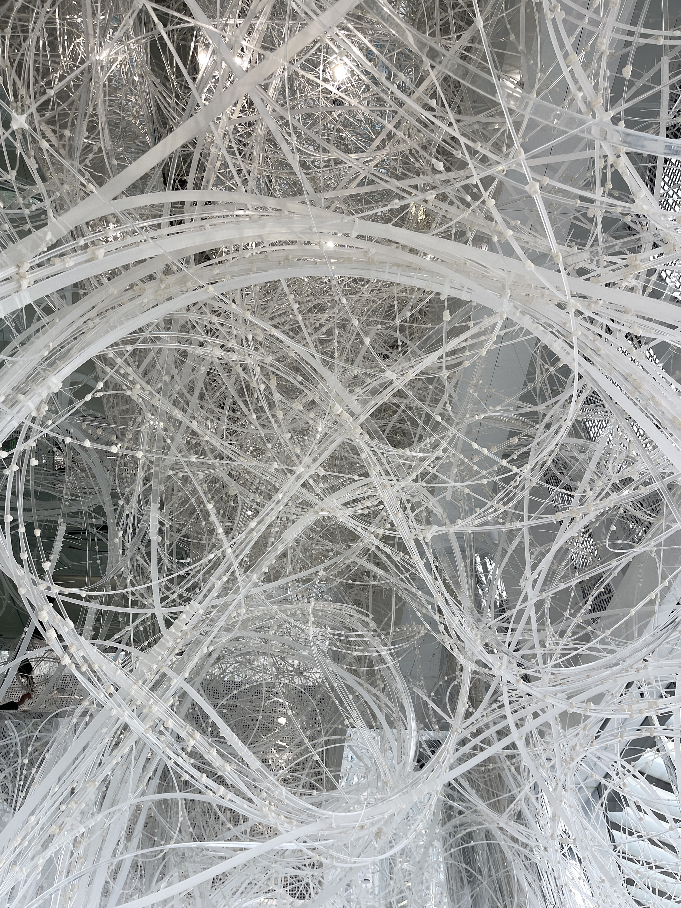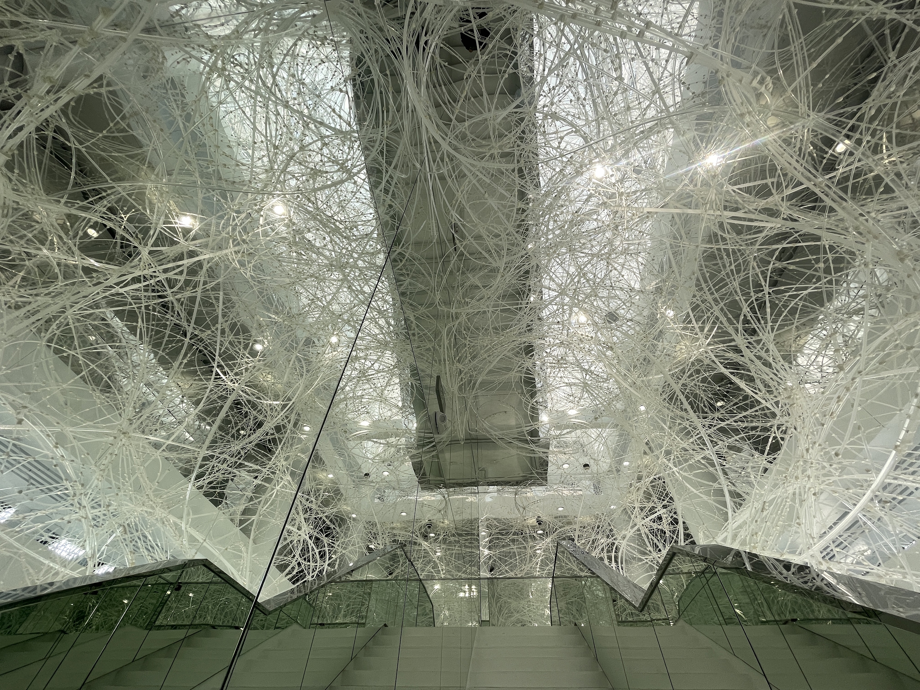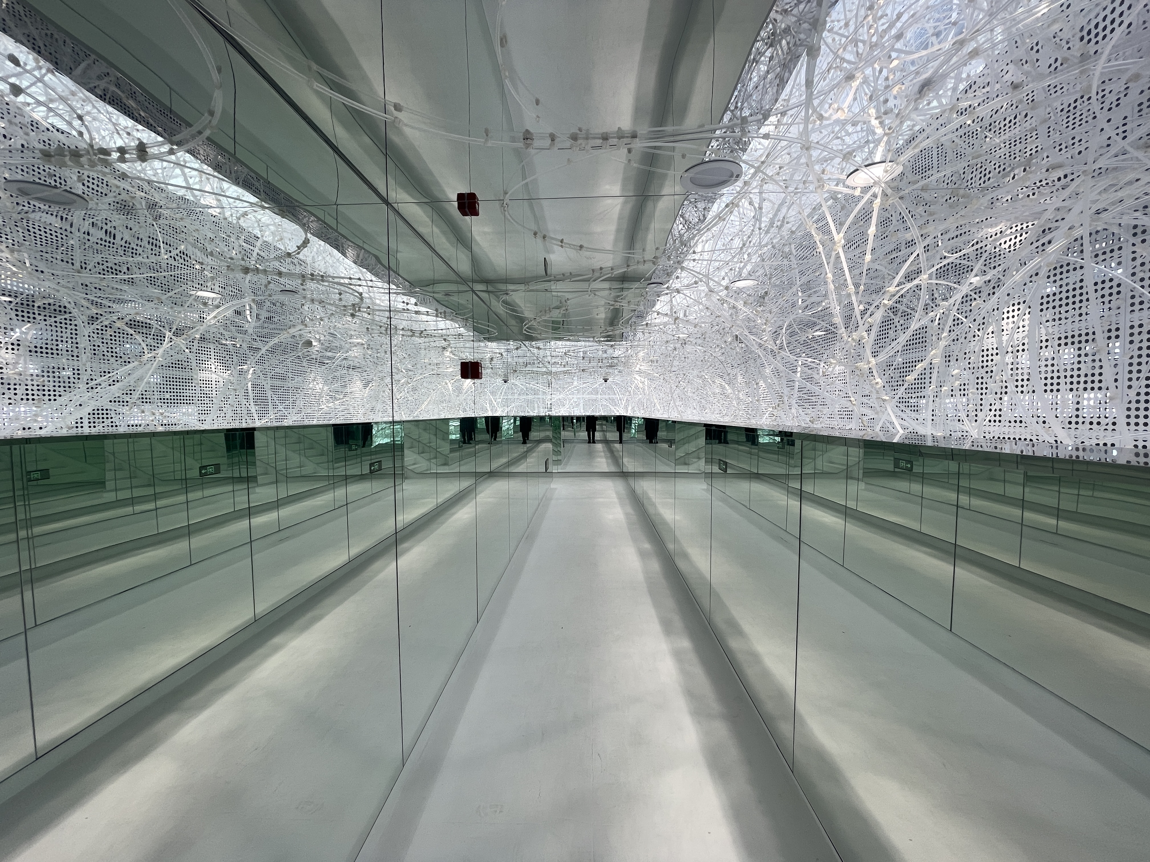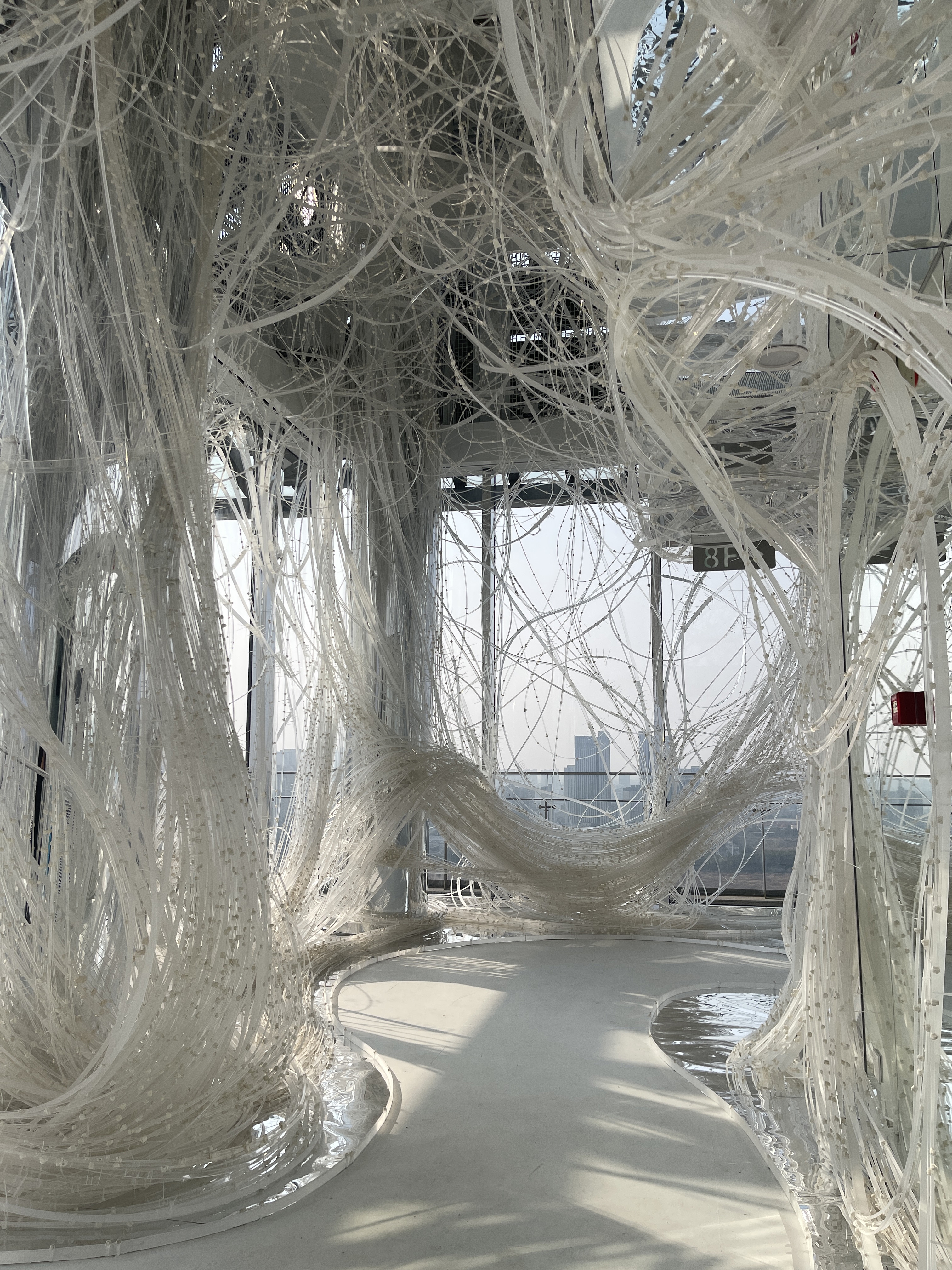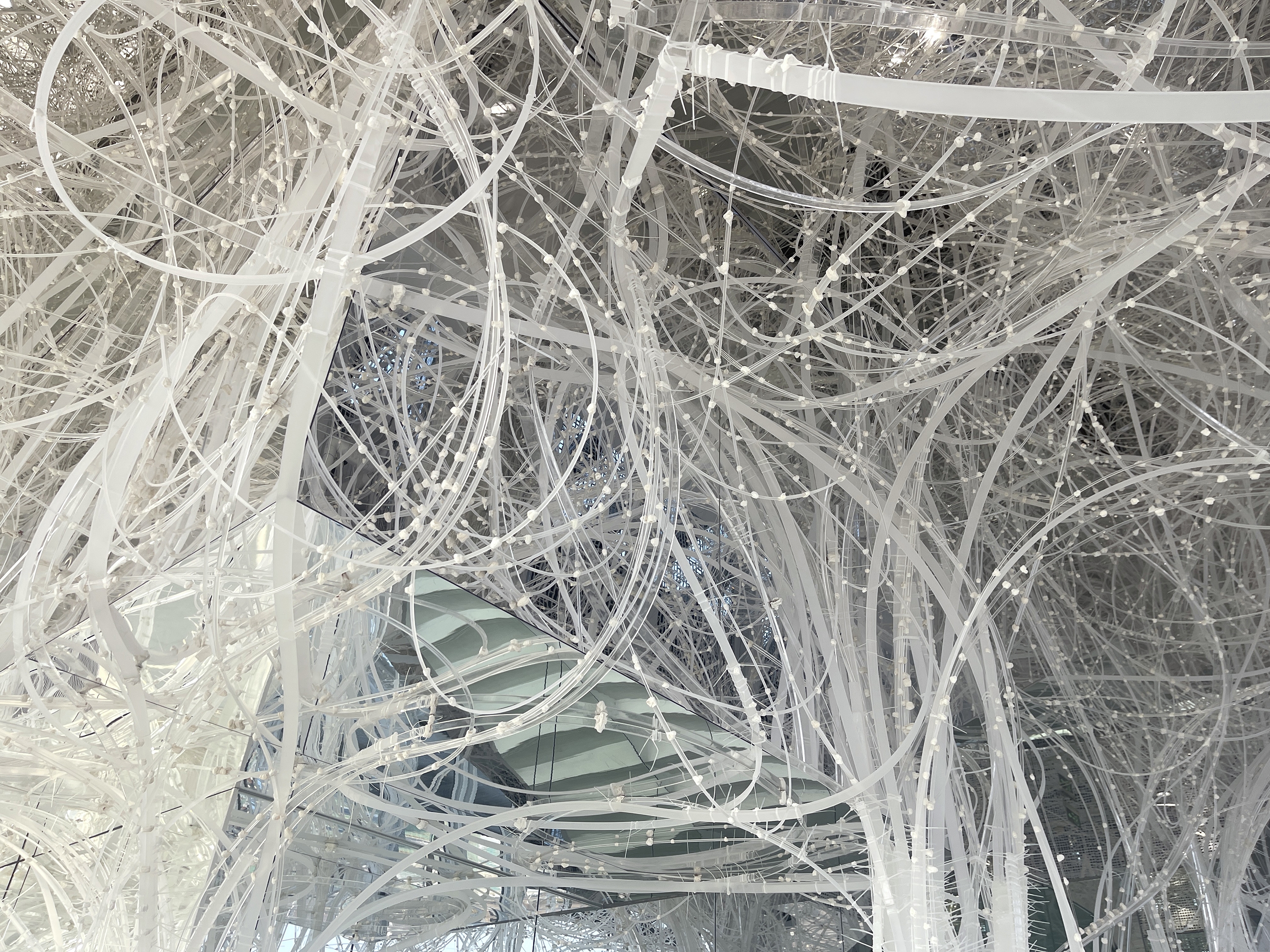 Comprising 33,000 acrylic resin rods spanning 64,000 meters, this installation forms a dynamic structure based on the flexibility and fortuitous power of the material, inspired by trees taking root and growing into a robust system. On this foundation, the xuan paper is applied to the "branches," imparting a unique spatial experience and evoking a flowering plum forest in snow.