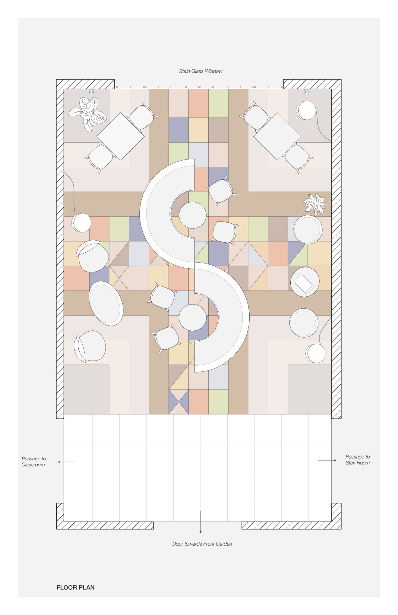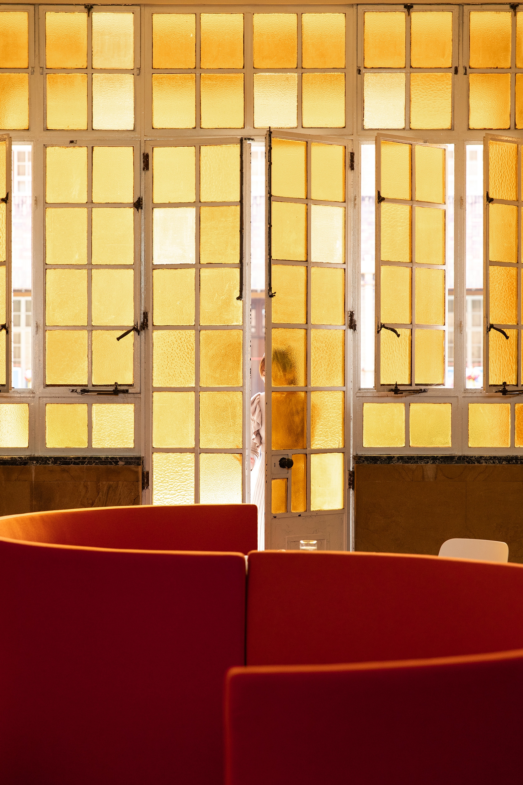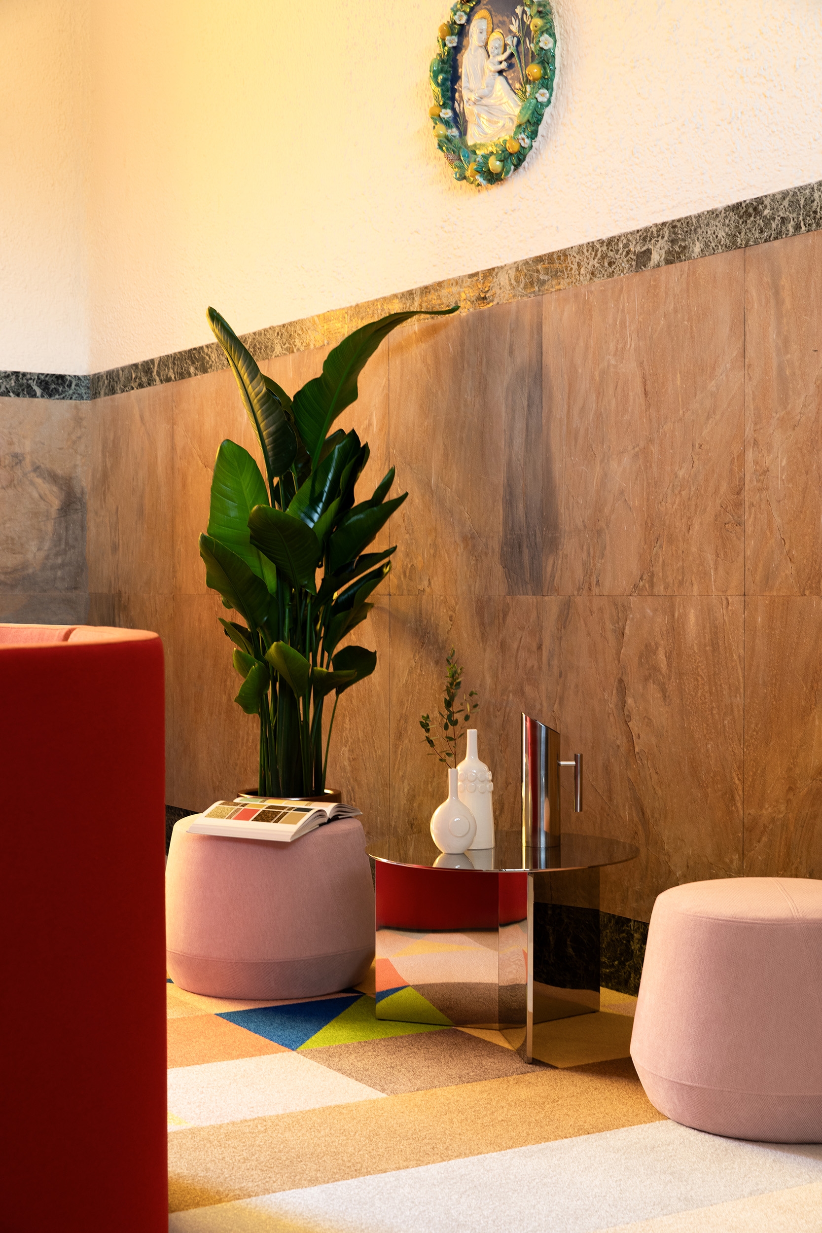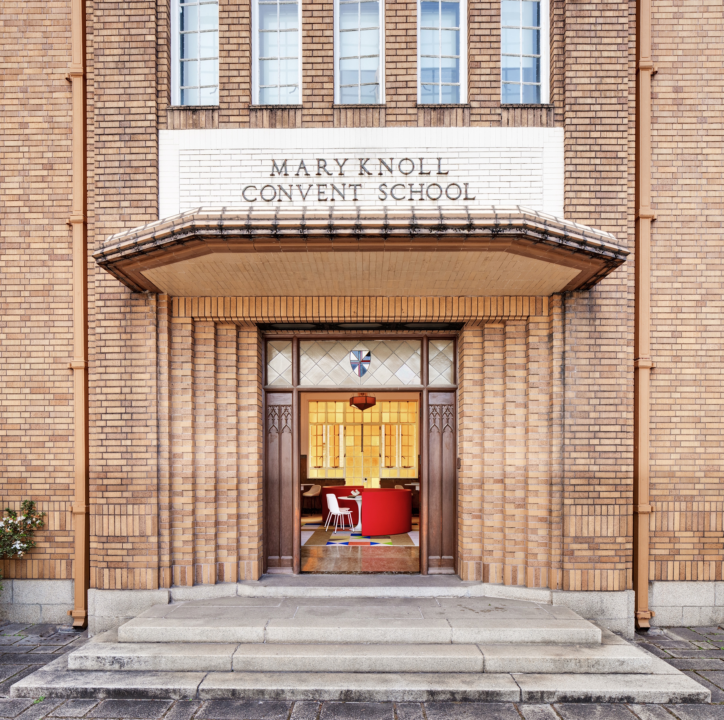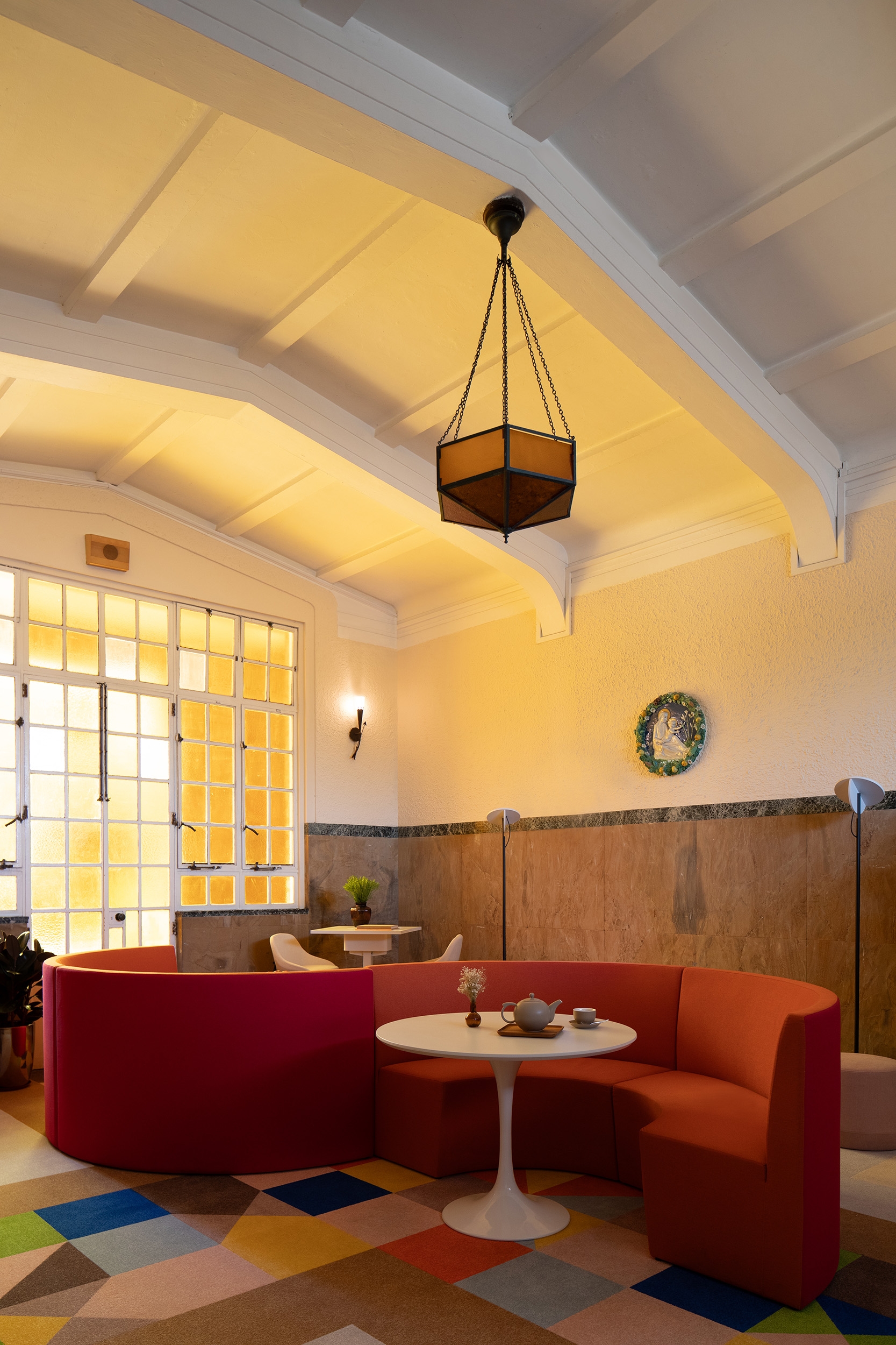 Nestled within the historic Maryknoll Convent School in Hong Kong, this newly reimagined teachers' lounge transforms a long overlooked vestibule into a vibrant, multi-use venue for connection, pause, and collaboration. Framed by the 1925 stained-glass window, arched beams and marble wainscot — elements that could not be tampered with due to the site’s heritage status — the minimal intervention is both reverent and contemporary. Through bold furniture design pieces and a layout organized along a central axis that celebrates the symmetricality of classical architecture, the project is an assertive gesture that strengthens the dialogue between past and present.