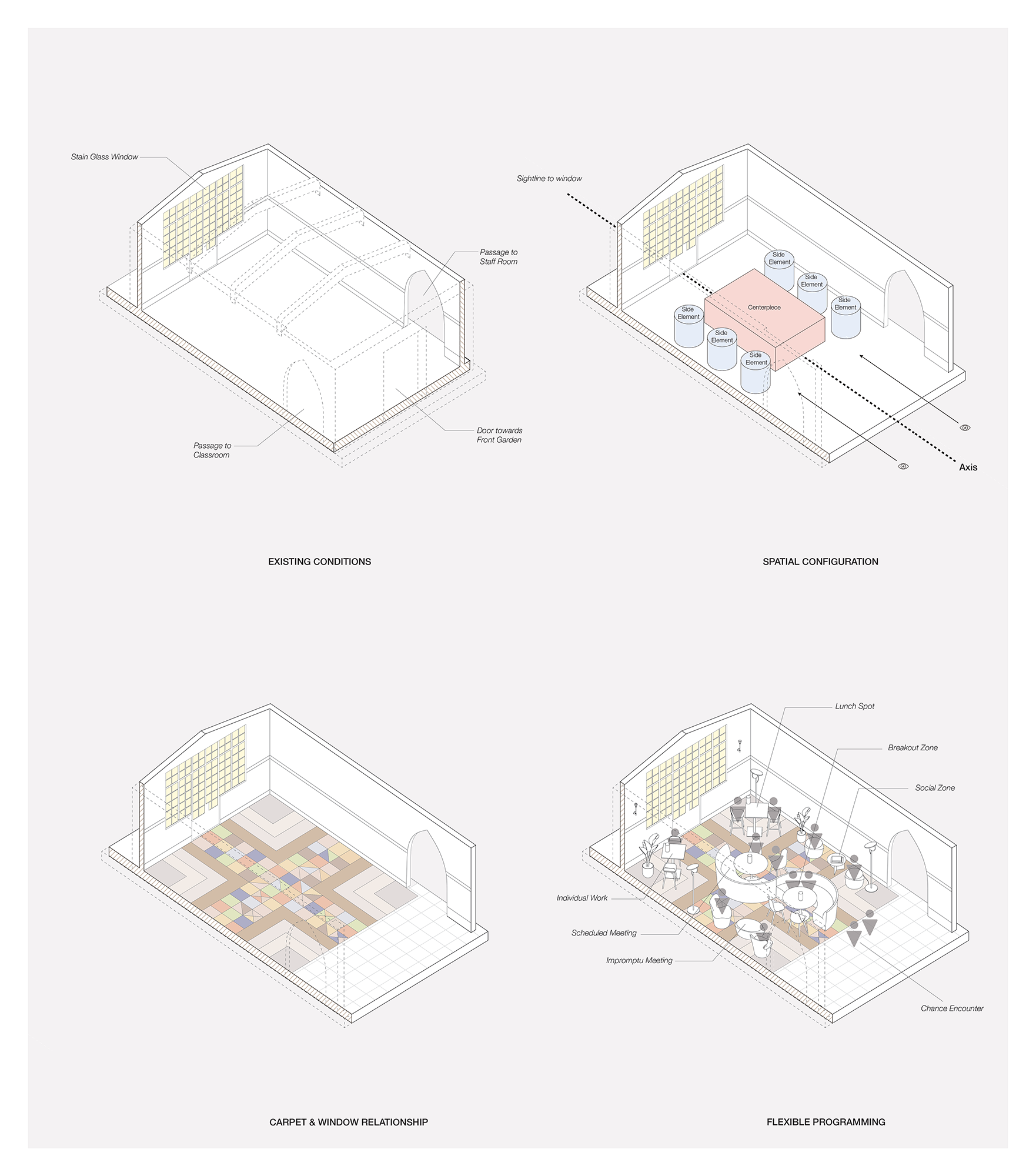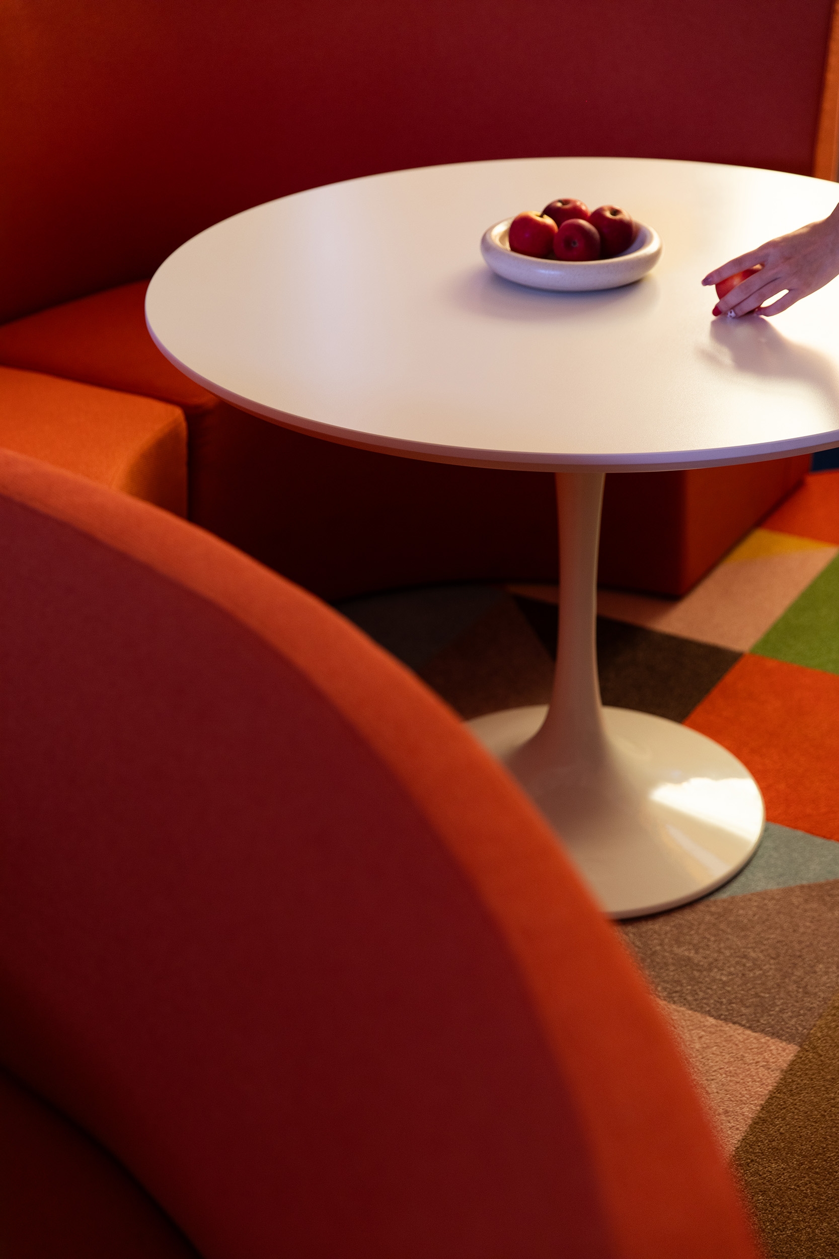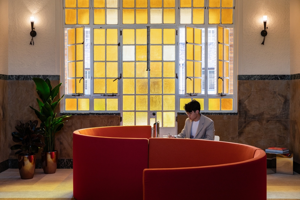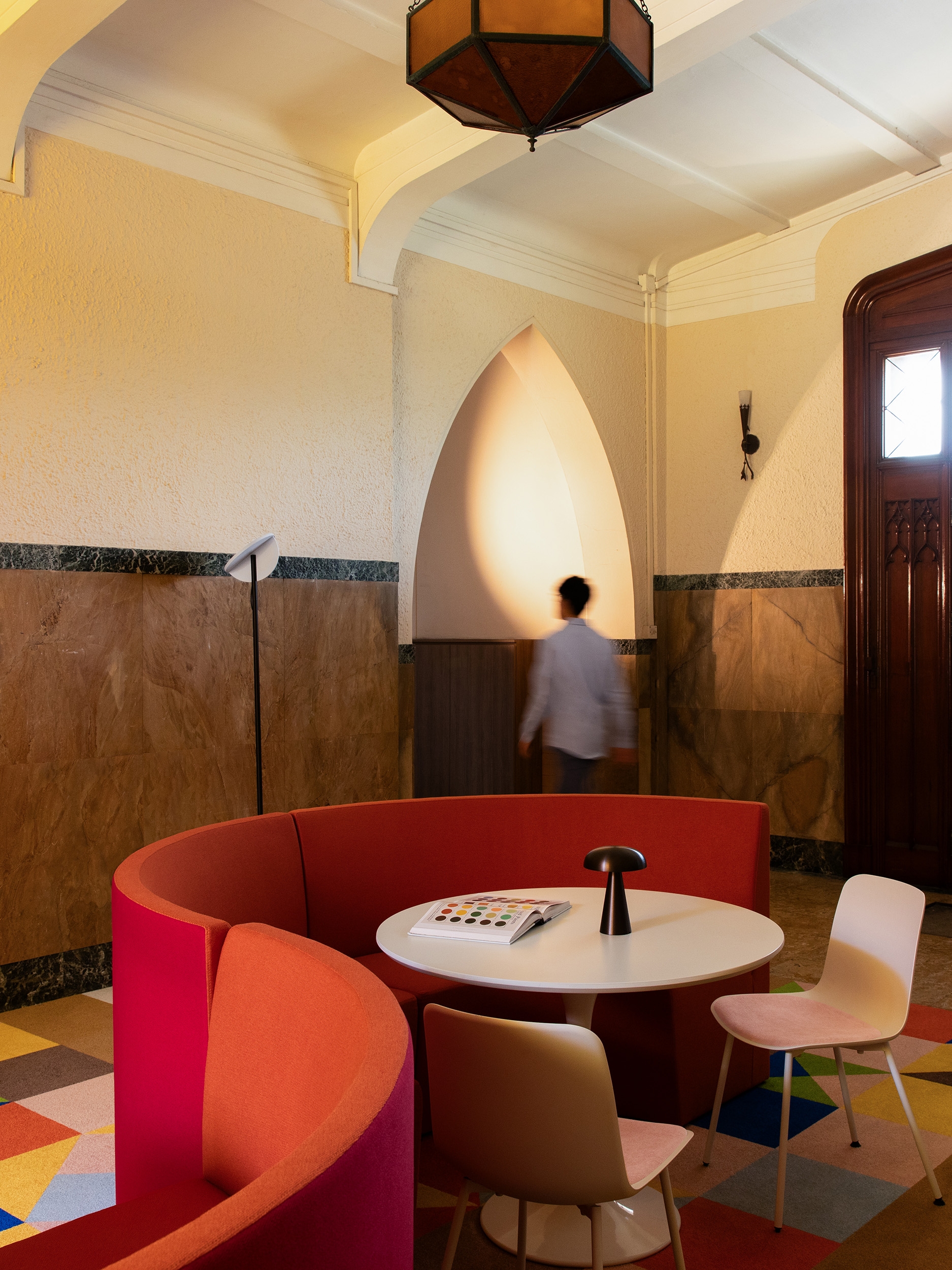 At the heart of the space, a sculptural S-shaped sofa anchors a choreography of movement and gathering, creating zones for individual work, impromptu meetings, chance encounters and collective respite. Intentional design moves, including a geometric rug design that acts as a counterpoint to the stained glass window, foreground educators' comfort and showcase how adaptive reuse can reframe institutional heritage for contemporary workplace needs.
