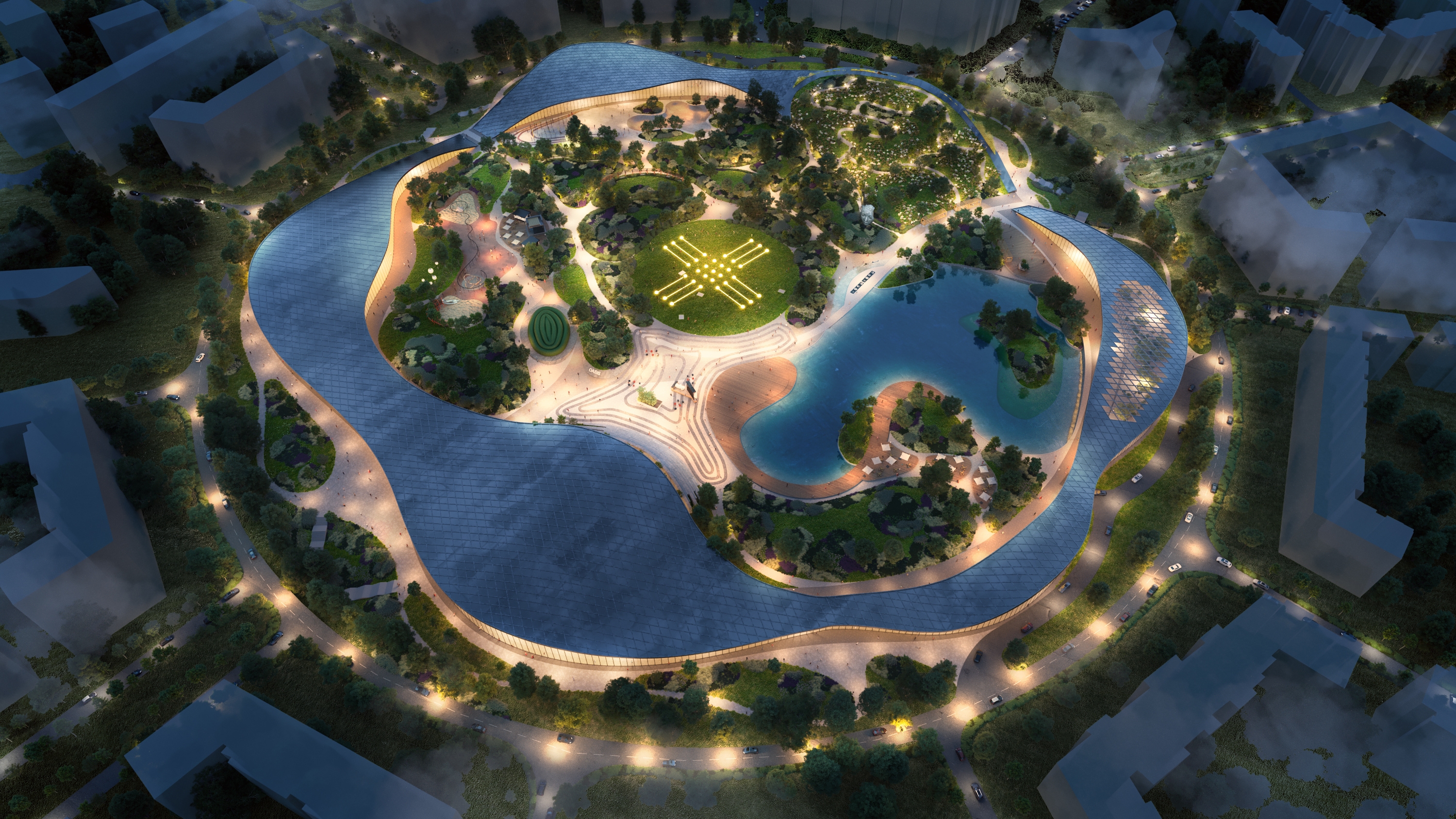 Its circular shape embraces many elements: alleys, water areas, traffic and business, cultural centers, sports facilities, and restaurants. The location's natural features — salty water and Astana's severe climate — contributed to a professional challenge.