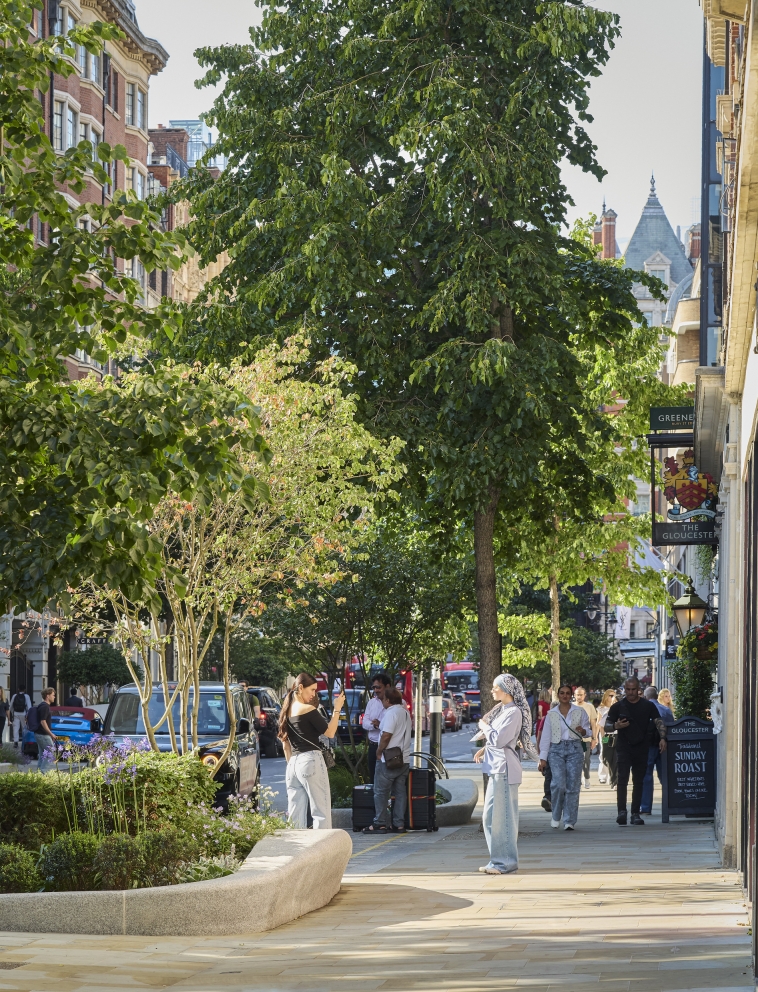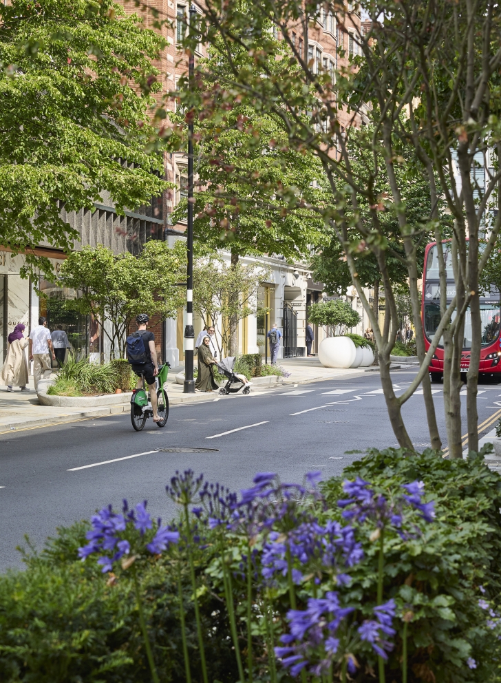 Aesthetic cohesion is reflected in a bespoke material palette, including honey-hued Yorkstone paving, handcrafted granite planters and dual-height lighting columns, with cast-iron embellishment inspired by ‘temple to the arts & crafts’ Holy Trinity Church on Sloane Street. The pavements have been expanded 23% to enhance pedestrian safety and accessibility, increasing dwell time and footfall for local businesses, contributing millions to the economy each year.