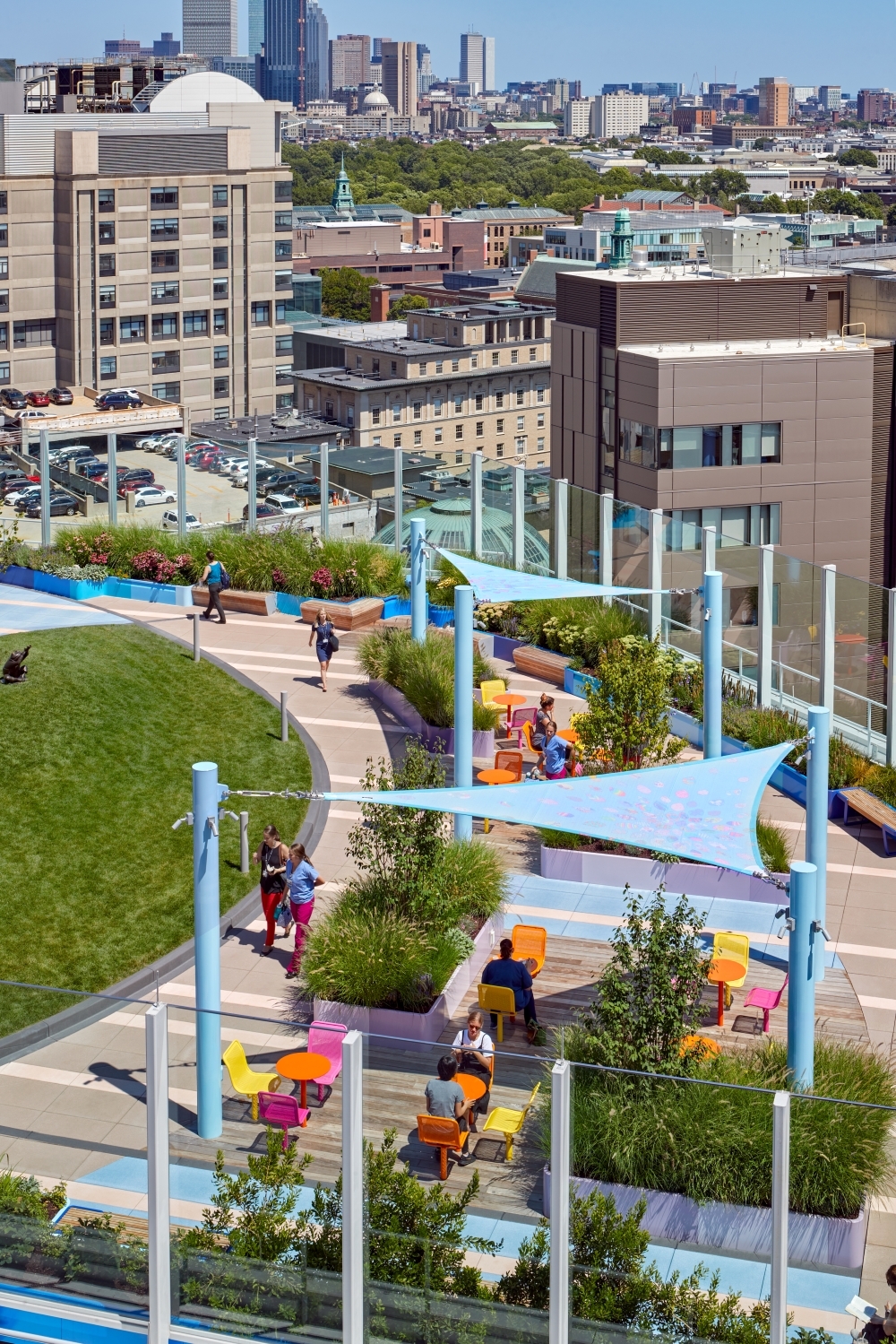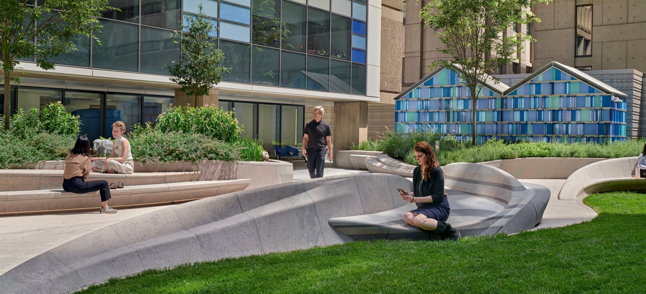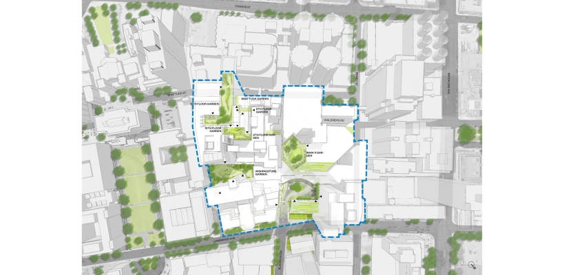 The BCH gardens are revolutionizing healthcare design through neuroinclusive spaces, weaving a narrative of healing across seven distinct levels. Natural elements ground the experience. Sculptural benches crafted from reclaimed site wood honor the site's history while creating intimate gathering spaces. Animal sculptures create moments of wonder – some reclaimed from the original hospital site, others newly crafted to reflect the diverse cultural backgrounds of patients. This dialogue between past and present, nature and architecture, creates personal connections to these healing spaces.