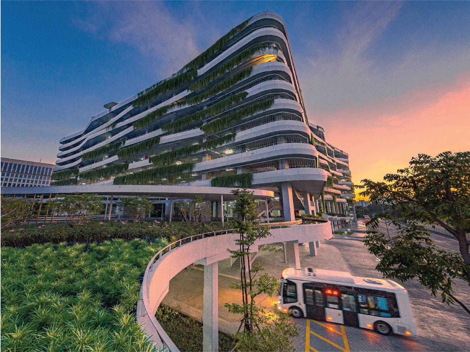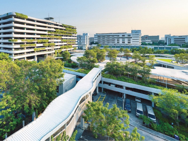 Sustainable features include vertical greeneries, rainwater catchbasins, rooftop solar panels that meet over half of energy needs, and use of recycled and locally-sourced materials all help contribute to the resiliency of the building.
