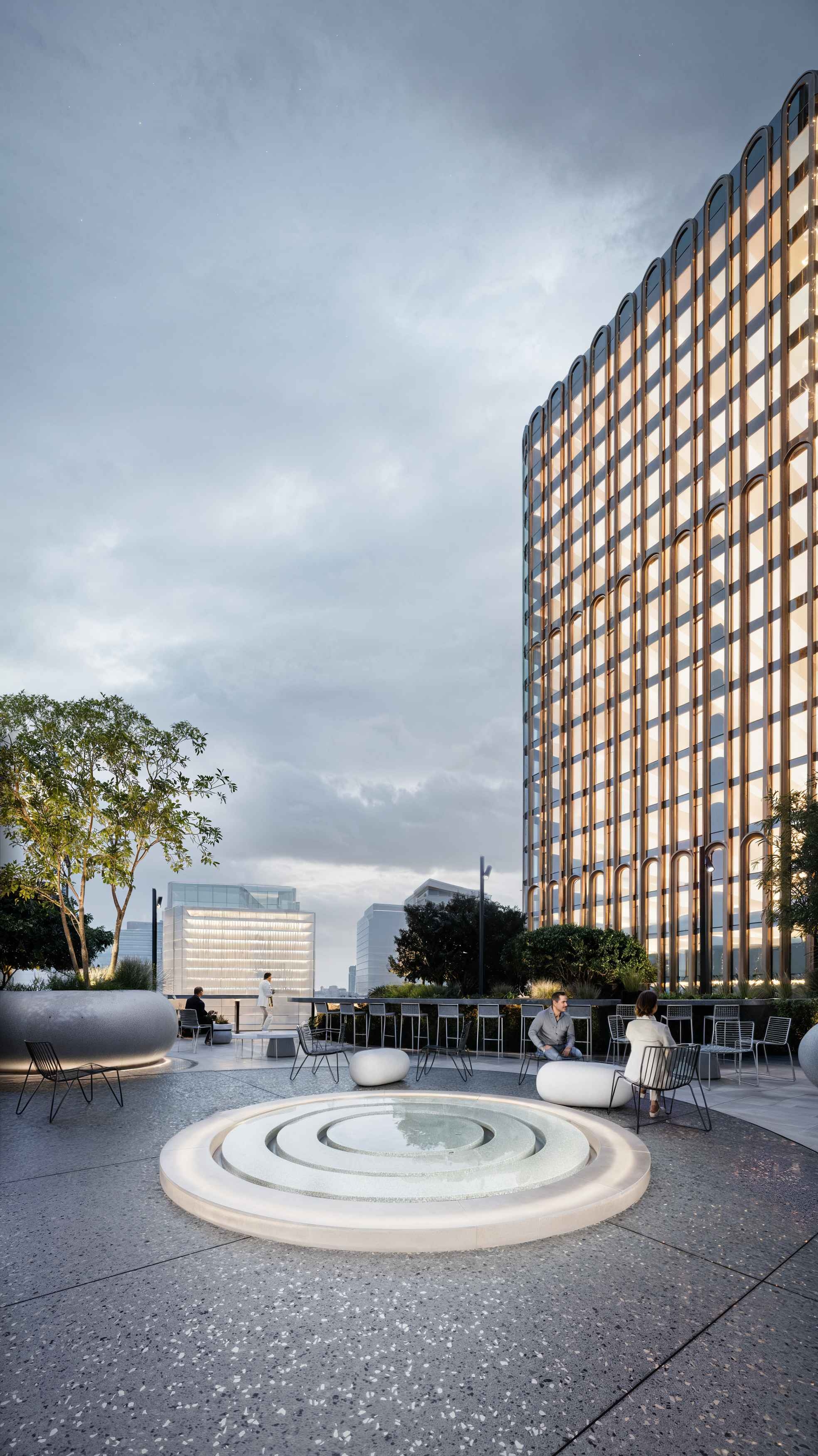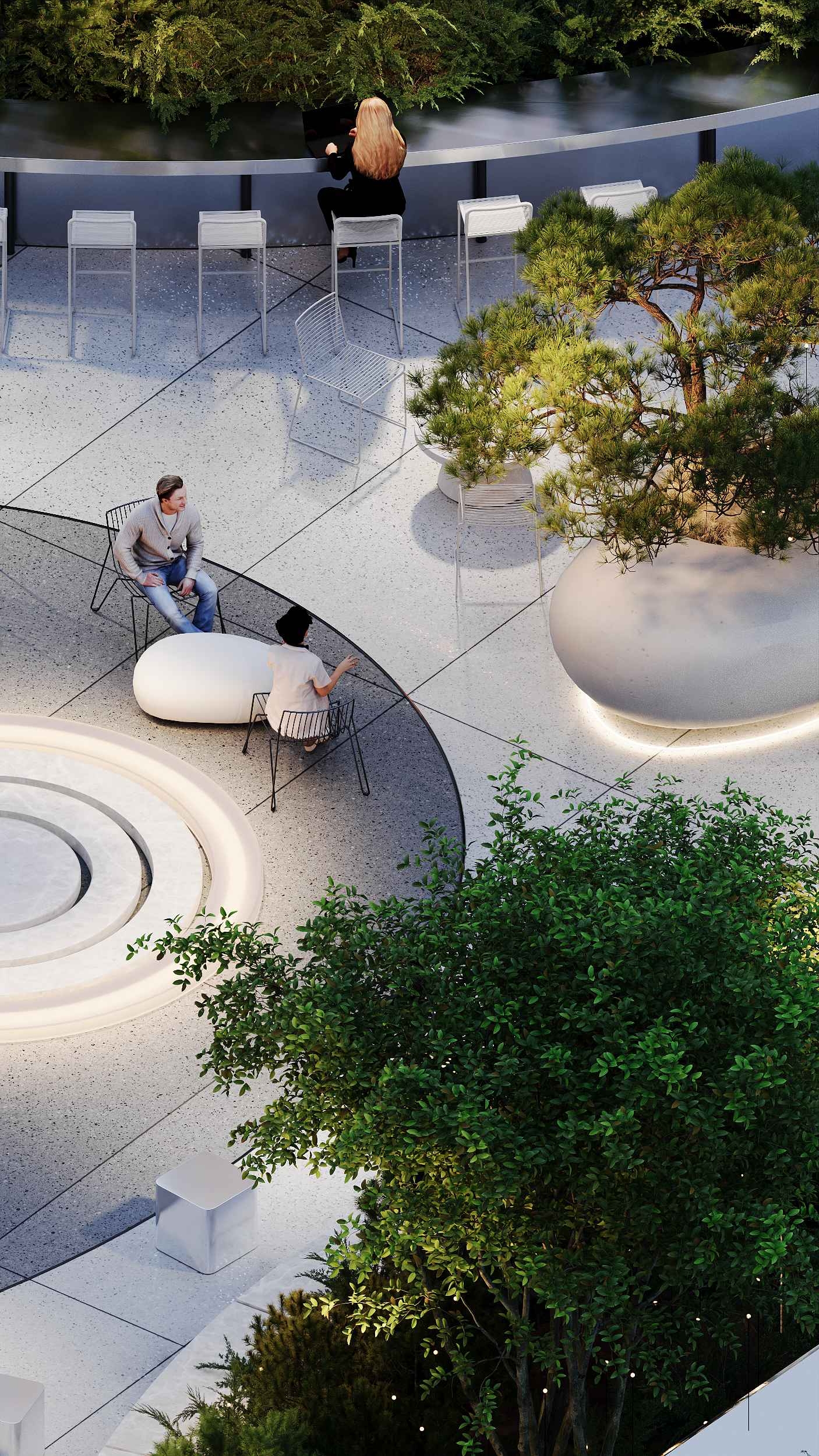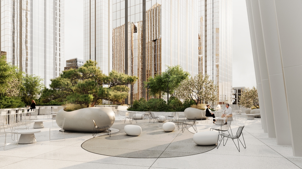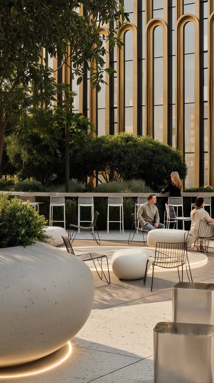 A canopy cafe hosts business breakfasts and outdoor work in any weather. The entrance features a sculptural stainless steel bench with a glowing "cloud-back". The terrace provides coworking spaces, quiet zones, and event areas with a graphic fountain.