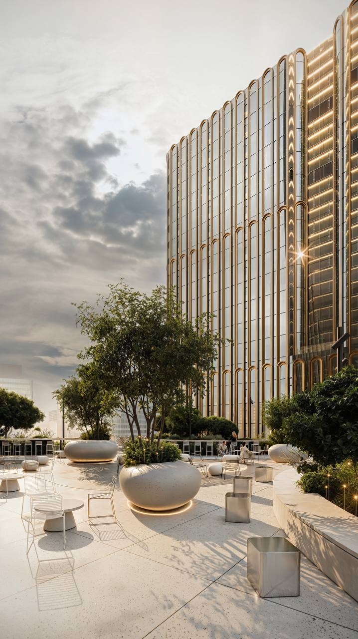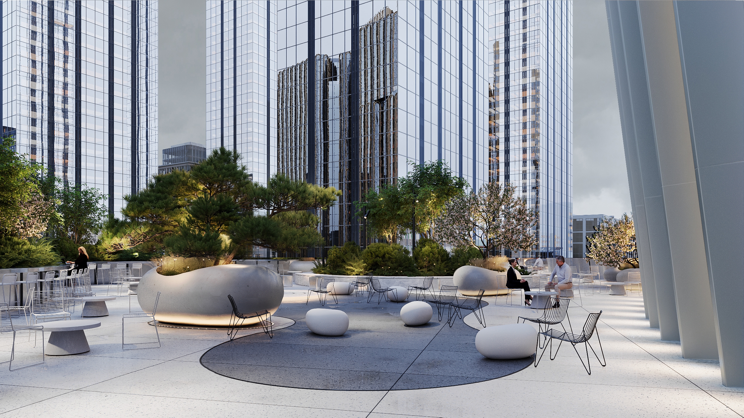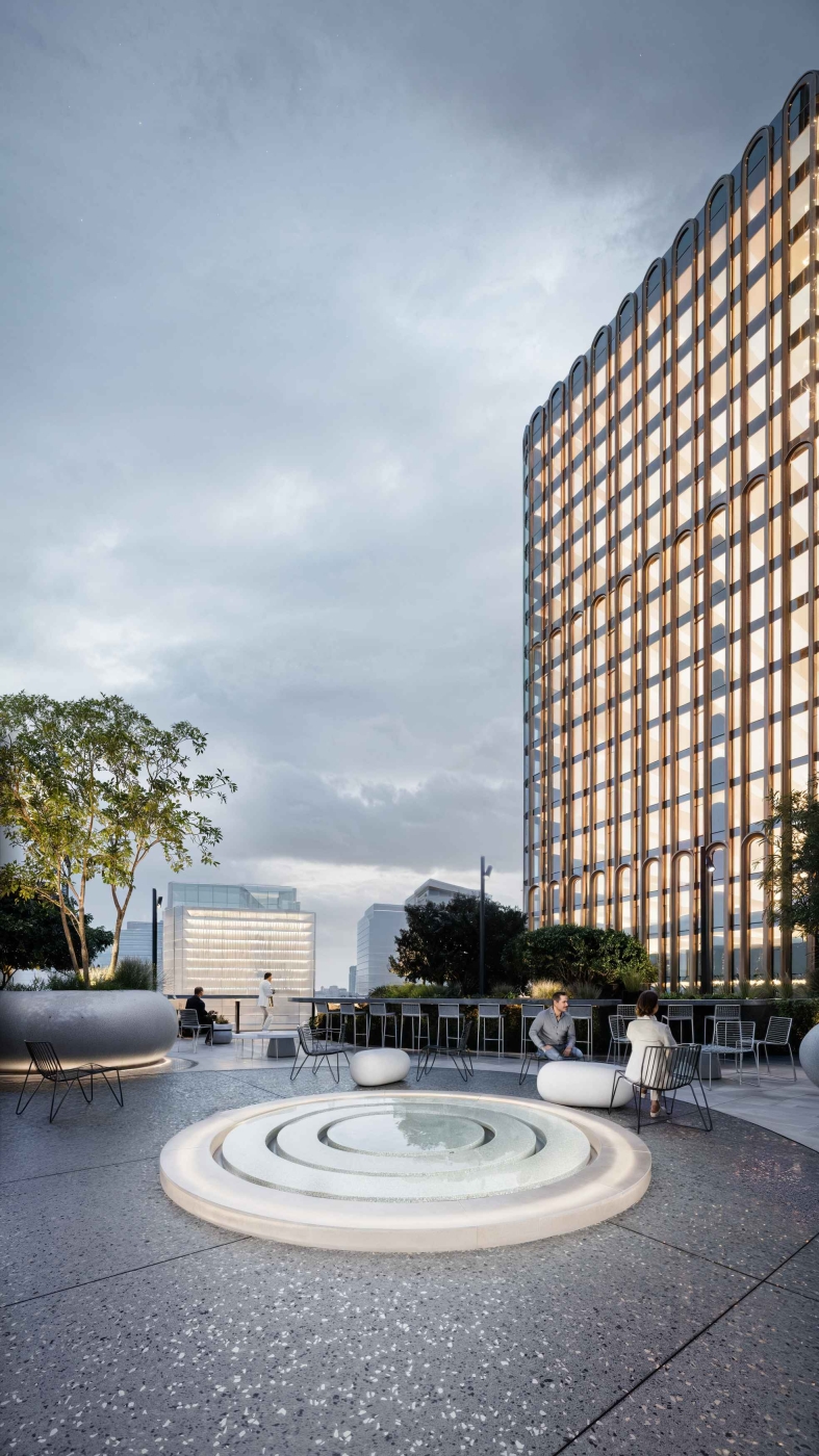 An urban garden beneath a portal's wing offers a breathing space in the rushing city. Under the business center's high canopy, strict architecture meets untamed nature. The courtyard integrates waiting areas, lounges, a bike park, and a smoking pavilion, unified by water features and soft evening lighting.