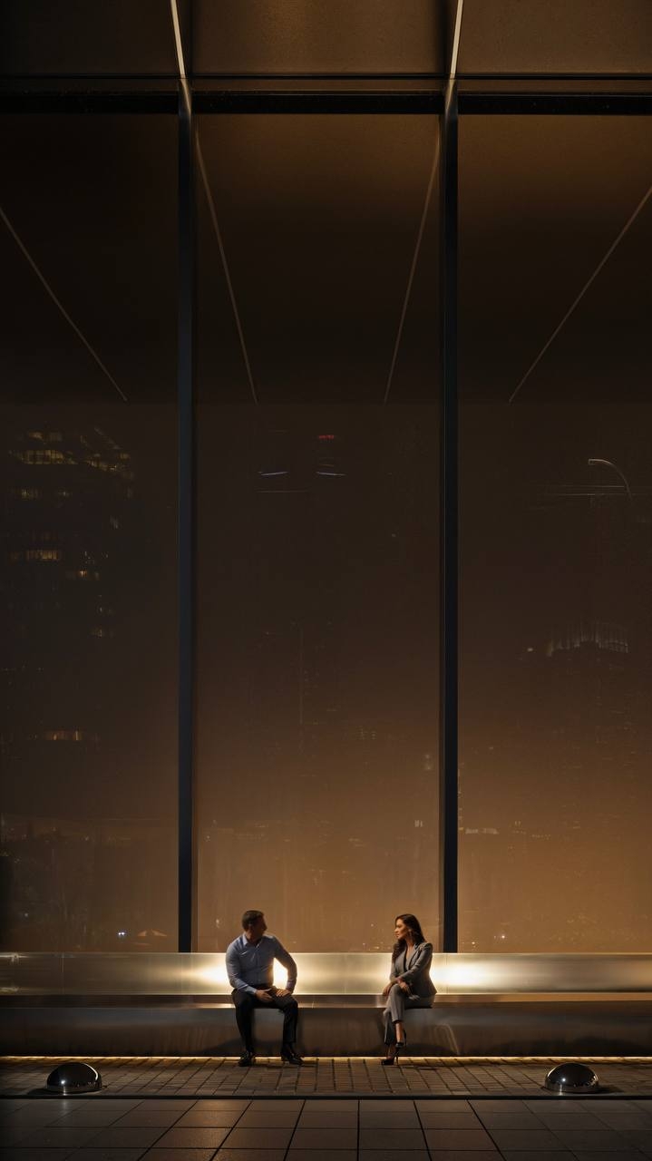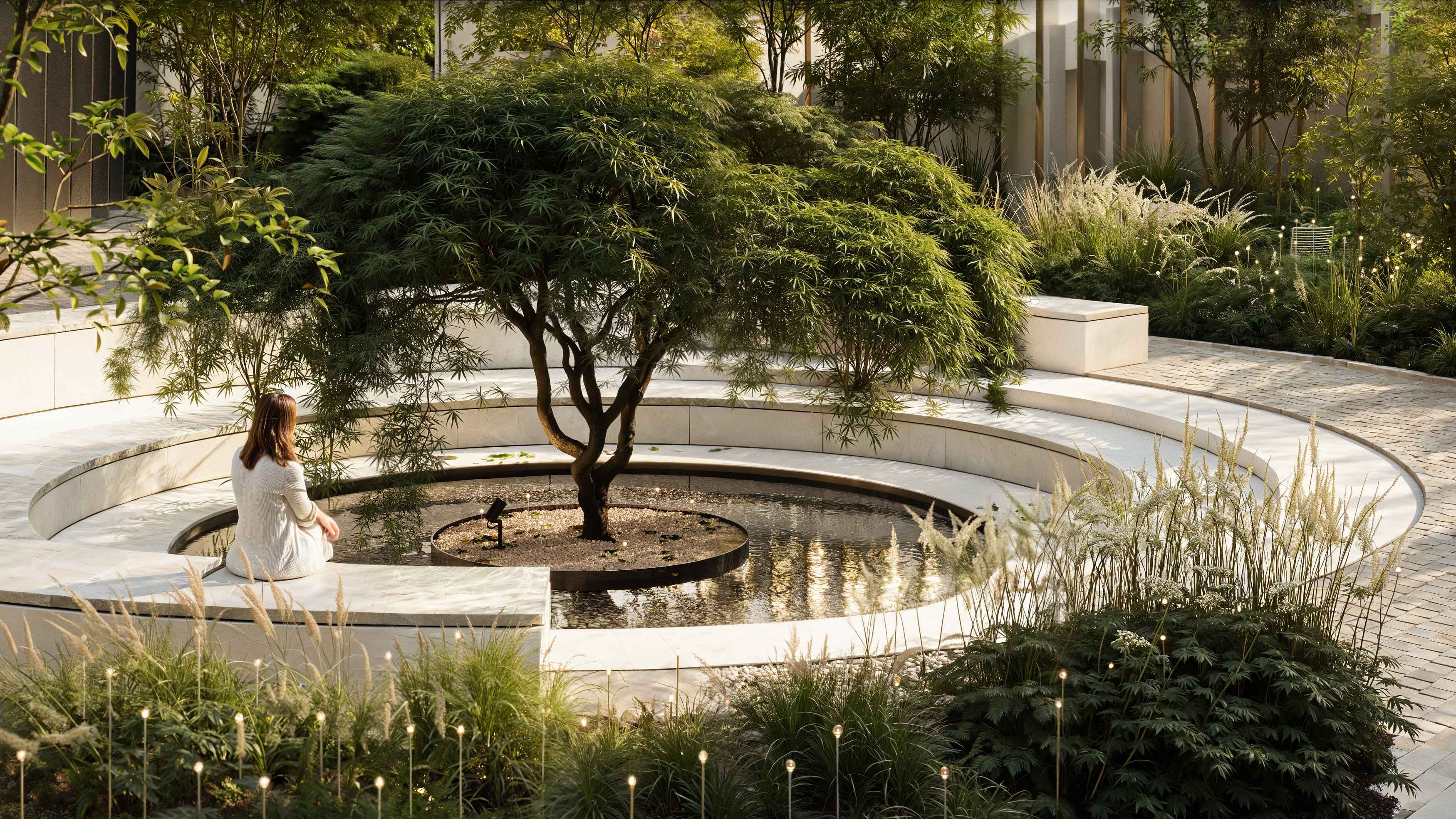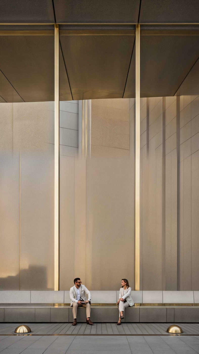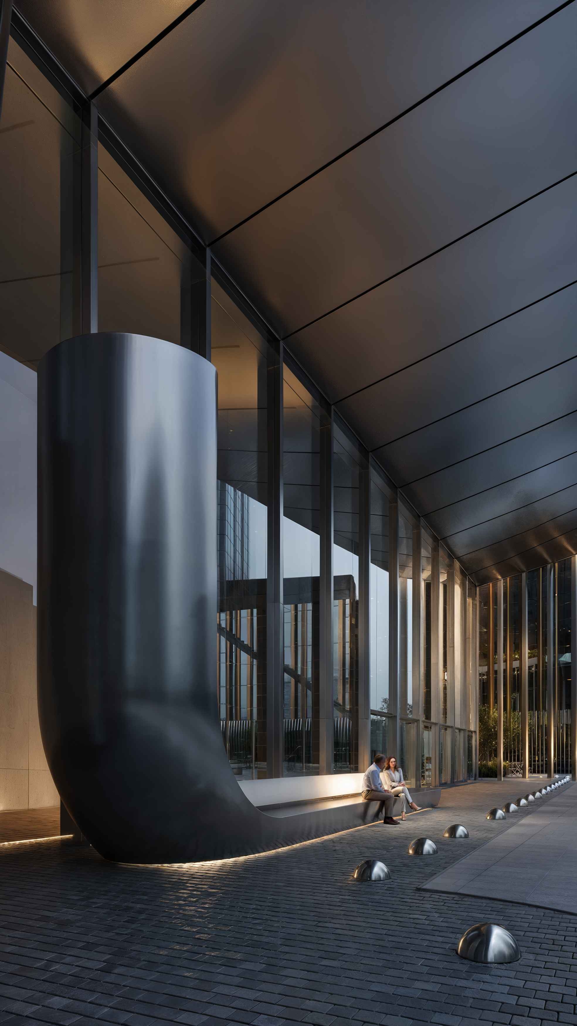 An urban garden beneath a portal's wing offers a breathing space in the rushing city. Under the business center's high canopy, strict architecture meets untamed nature. The courtyard integrates waiting areas, lounges, a bike park, and a smoking pavilion, unified by water features and soft evening lighting.