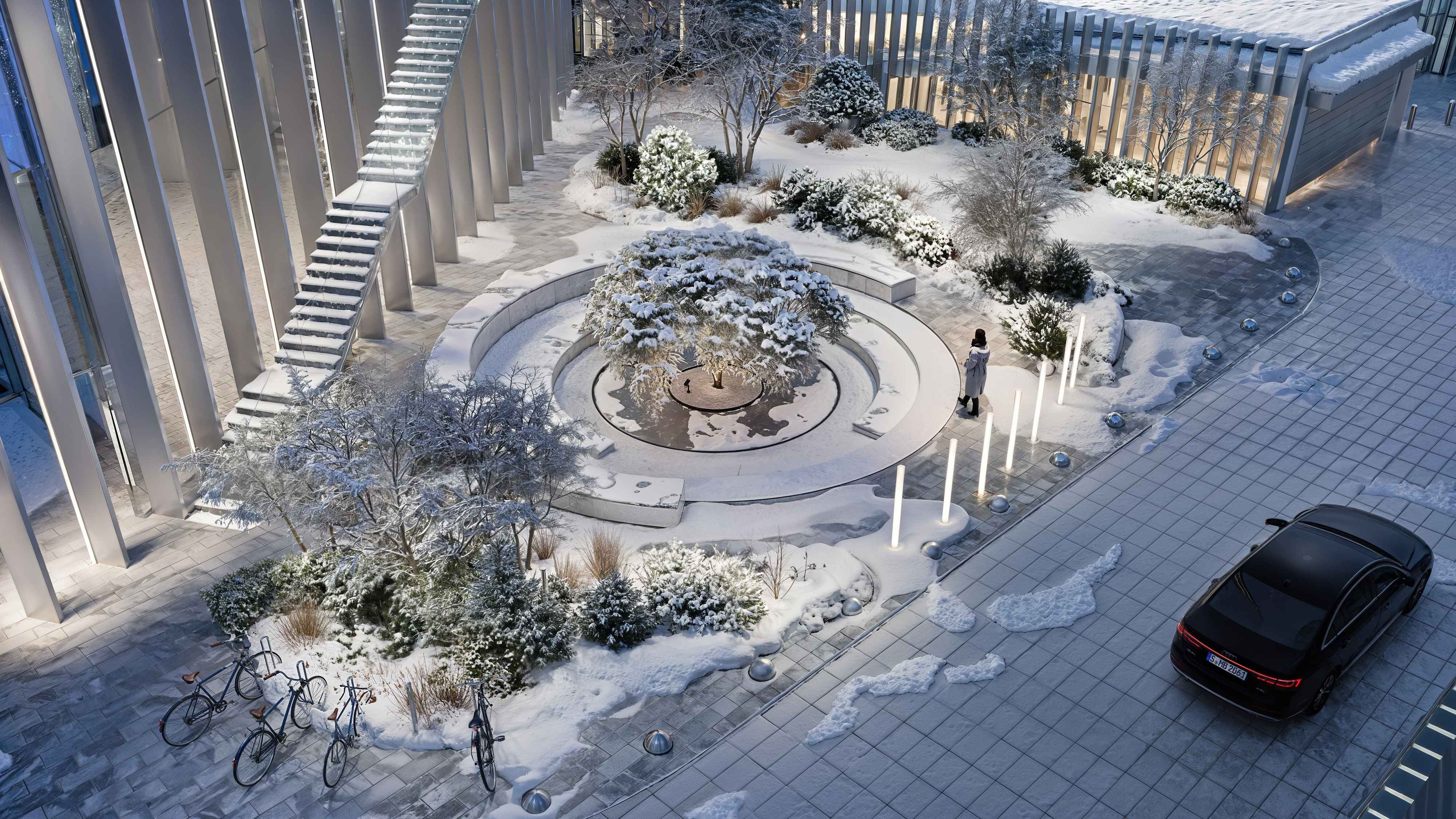 Durable materials like granite, steel, and glass in calm grays ensure longevity. Winter-ready with heated paving, smart drainage, and automated irrigation. Vertical lamelle fencing screens technical areas while complementing the facade. Lighting focuses on guidance with ceiling lines, edge lights, and safe markers.