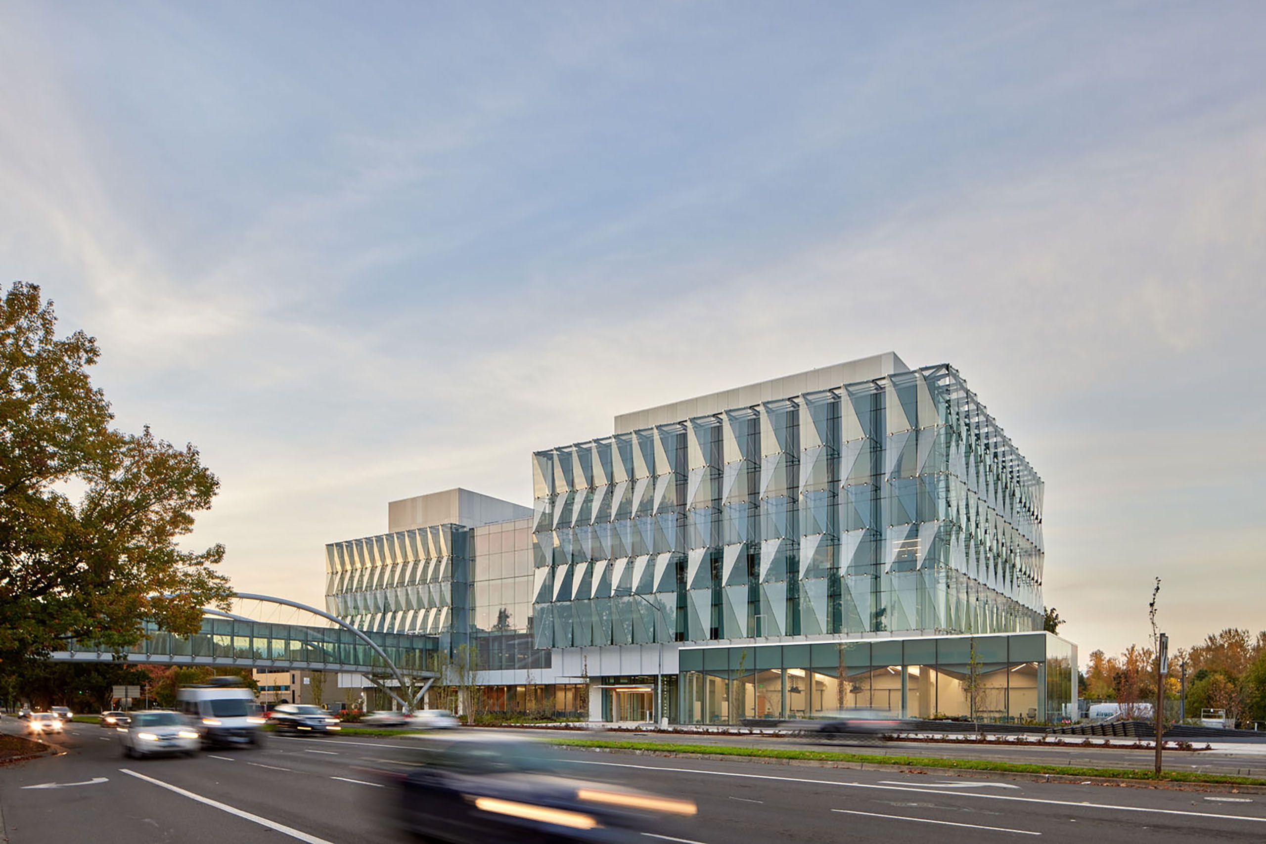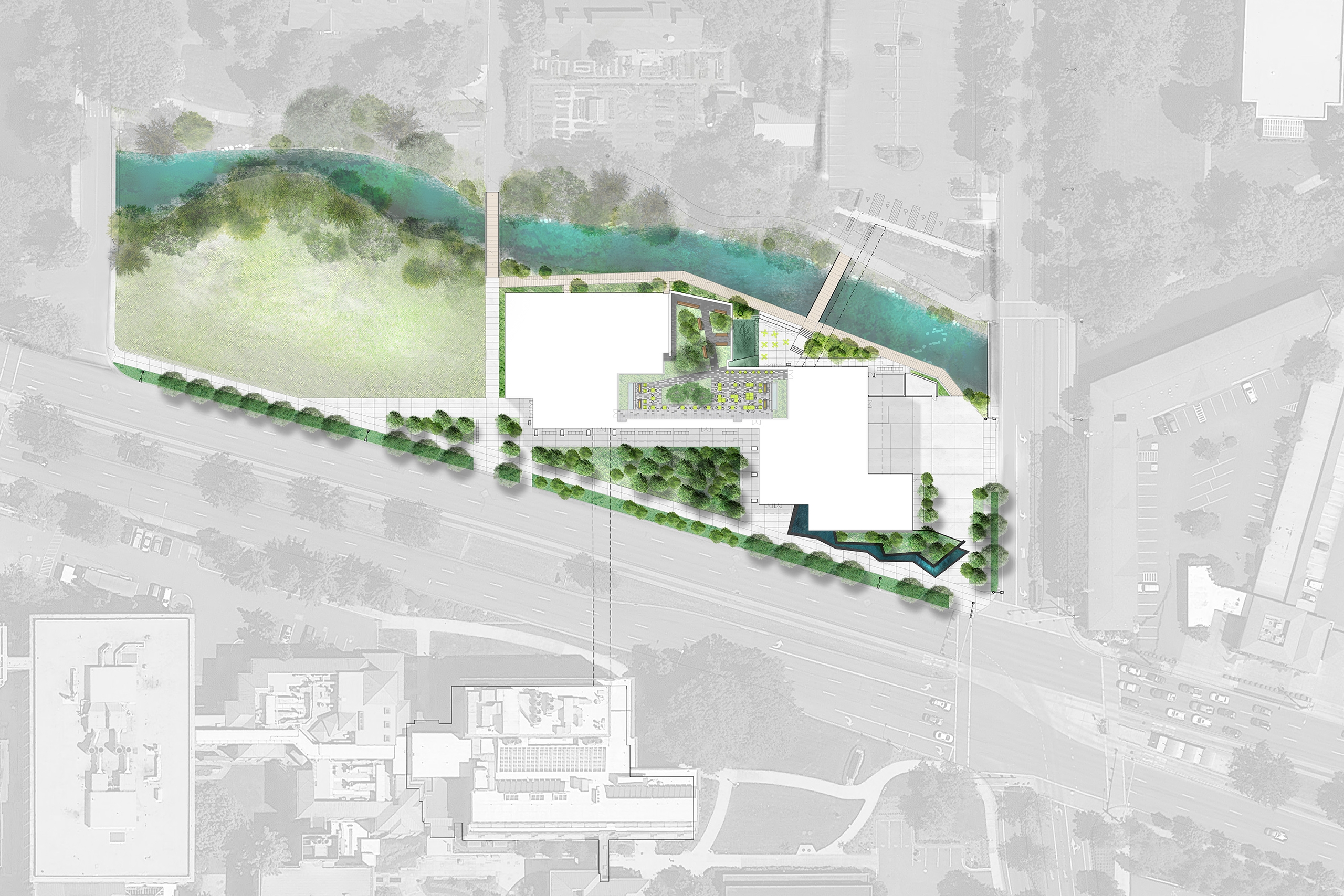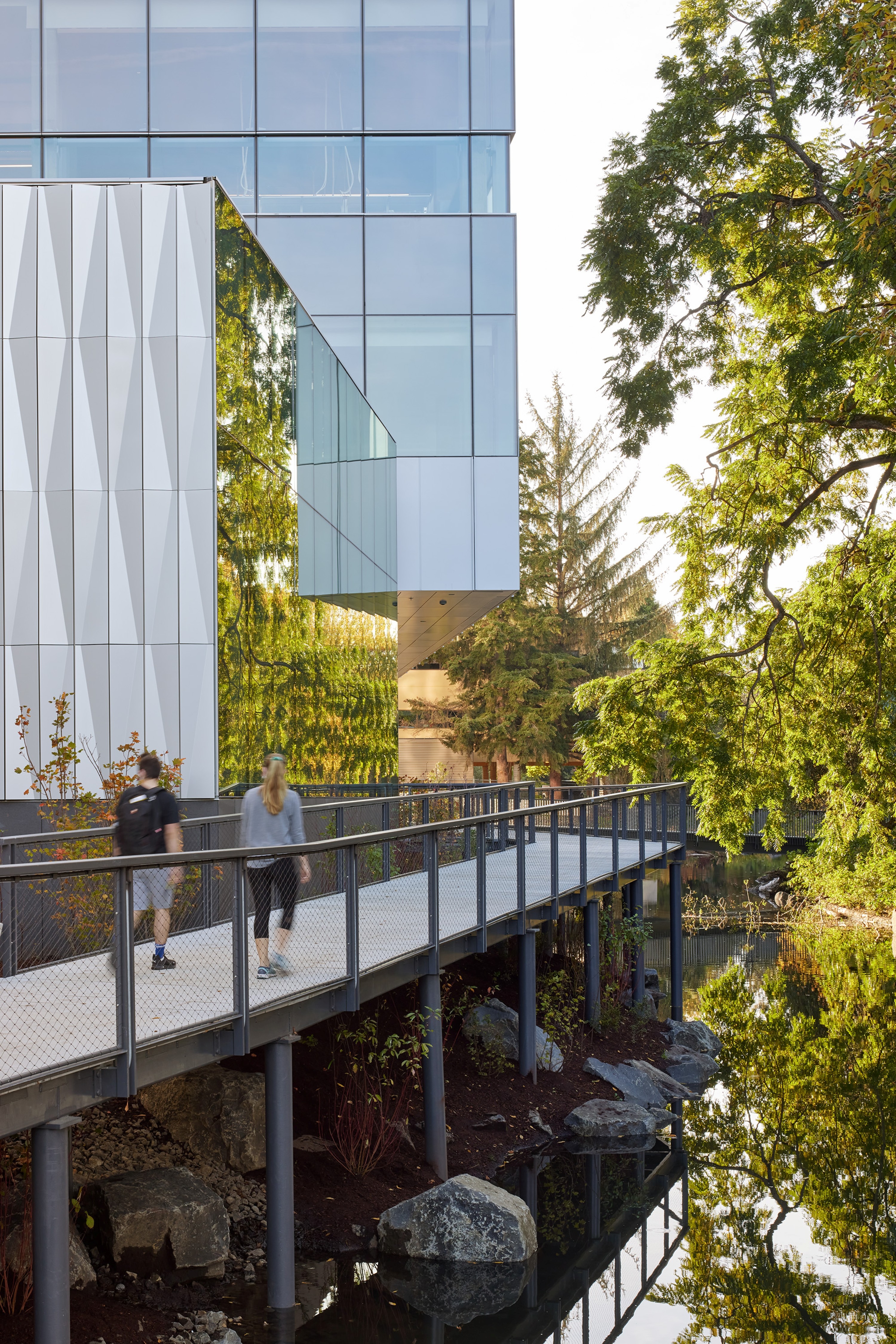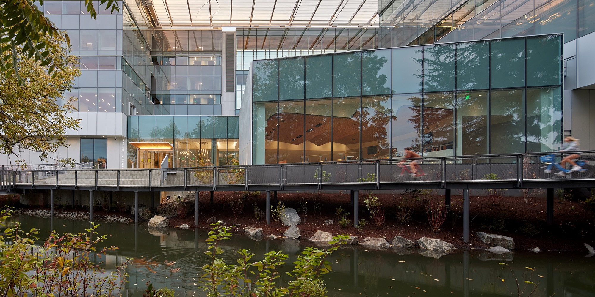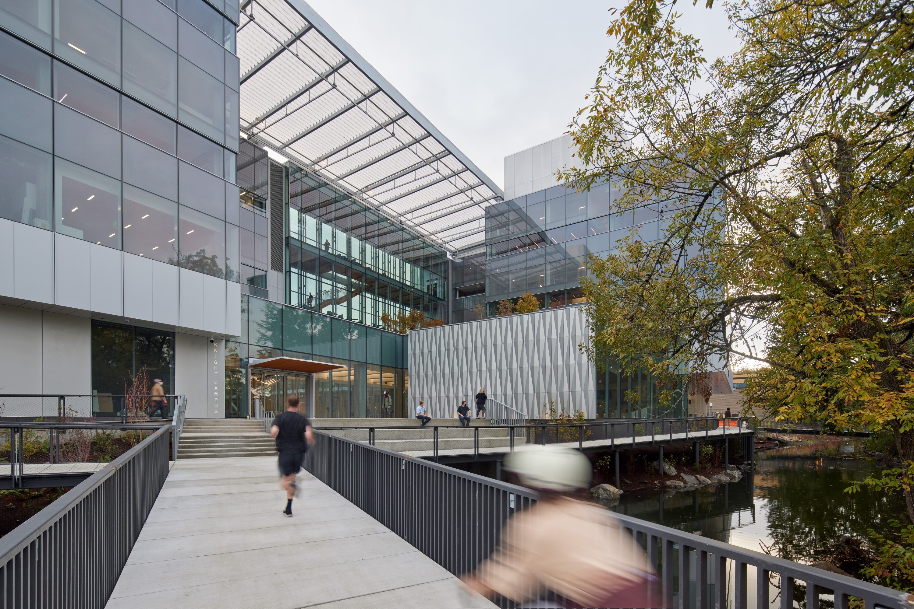 A landscape of discovery, the Knight Center for Accelerating Scientific Impact (KCASI) transforms the Millrace corridor into a living laboratory where innovation, ecology, and human curiosity converge. Positioned along the south bank of the restored Millrace, the landscape acts as a catalyst, supporting science, education, and entrepreneurship through a sequence of gathering spaces that rise from the water’s edge. The terraces stitch circulation, ecology, and campus life, forging a vital connection to the Willamette River. As a north campus catalyst, KCASI embodies resilience. Contaminated soils were dredged, steep banks laid back, and native vegetation restored to amplify habitat and water quality. Planting extends the riparian corridor, embracing the building with a lush green frame sheltering migratory birds and reflecting a deep ethic of stewardship. With the landscape as a sanctuary, discovery takes root in the land - a living framework for the pursuit of knowledge.