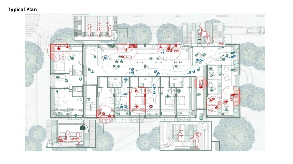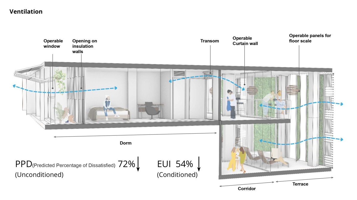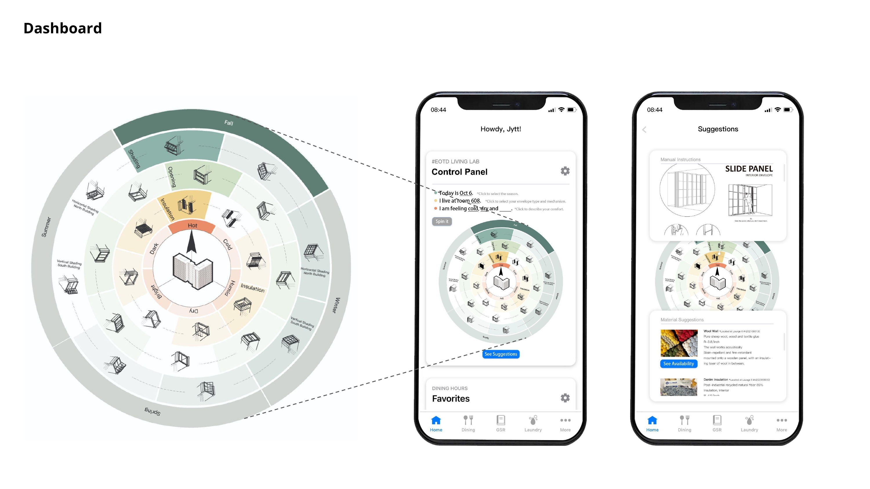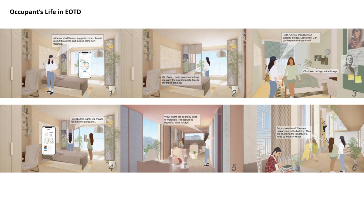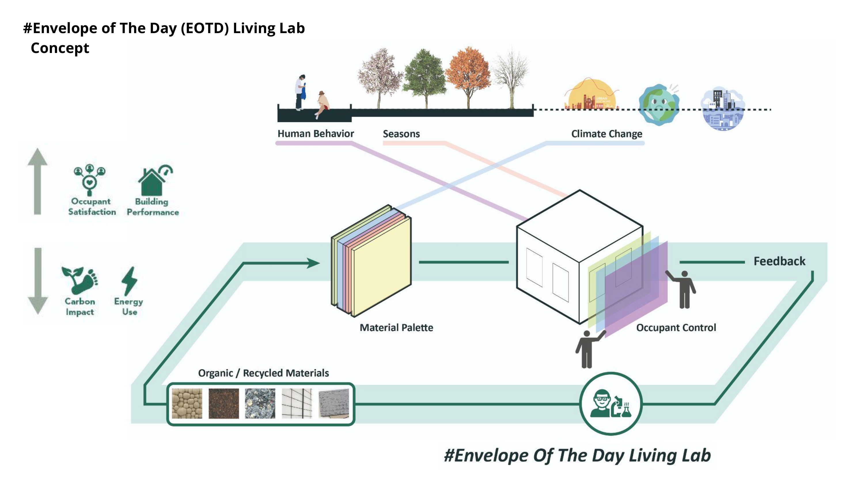 Climate change requires adaptable buildings with dynamic systems. The Envelope of The Day (EOTD) living lab enhances building adaptability, reduces carbon footprints, and prioritizes human-centric control using reusable or compostable materials. Located within an existing dorm building footprint, it includes organizational changes and new programs. The first two floors house a research lab, dining hall, seminar rooms, and offices, while upper floors feature apartments, lounges, study pods, and terraces. These additions improve the student experience and enable testing of diverse spaces for the living lab. Lounges double as a "material wardrobe" for the building. A dorm mobile app integrates a user interface, providing each occupant with a control panel to manage their envelope based on comfort needs. The panel offers suggestions on envelope operation, material changes, placement, and availability, while collecting user feedback for researchers to evaluate envelope performance and identify improvements.