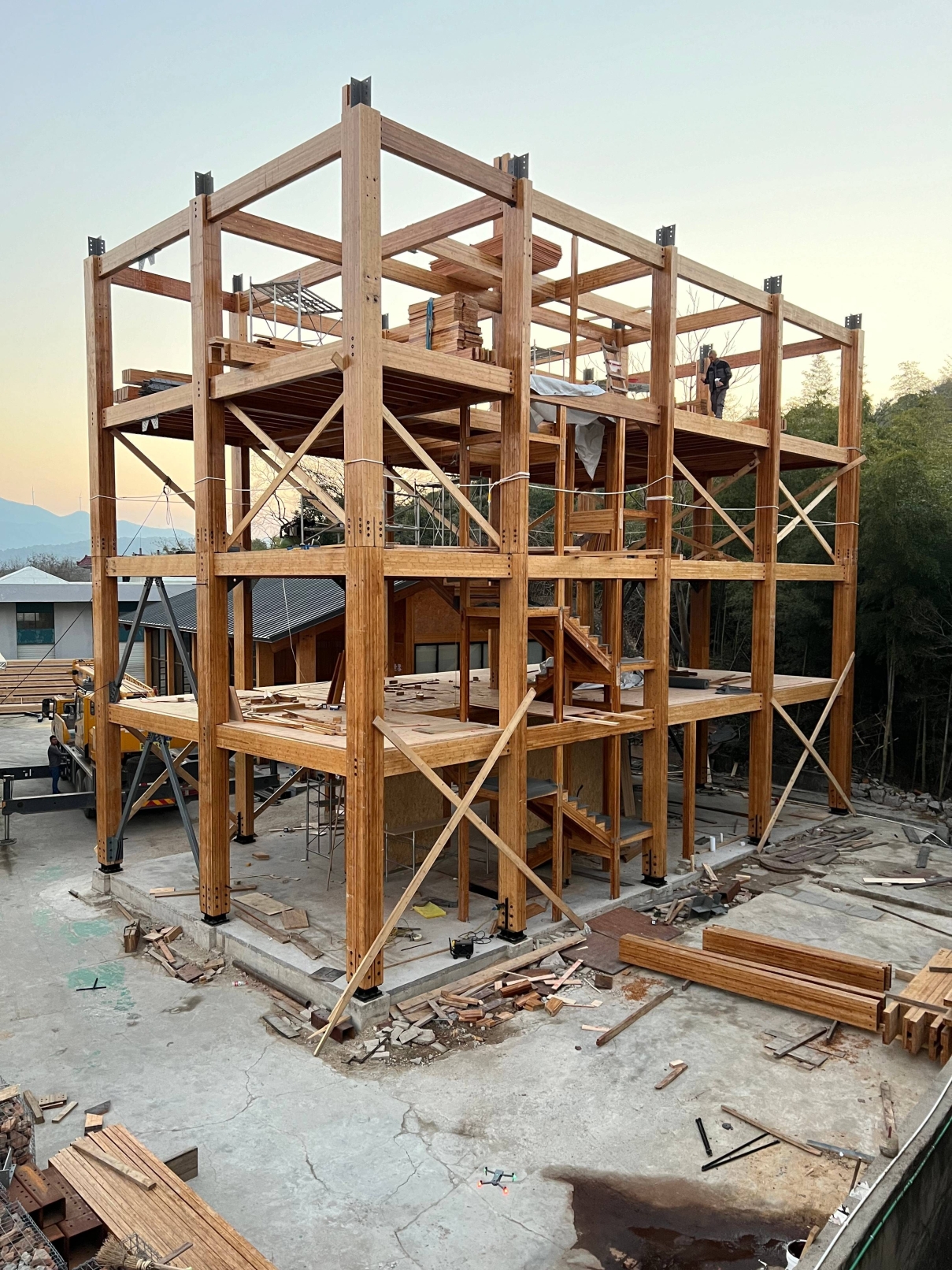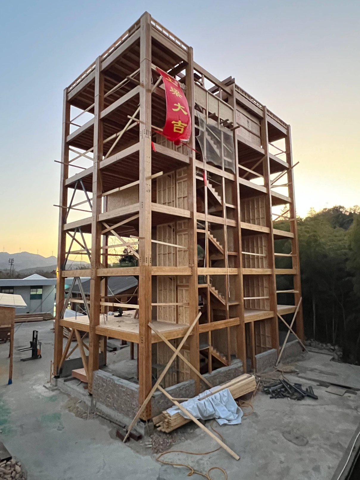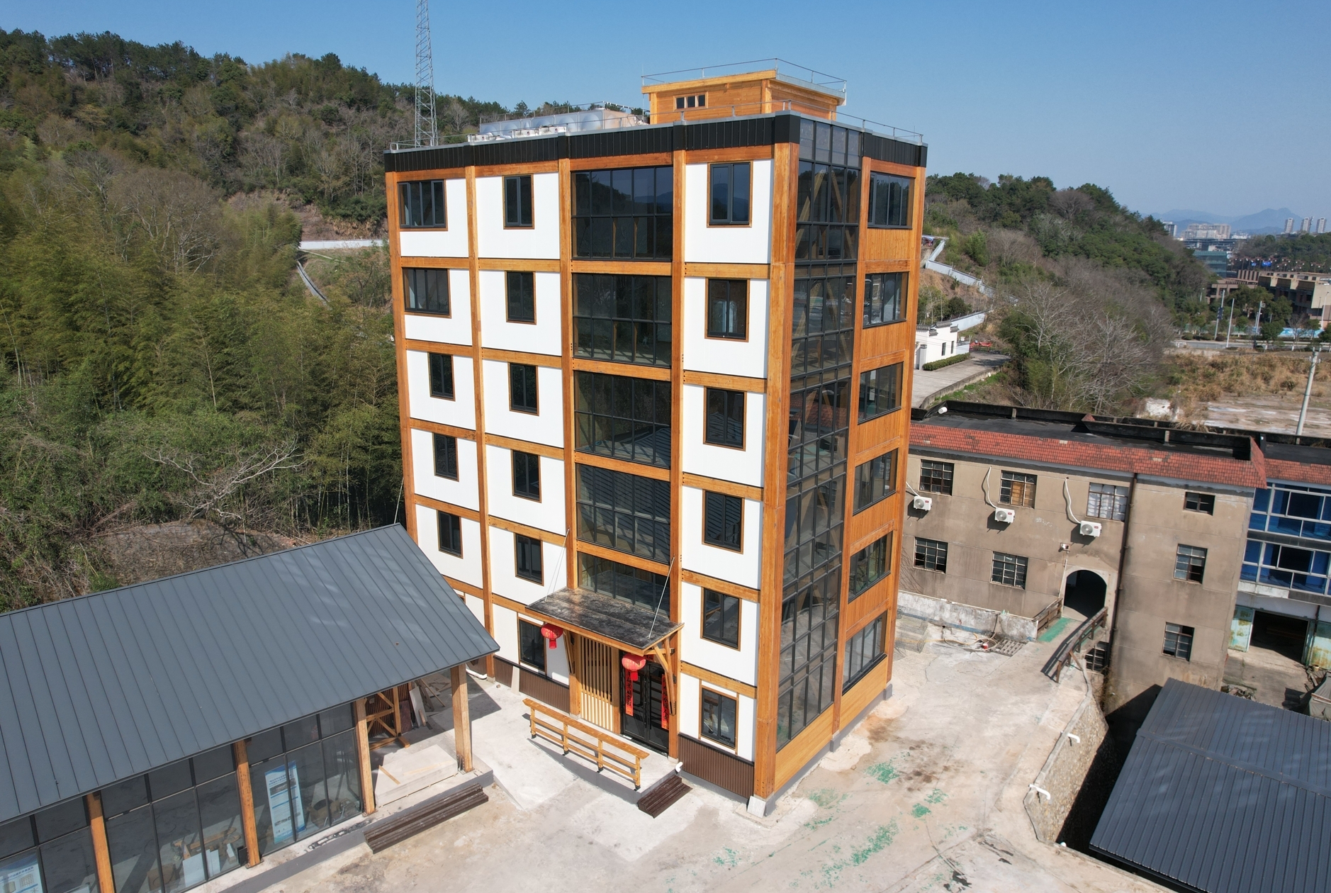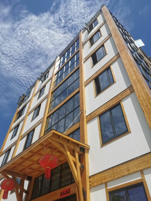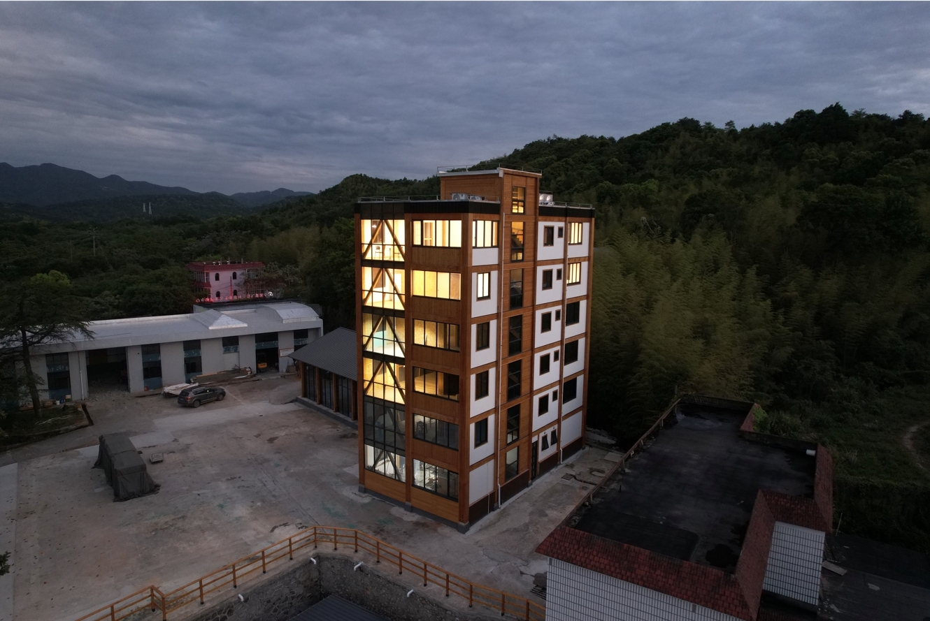 The Ninghai Bamboo Tower is the world's first 7-story (6 main stories and an attic) engineered mass bamboo building (6 main stories and an attic), setting a new standard for green architecture, sustainability, and mixed-use design. At 20.3 meters tall, it integrates bamboo frames, CLBT floors, and metal connectors, ensuring seismic resilience and efficiency. Analysis reveals that its carbon emissions during. Its prefabricated modular approach minimizes construction waste and carbon footprint. The tower serves as an educational hub, demonstrating bio-based materials as a viable alternative to conventional steel and concrete for buildings.