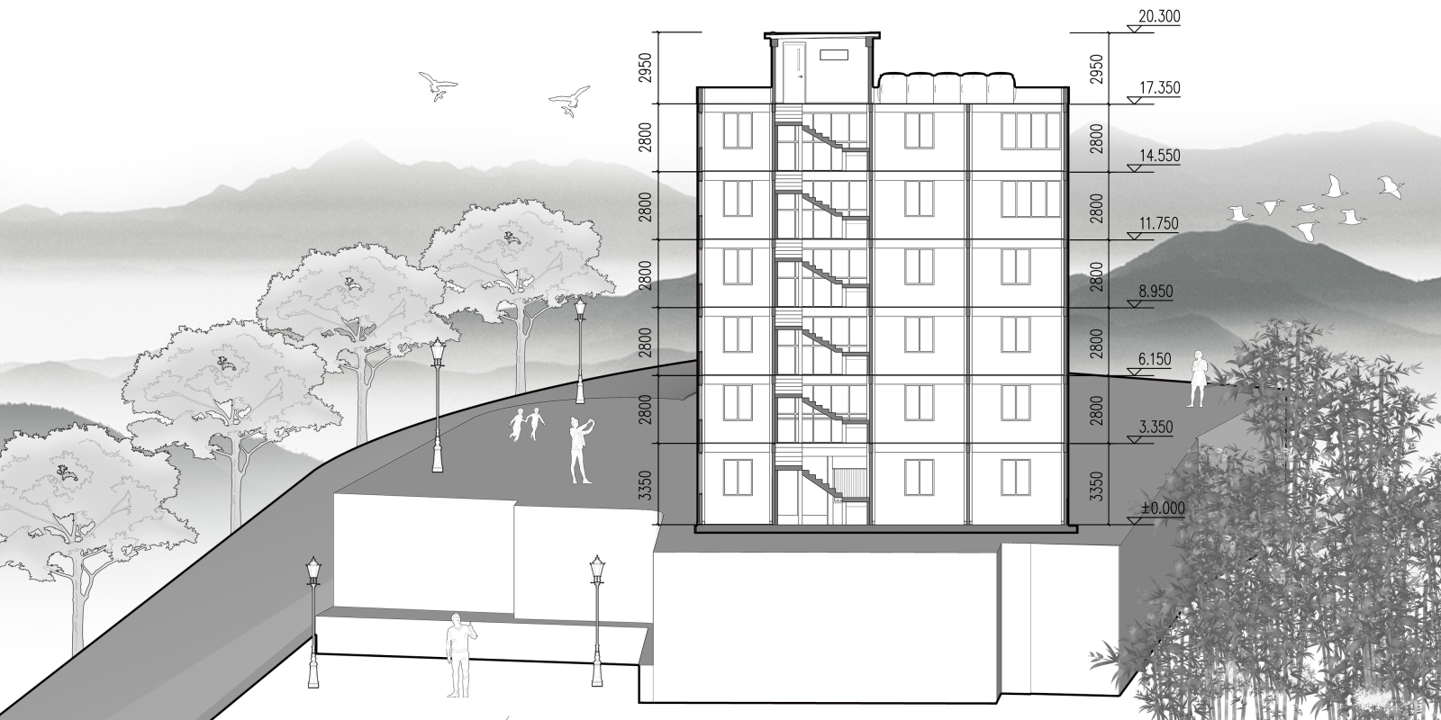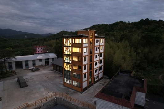 The Ninghai Bamboo Tower merges high-performance green architecture with educational and workplace functionality. Dynamic testing using sensors confirmed the loading safety. A hybrid ventilation system and solar integration will enhance energy efficiency, while recycled bricks and bamboo-based components reduce environmental impact. Its landscape integration, with native plants and permeable surfaces, revitalizes the site, transforming an abandoned industrial area into a vibrant educational, workplace, and large-scale sustainable landscape project.
