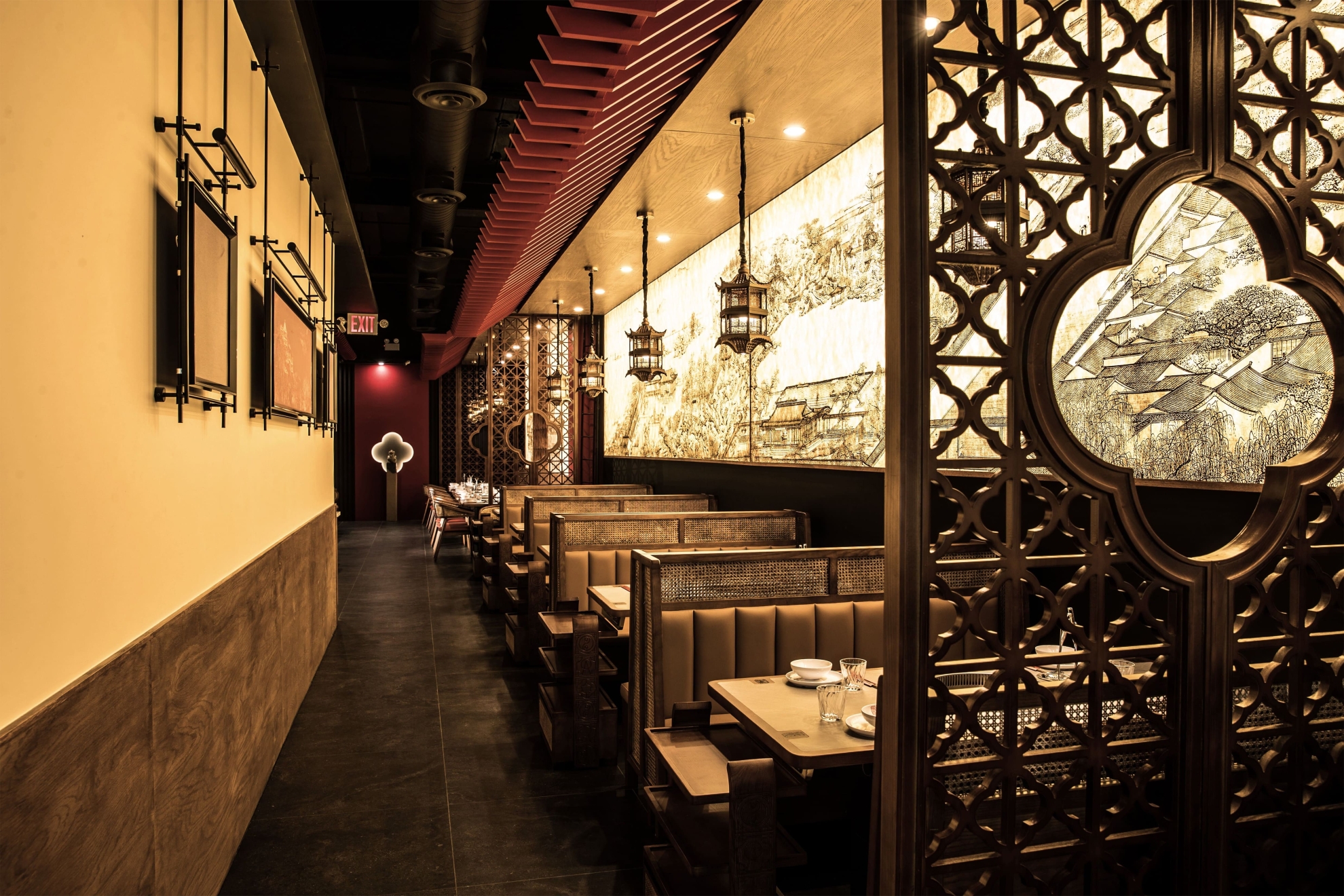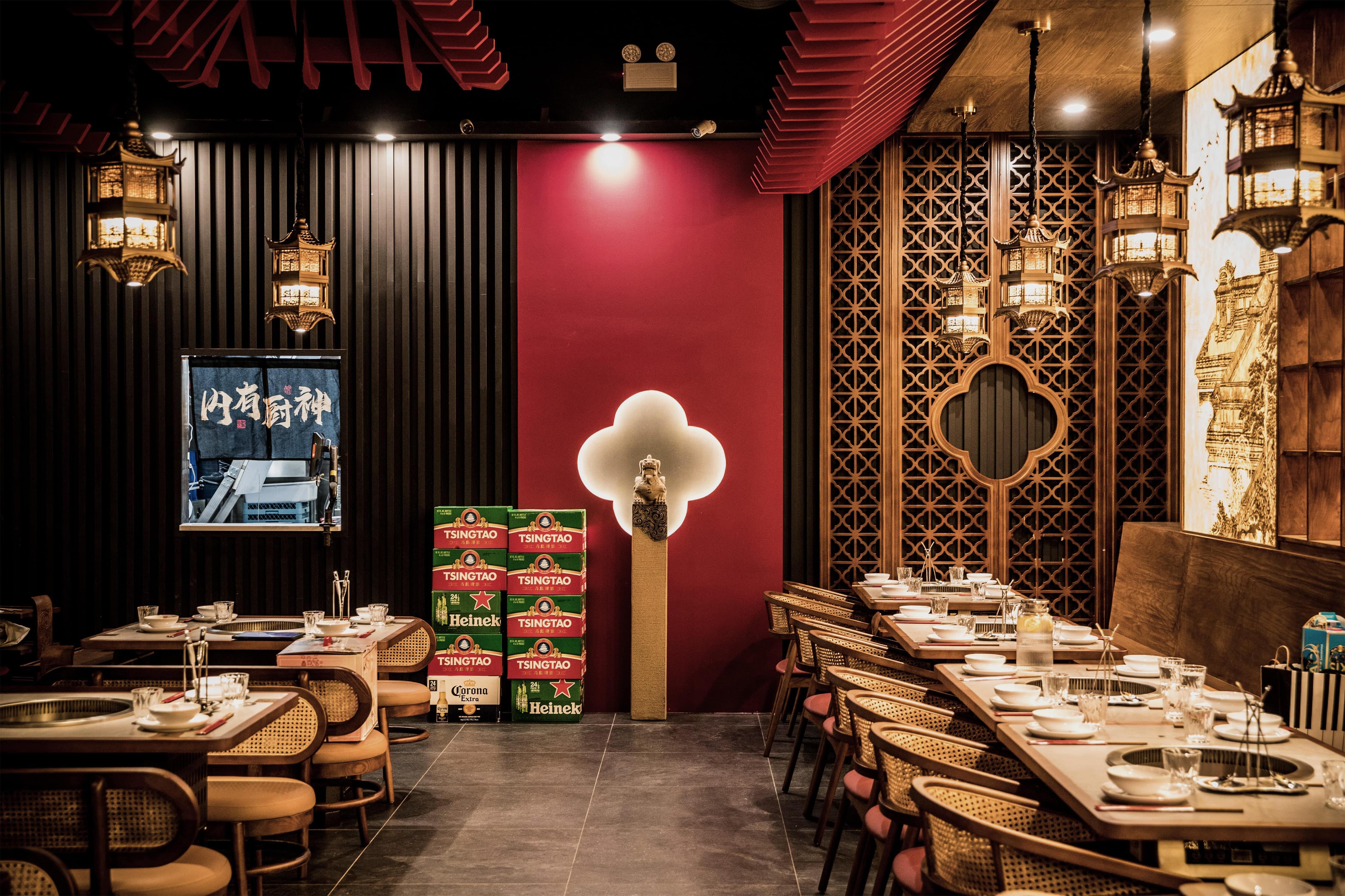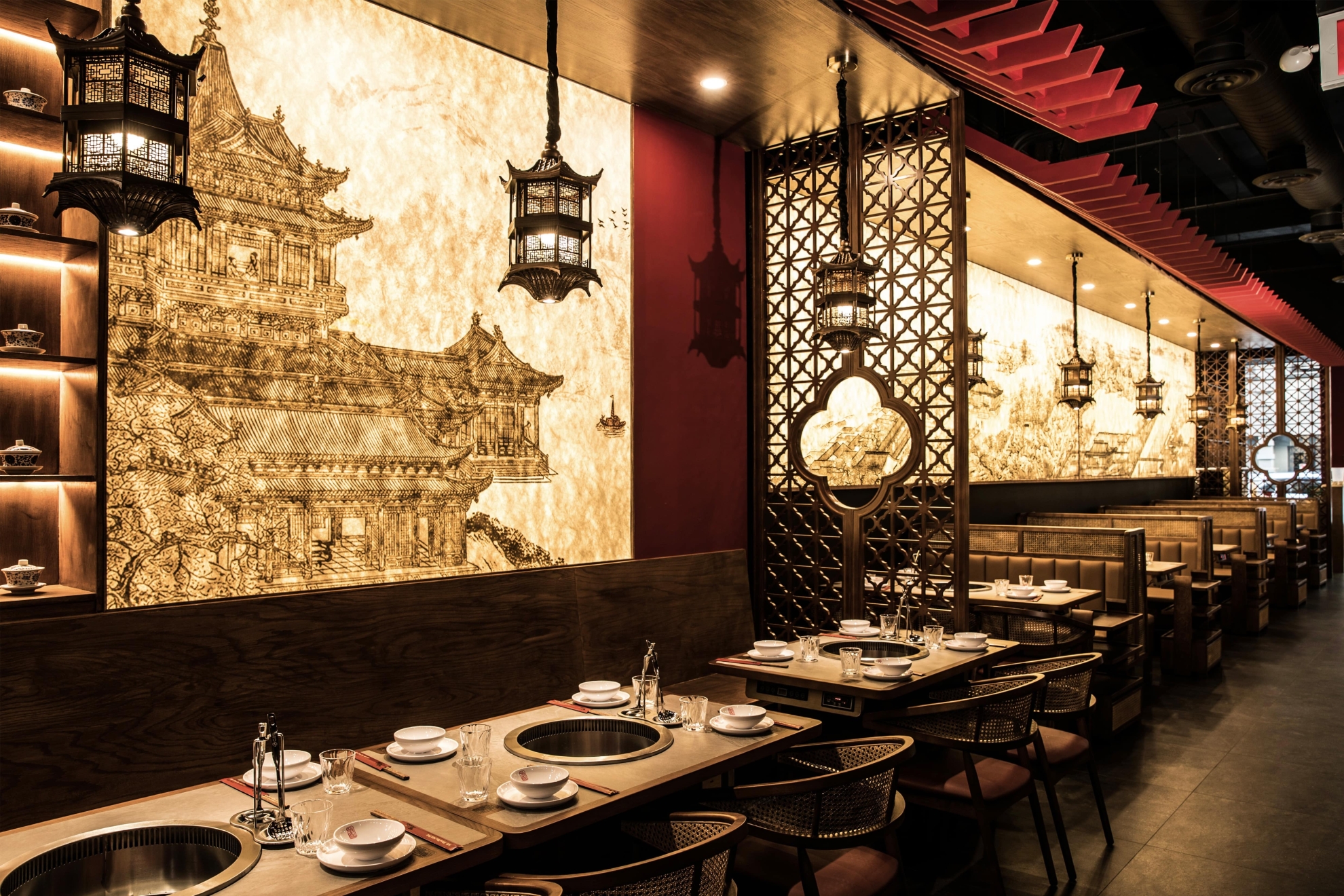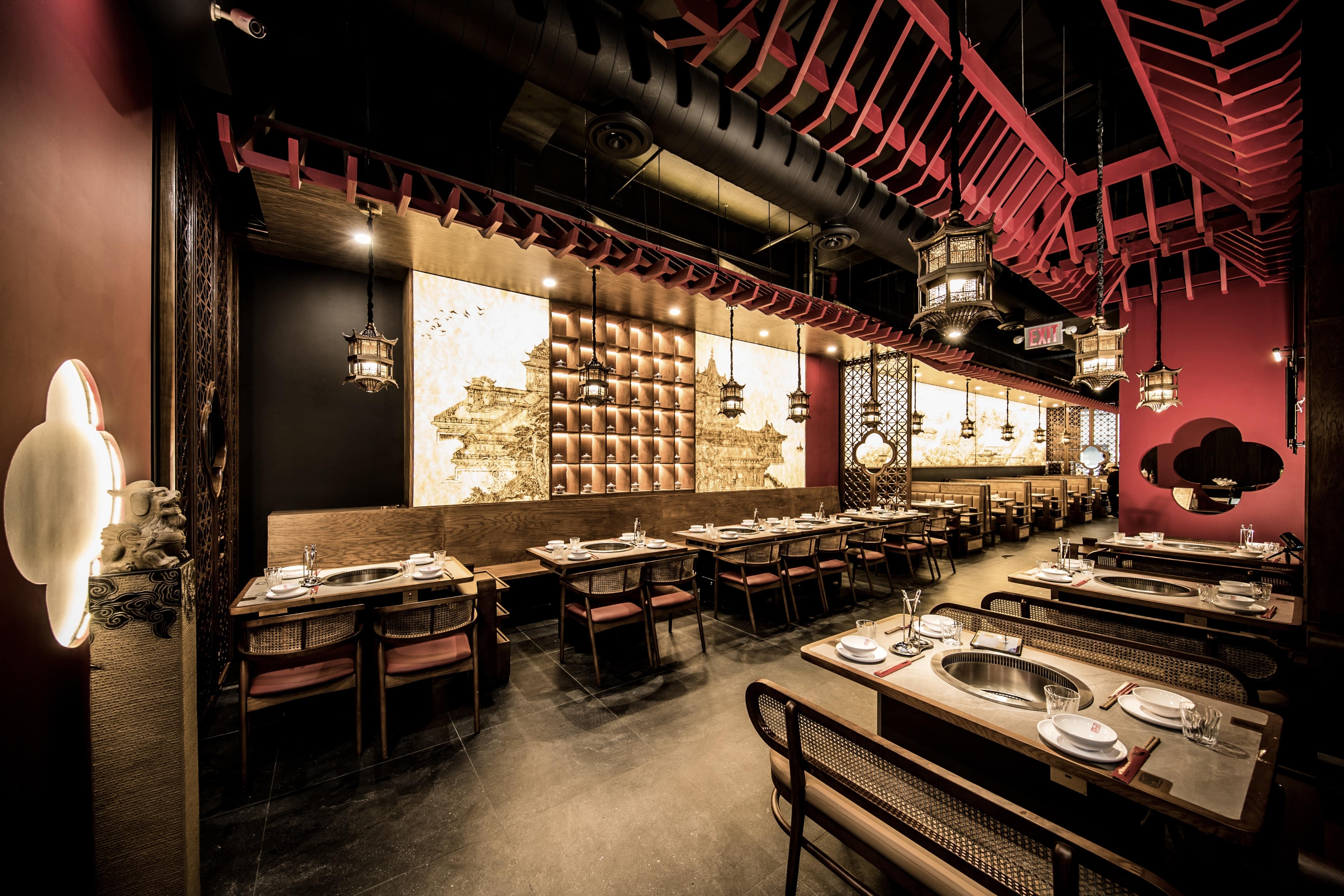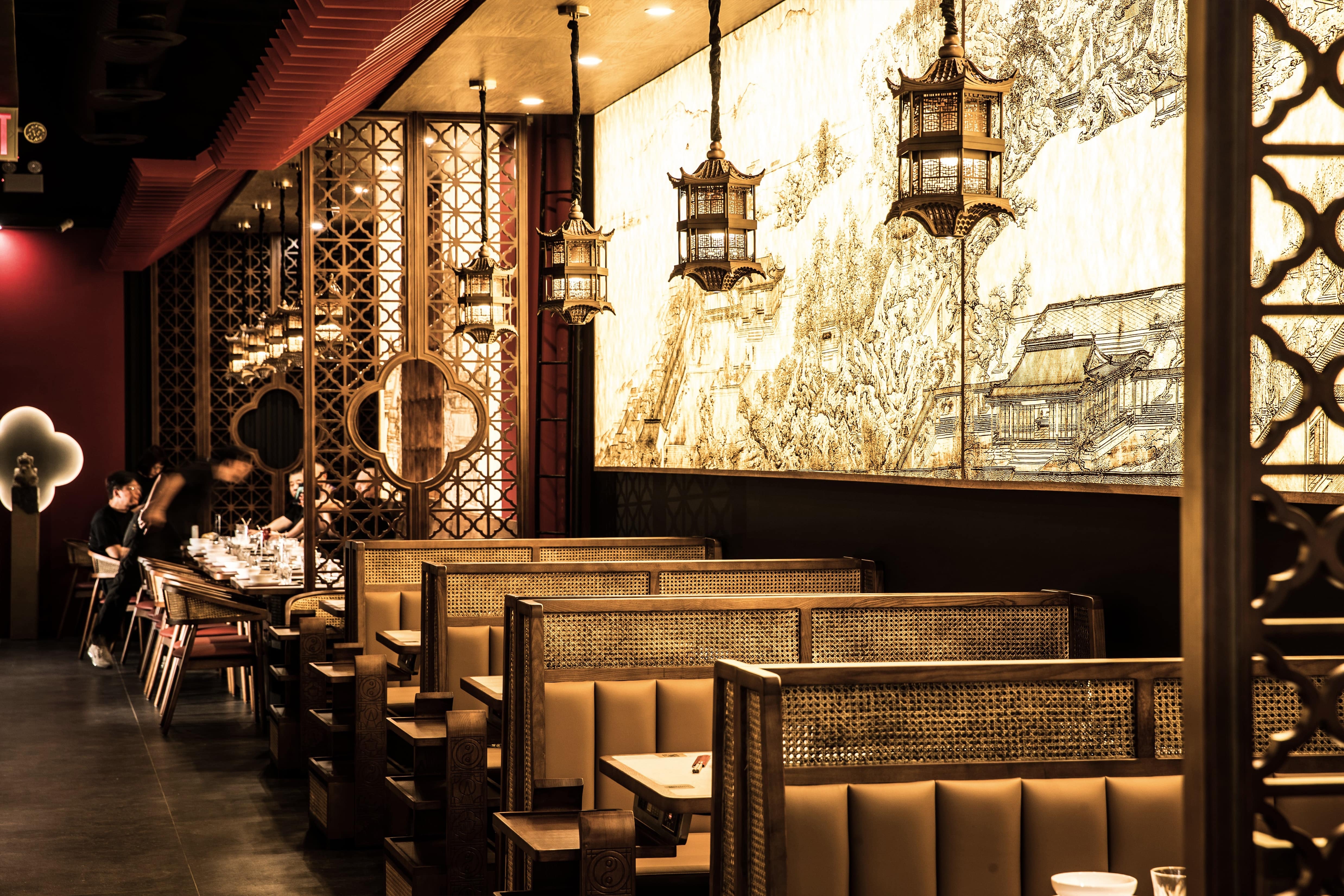 Located in Midtown Manhattan near the vibrant K-Town district, this 1,442 sq ft contemporary hotpot restaurant draws inspiration from Sichuan’s mountainous landscapes and the refined elegance of traditional Chinese architecture.The spatial narrative evokes a symbolic mountain climb, guiding guests toward a pavilion-like peak with panoramic views. A palette of cinnabar red, natural wood, and woven rattan—balanced with matte black—bridges traditional warmth with a contemporary edge. Custom wooden lattice screens define intimate booths and communal tables, while pagoda-roof pendant lights reinterpret traditional eaves. Suspended red ridges overhead recall ancient rooflines, extending visual height and selectively lowering areas to create intimacy.A backlit DuPont paper mural depicting Sichuan palatial architecture casts a golden glow, with warm lighting focused on each table to emphasize the ritual of hotpot dining. Concealed illumination highlights architectural details and textures, allowing traditional aesthetics to transcend nostalgia and radiate with contemporary vitality.