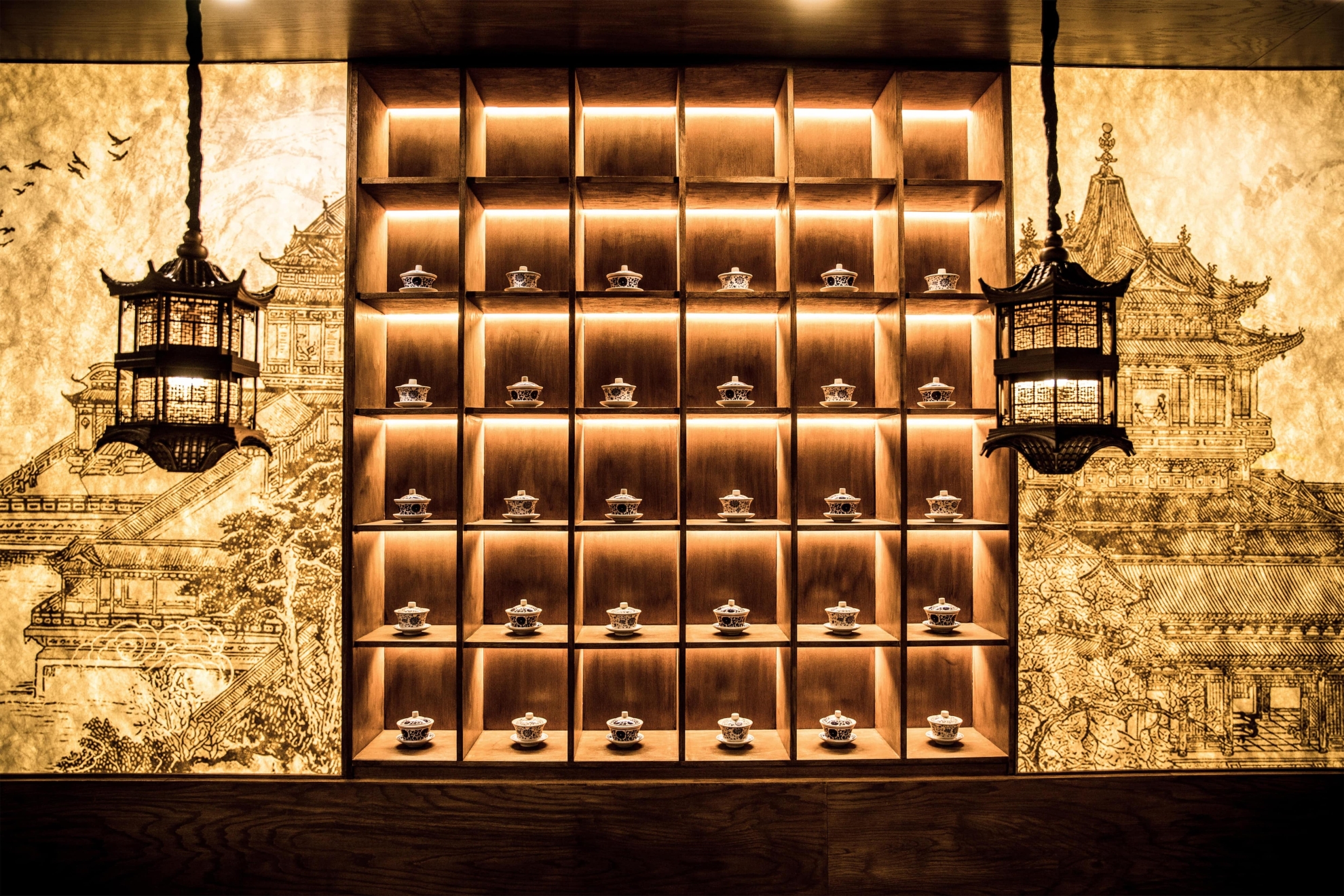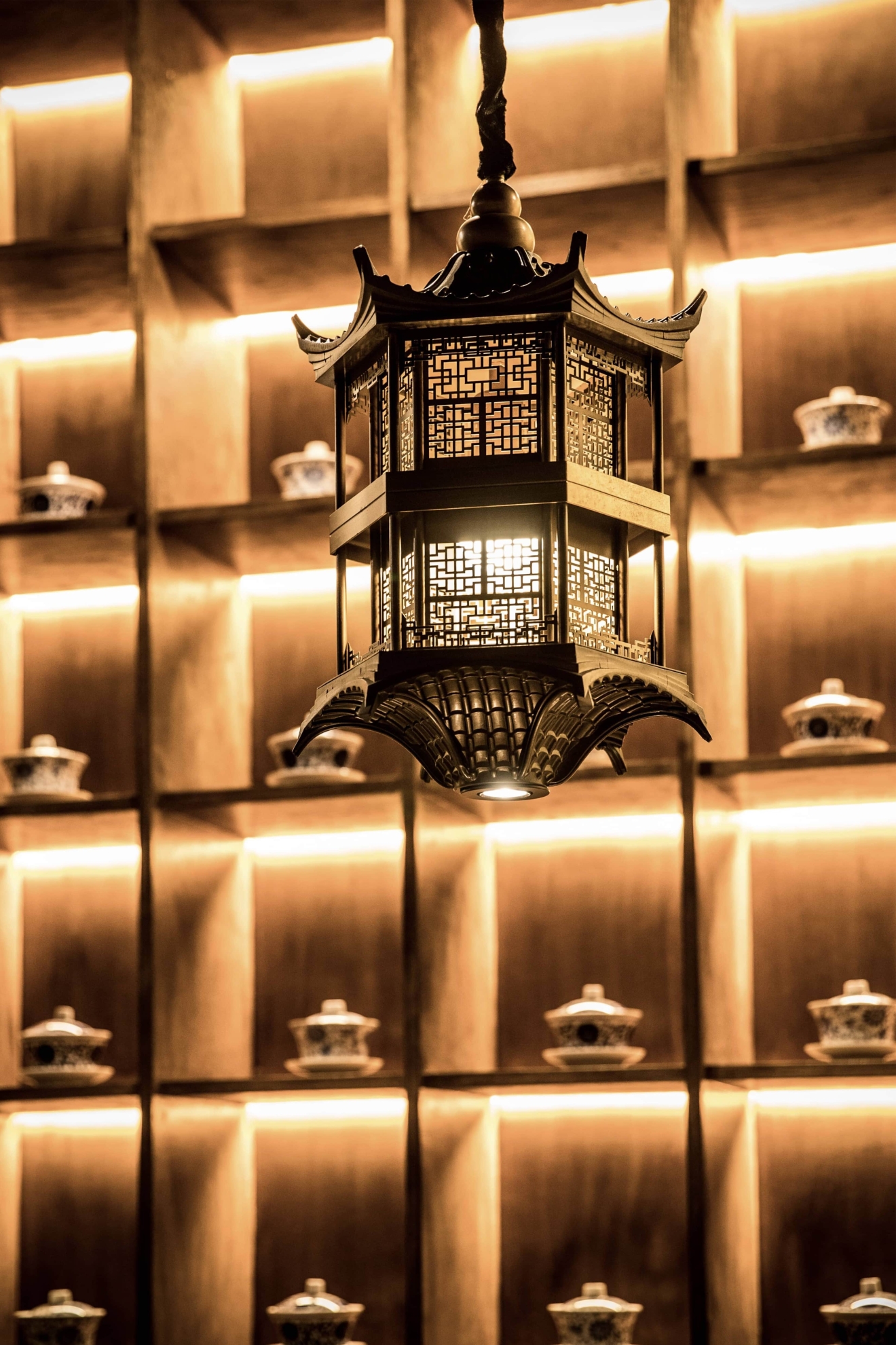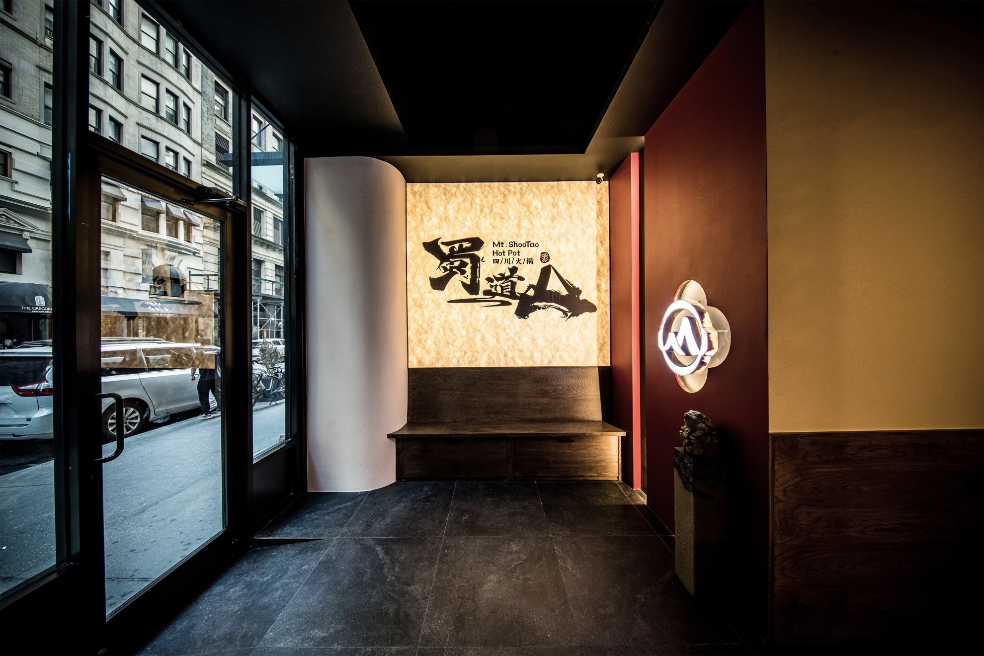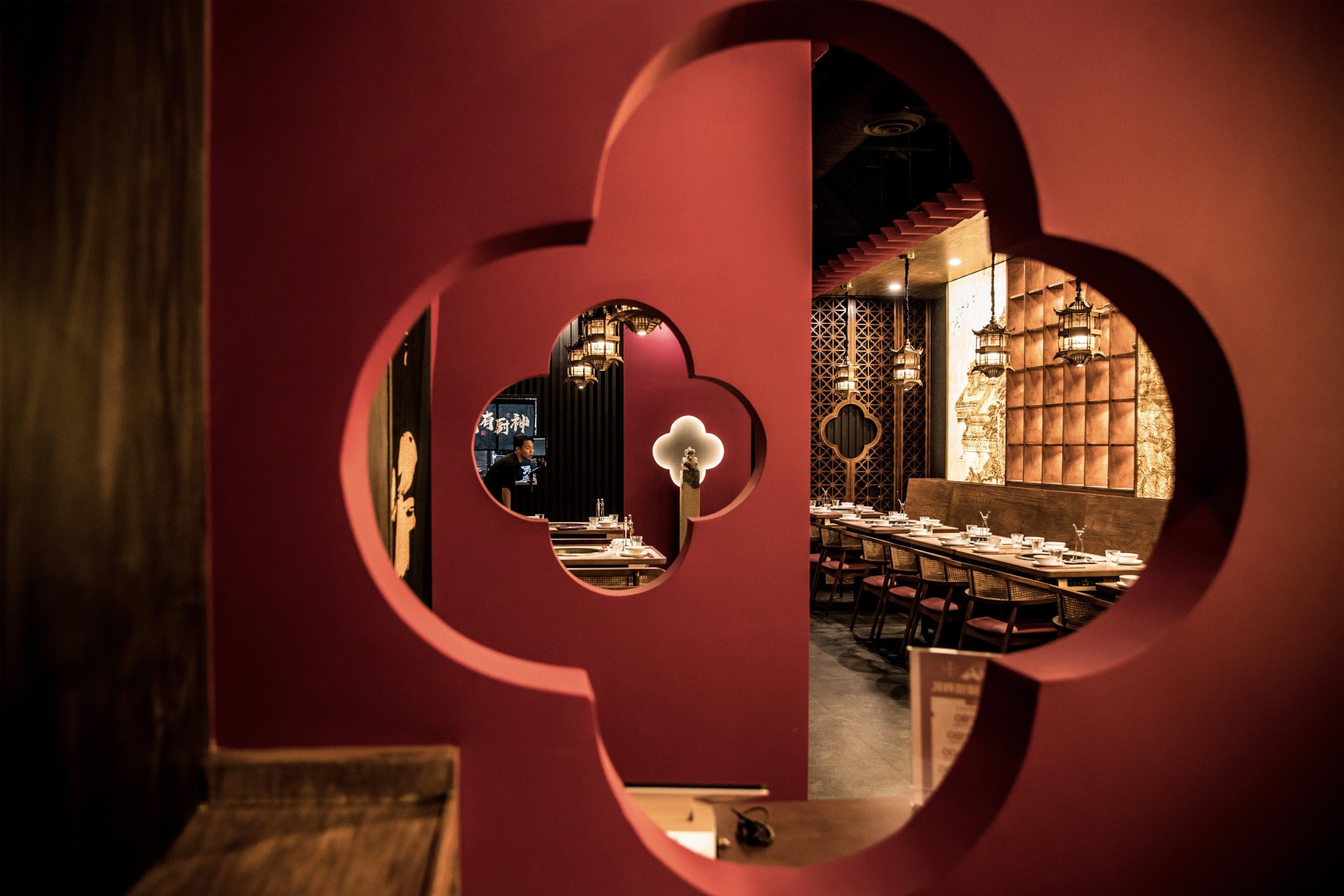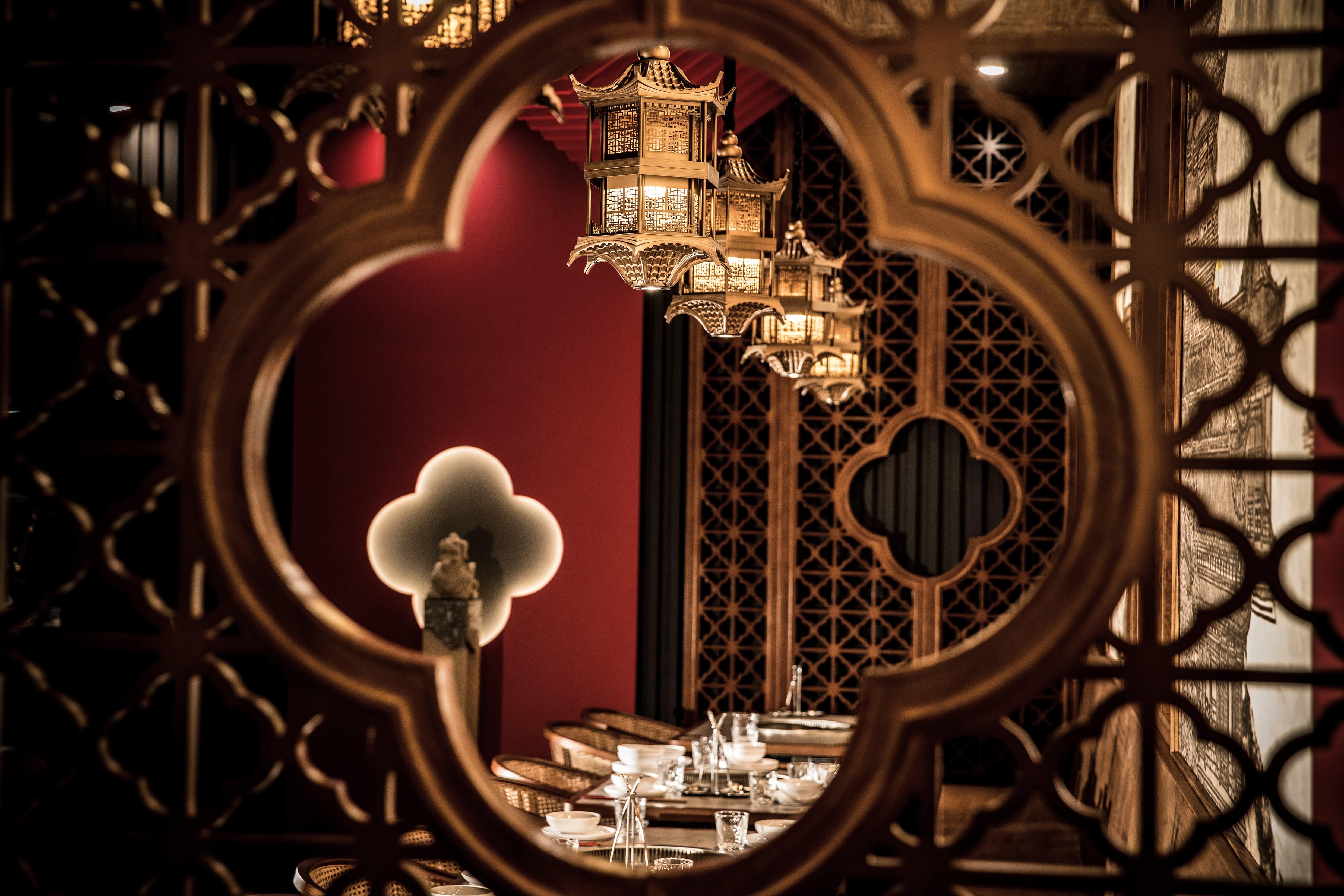 Located in Midtown Manhattan near the vibrant K-Town district, this 1,442 sq ft contemporary hotpot restaurant draws inspiration from Sichuan’s mountainous landscapes and the refined elegance of traditional Chinese architecture.The spatial narrative evokes a symbolic mountain climb, guiding guests toward a pavilion-like peak with panoramic views. A palette of cinnabar red, natural wood, and woven rattan—balanced with matte black—bridges traditional warmth with a contemporary edge. Custom wooden lattice screens define intimate booths and communal tables, while pagoda-roof pendant lights reinterpret traditional eaves. Suspended red ridges overhead recall ancient rooflines, extending visual height and selectively lowering areas to create intimacy.A backlit DuPont paper mural depicting Sichuan palatial architecture casts a golden glow, with warm lighting focused on each table to emphasize the ritual of hotpot dining. Concealed illumination highlights architectural details and textures, allowing traditional aesthetics to transcend nostalgia and radiate with contemporary vitality.