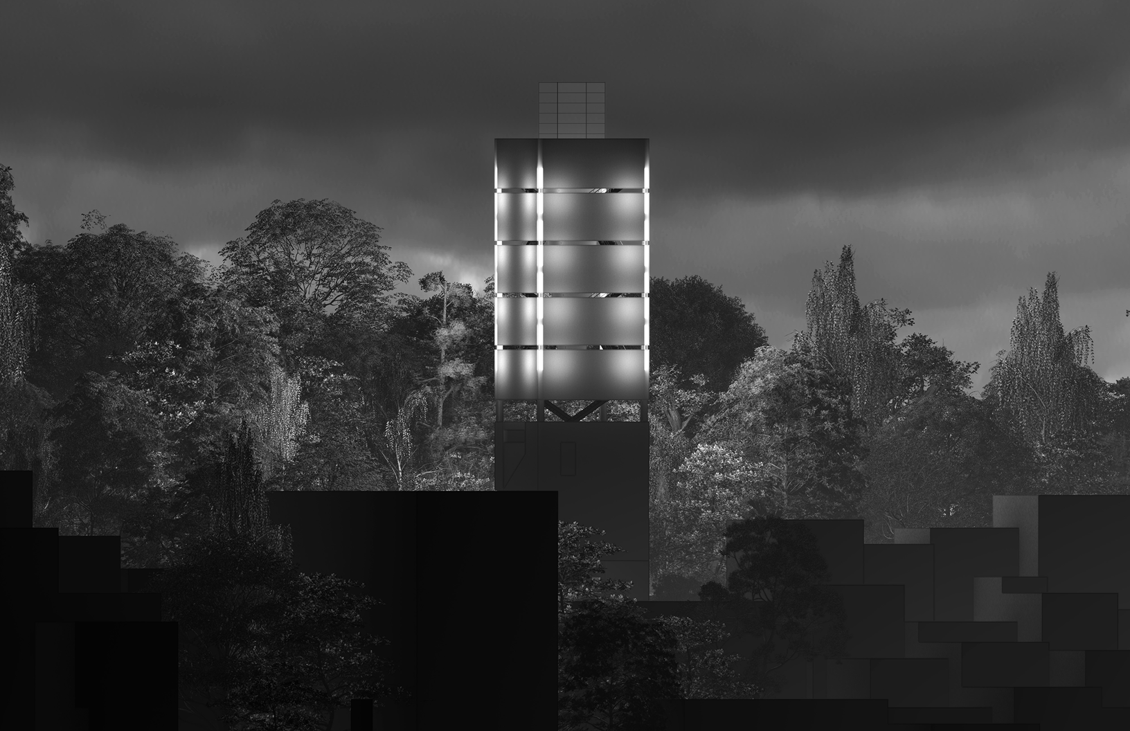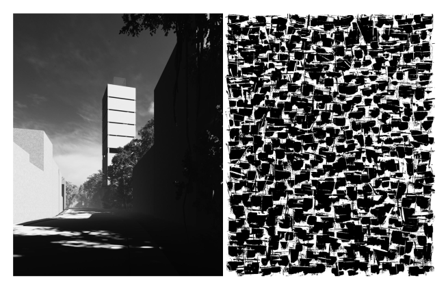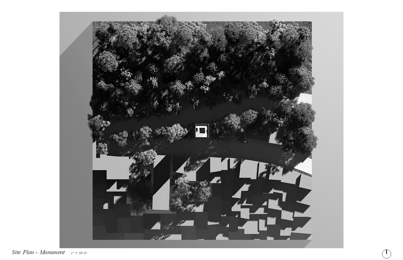 The monument is an interpretation of the existing organized chaos, taking over the transparent boundary of the growth. The intervention happens in the gap of the two masses, between the built and the unbuilt. Arriving to the reflection of the form, in which adapts the idea of how the houses are built.