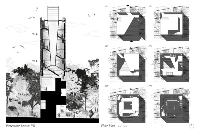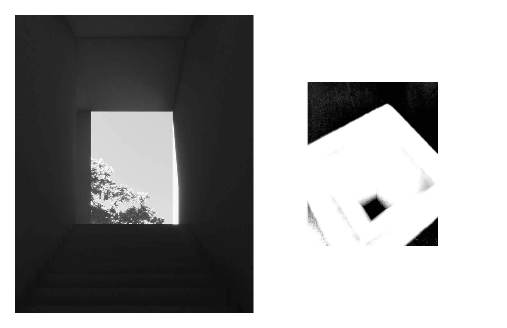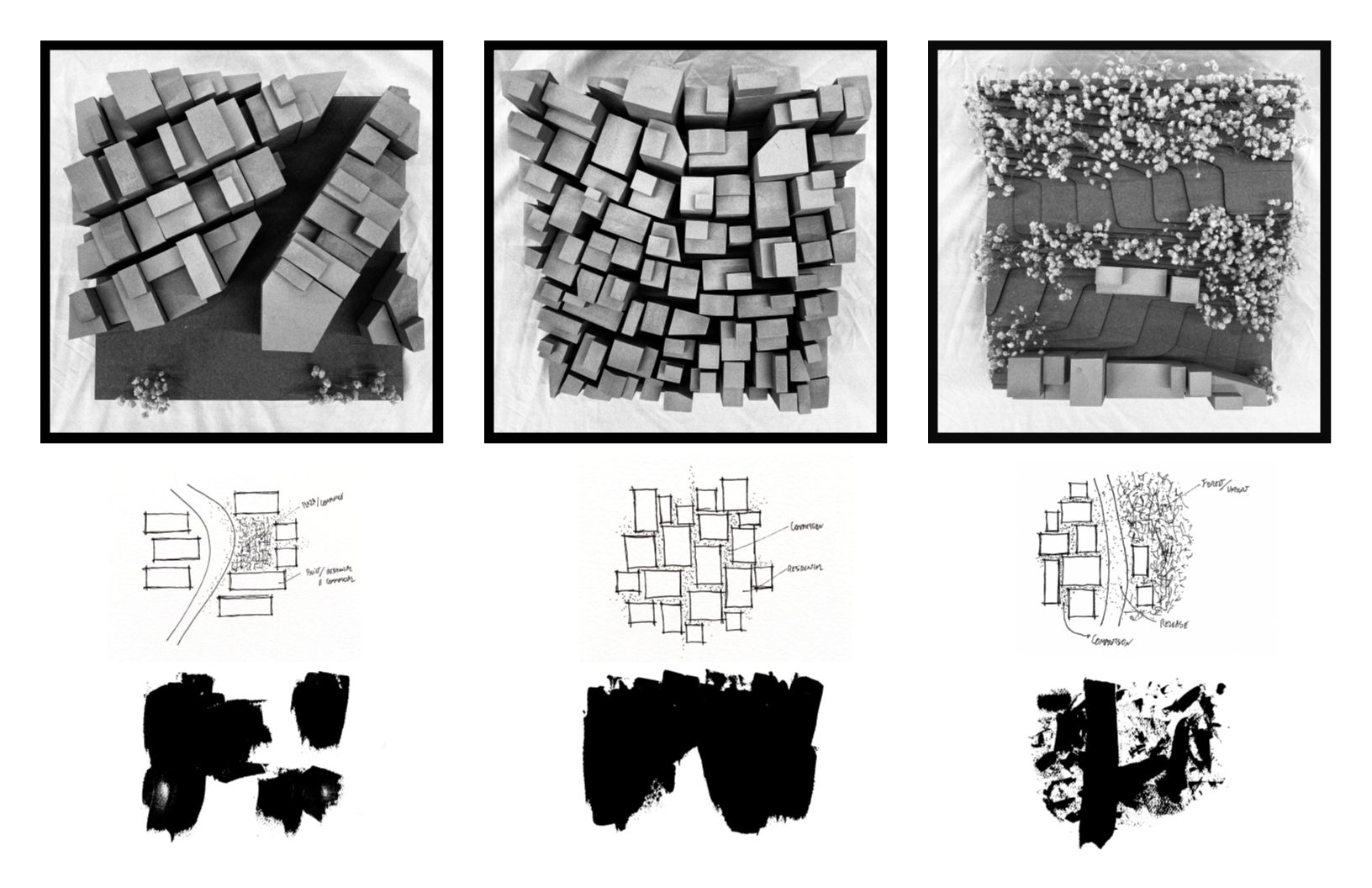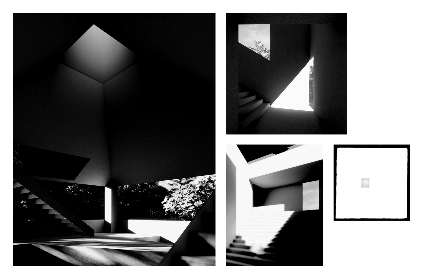 The monument is an interpretation of the existing organized chaos, taking over the transparent boundary of the growth. The intervention happens in the gap of the two masses, between the built and the unbuilt. Arriving to the reflection of the form, in which adapts the idea of how the houses are built.