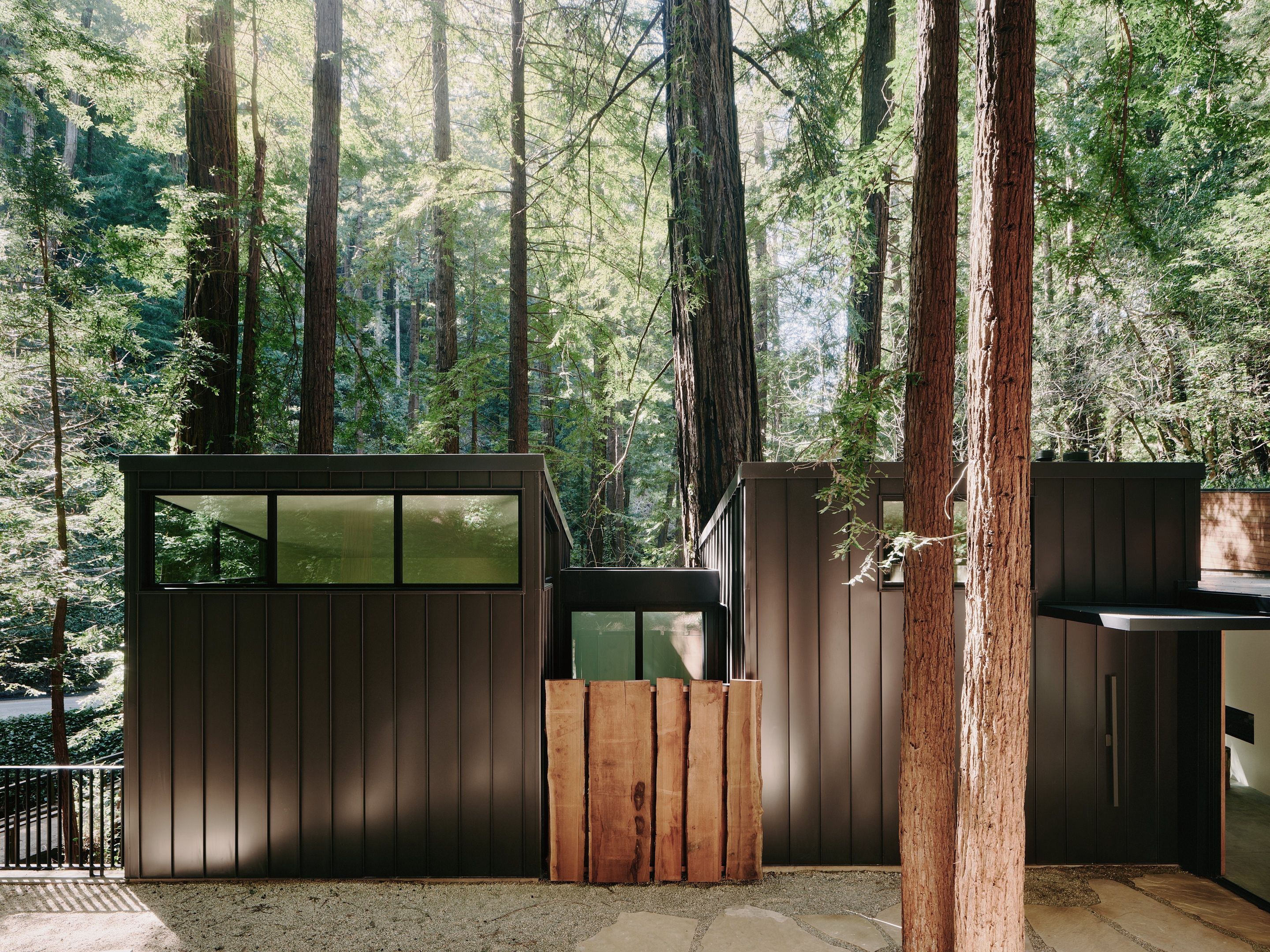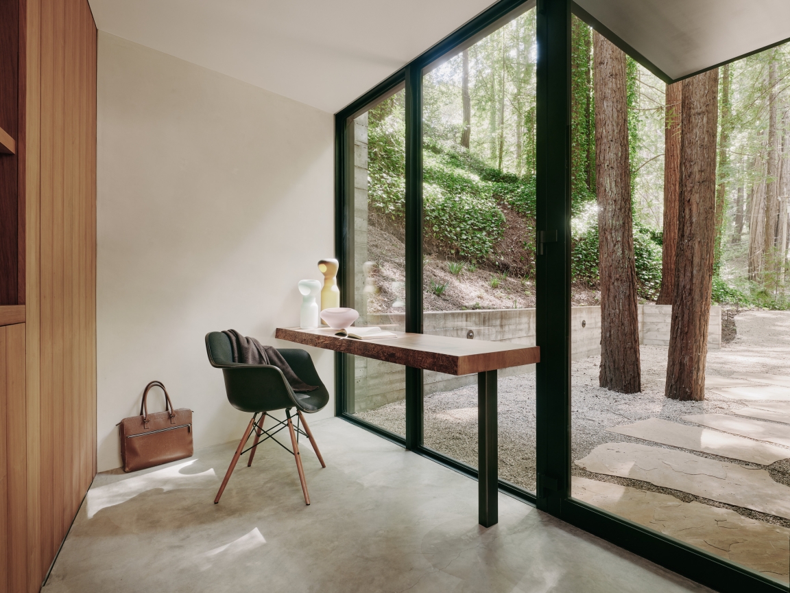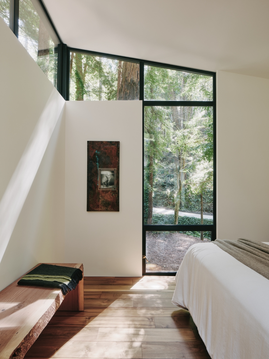 We outfitted the well with filtration, increased water storage, installed a tertiary treatment septic system, buried overhead powerlines and restored the grounds with native vegetation. All the wood in the home was milled from fallen redwood trees and had been stored by the owners for many years for this project. A new ramp replaced the existing stairway for easier access to the home.