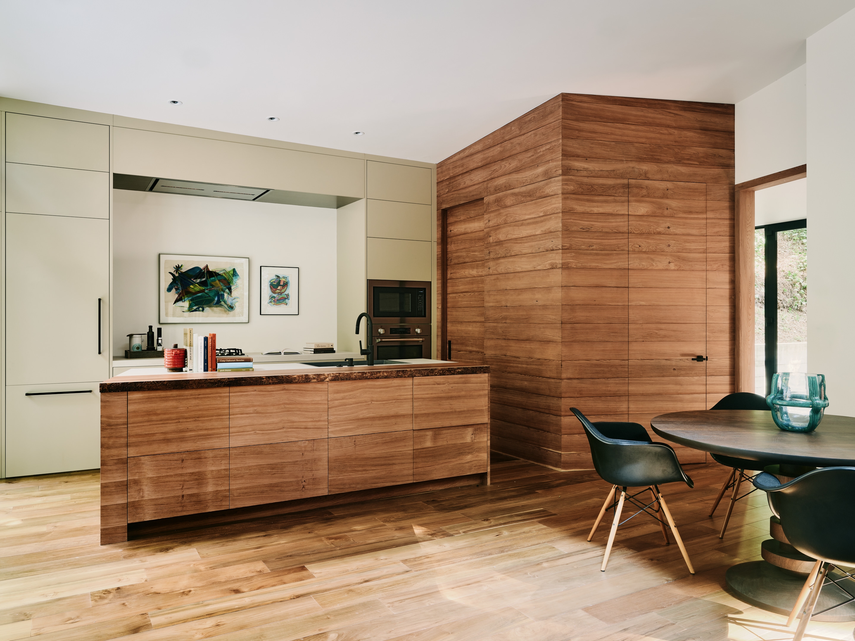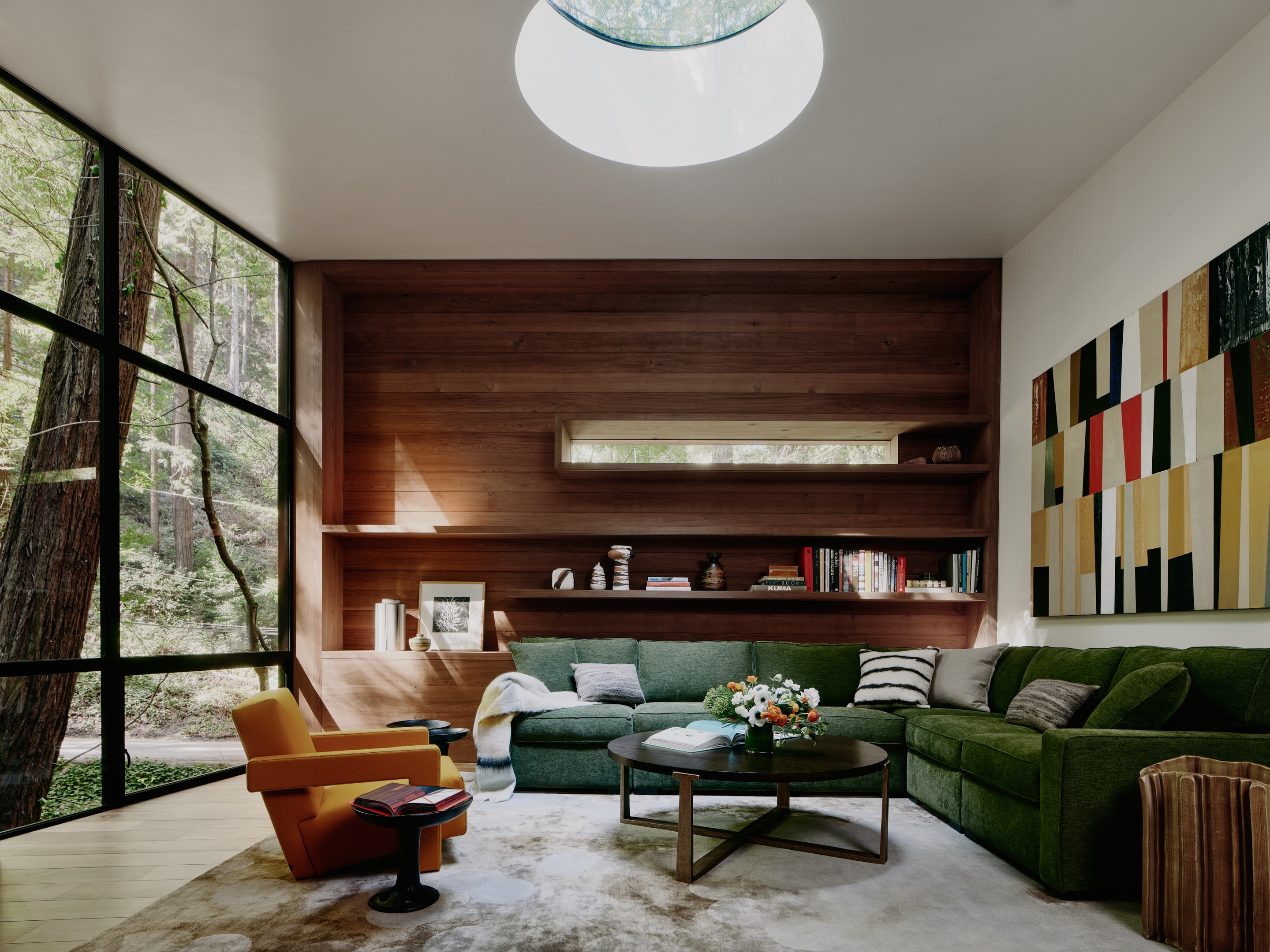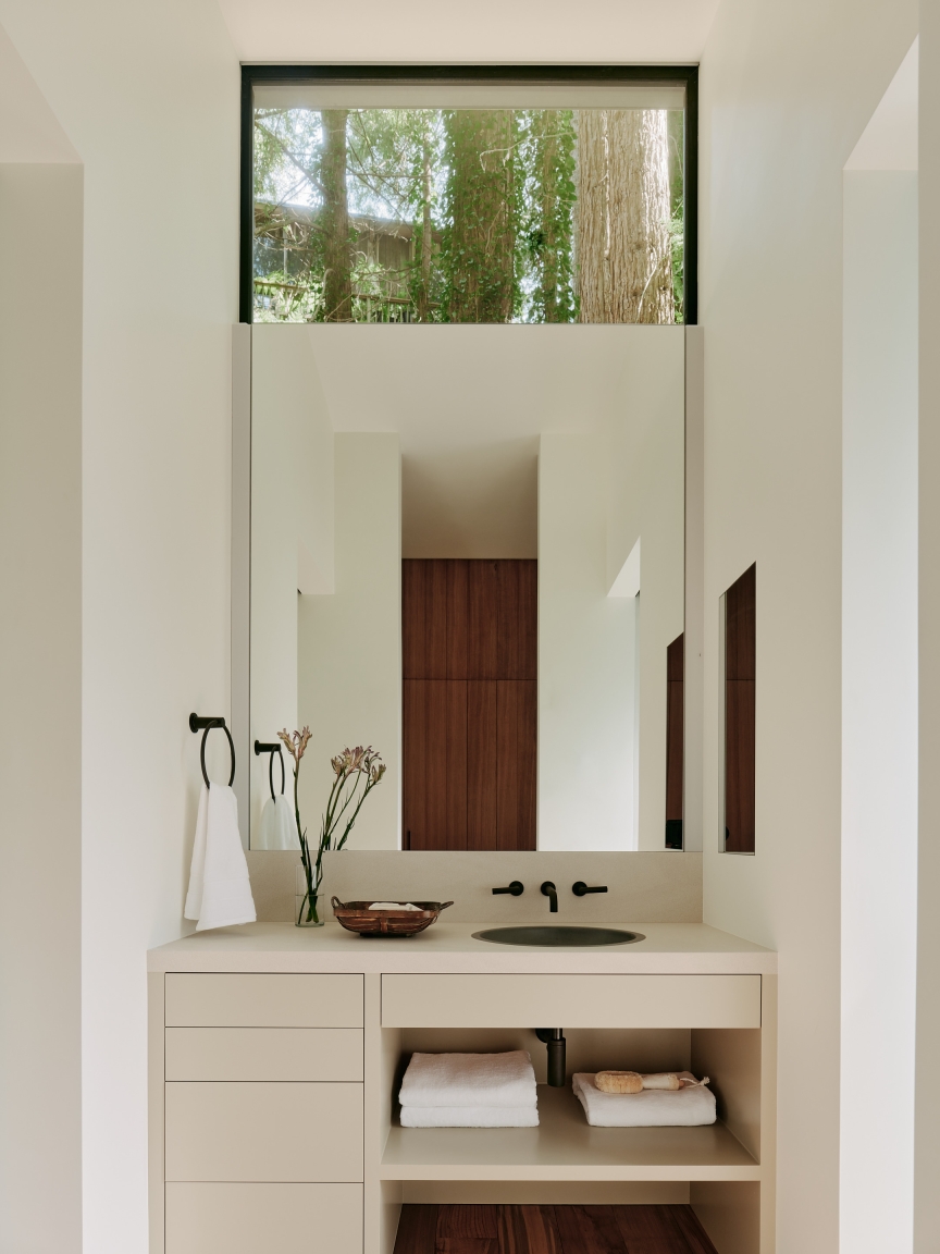 We outfitted the well with filtration, increased water storage, installed a tertiary treatment septic system, buried overhead powerlines and restored the grounds with native vegetation. All the wood in the home was milled from fallen redwood trees and had been stored by the owners for many years for this project. A new ramp replaced the existing stairway for easier access to the home.