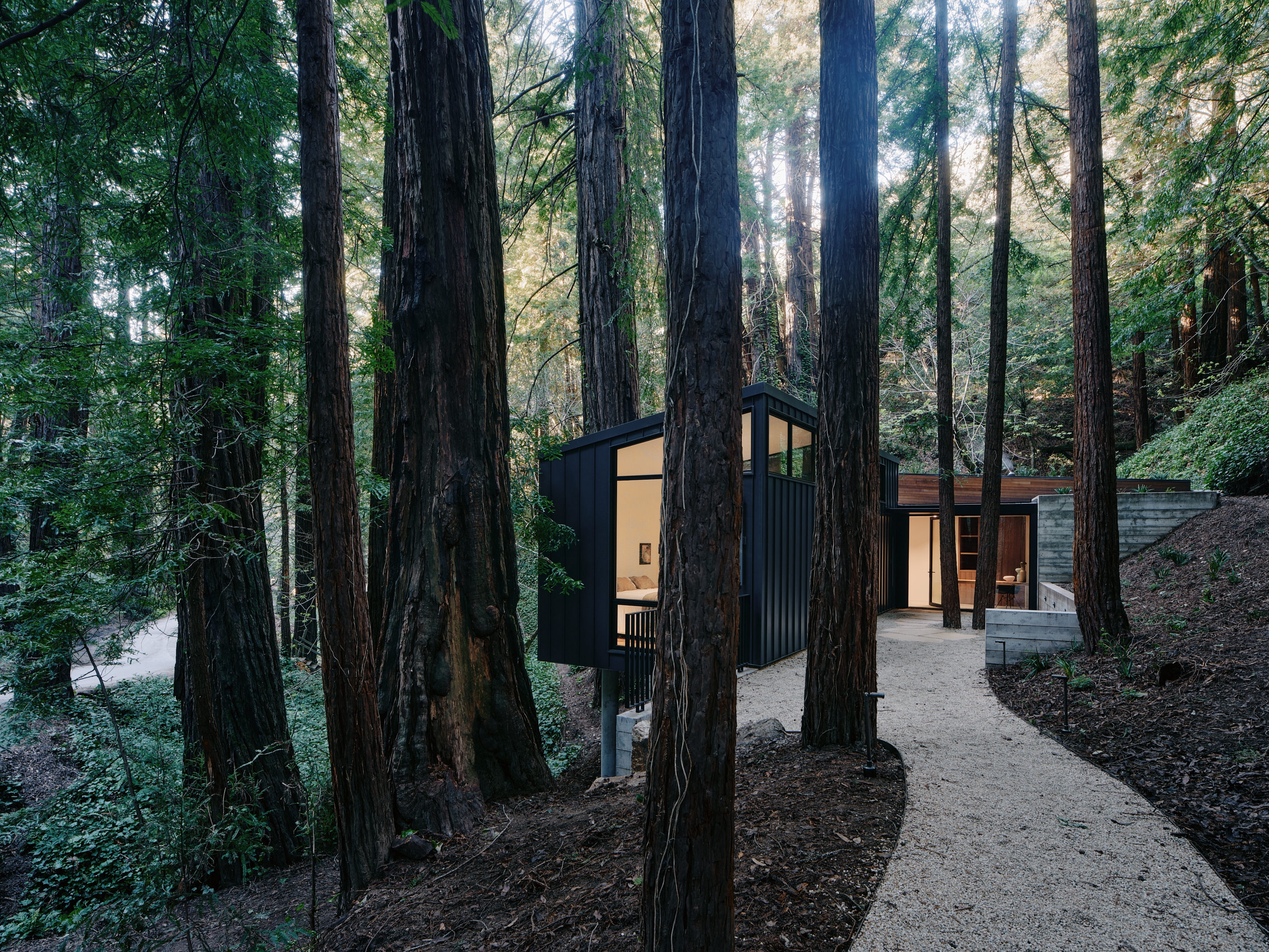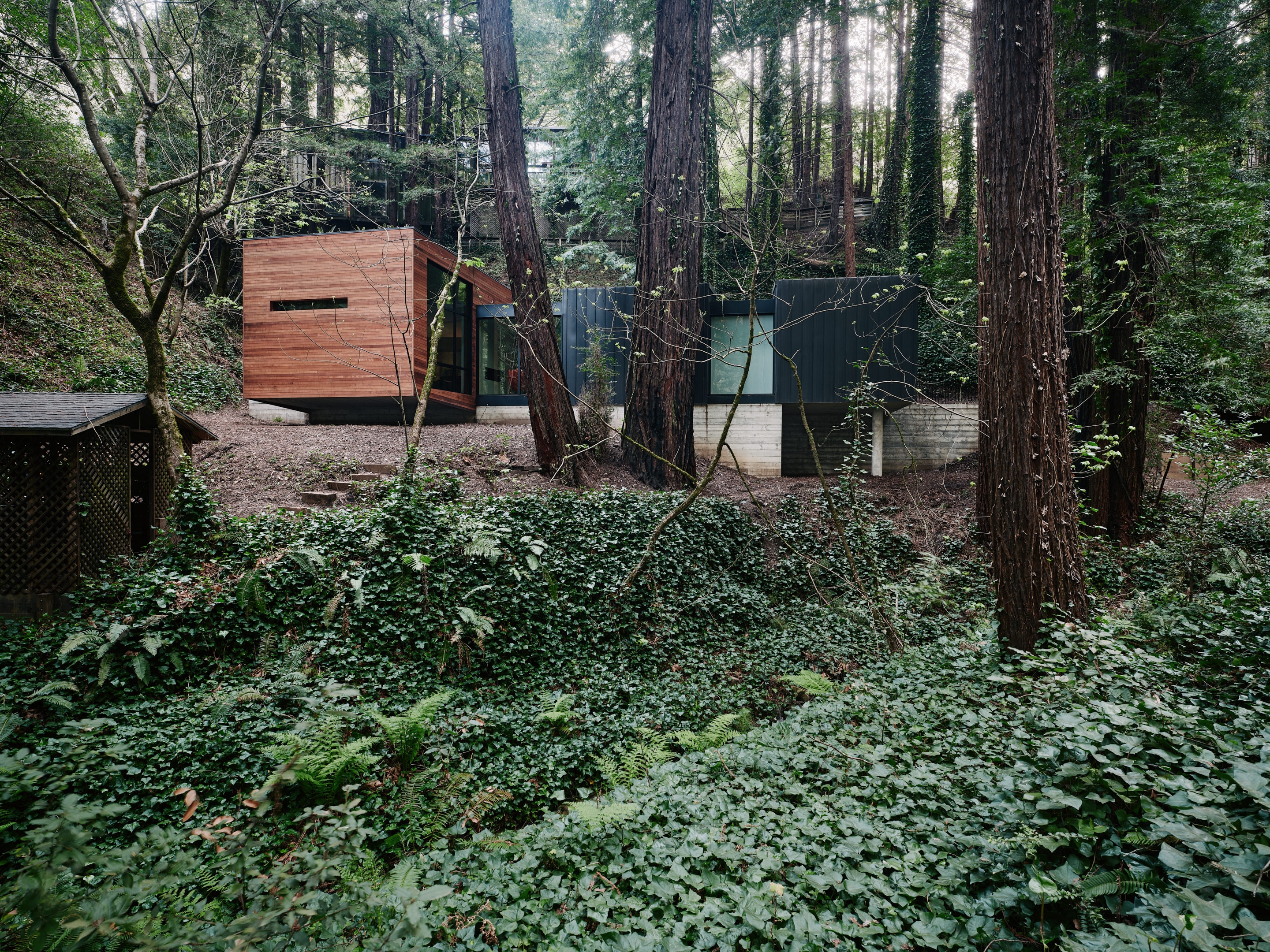 This new 1500 single family residence is located in a redwood forest in the historic Palo Colorado community. The cabins along the Palo Colorado Creek used to serve as temporary residences for loggers and people harvesting tanbark oak, which was shipped from the nearby Nottley’s Landing before Highway One was built. These cabins stayed in the families, and were later used as summer vacation homes are now slowly upgraded or replaced for permanent residency. The owners of this property, an elderly couple replaced a substandard cabin which had reached the end of its useful life. The cabin was served by an existing untreated surface well, was leaking sewage into the adjacent creek, and invasive species, particularly ivy had overgrown the site.