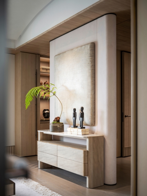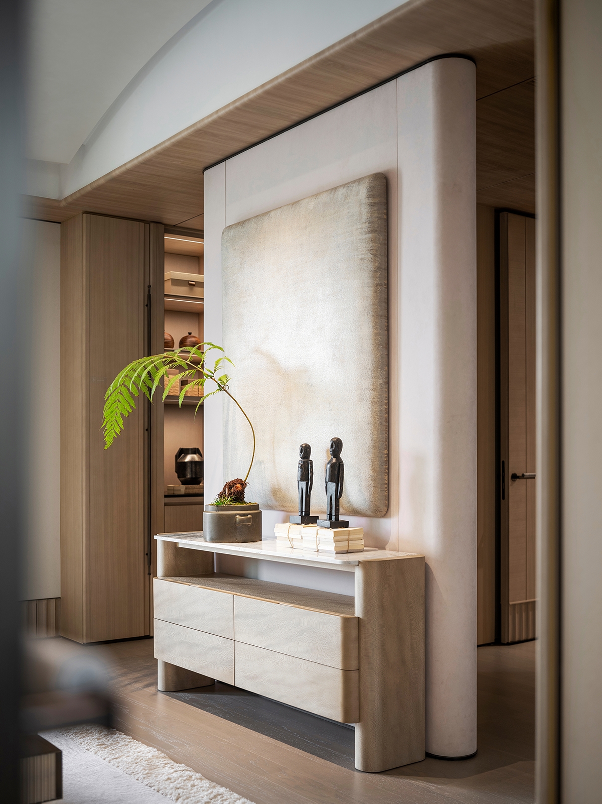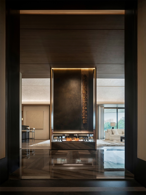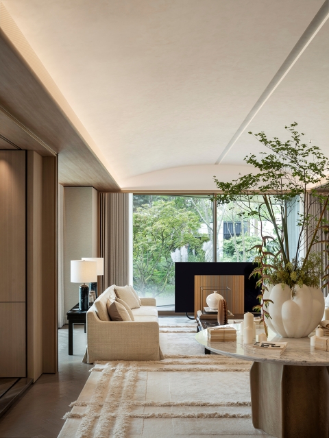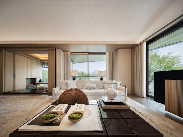 Bronze double doors open to a cruciform foyer, partitioned by an art screen blending function and aesthetics. The living room features an arched ceiling with seven-layer polished textures. Kitchens seamlessly integrate enclosed Chinese and open Western zones with sliding partitions.