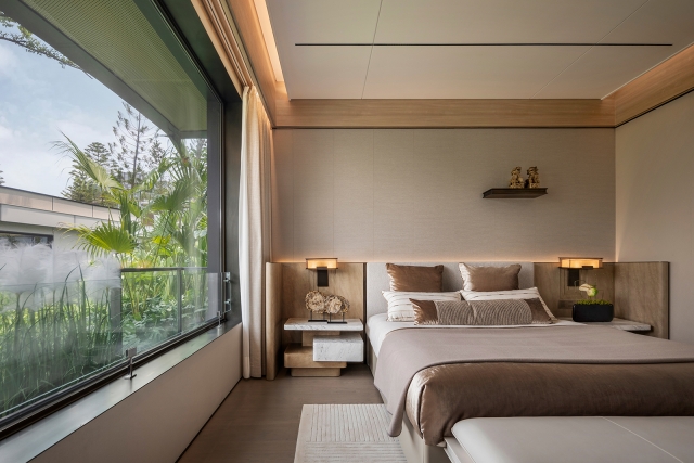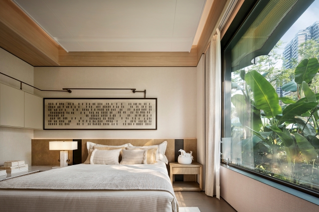 A landscaped balcony encircles the convertible teahouse-bedroom, its glass walls dissolving indoor-outdoor boundaries. The master suite includes a walk-in closet and concealed ventilation system, while secondary bedrooms frame nature through expansive windows.