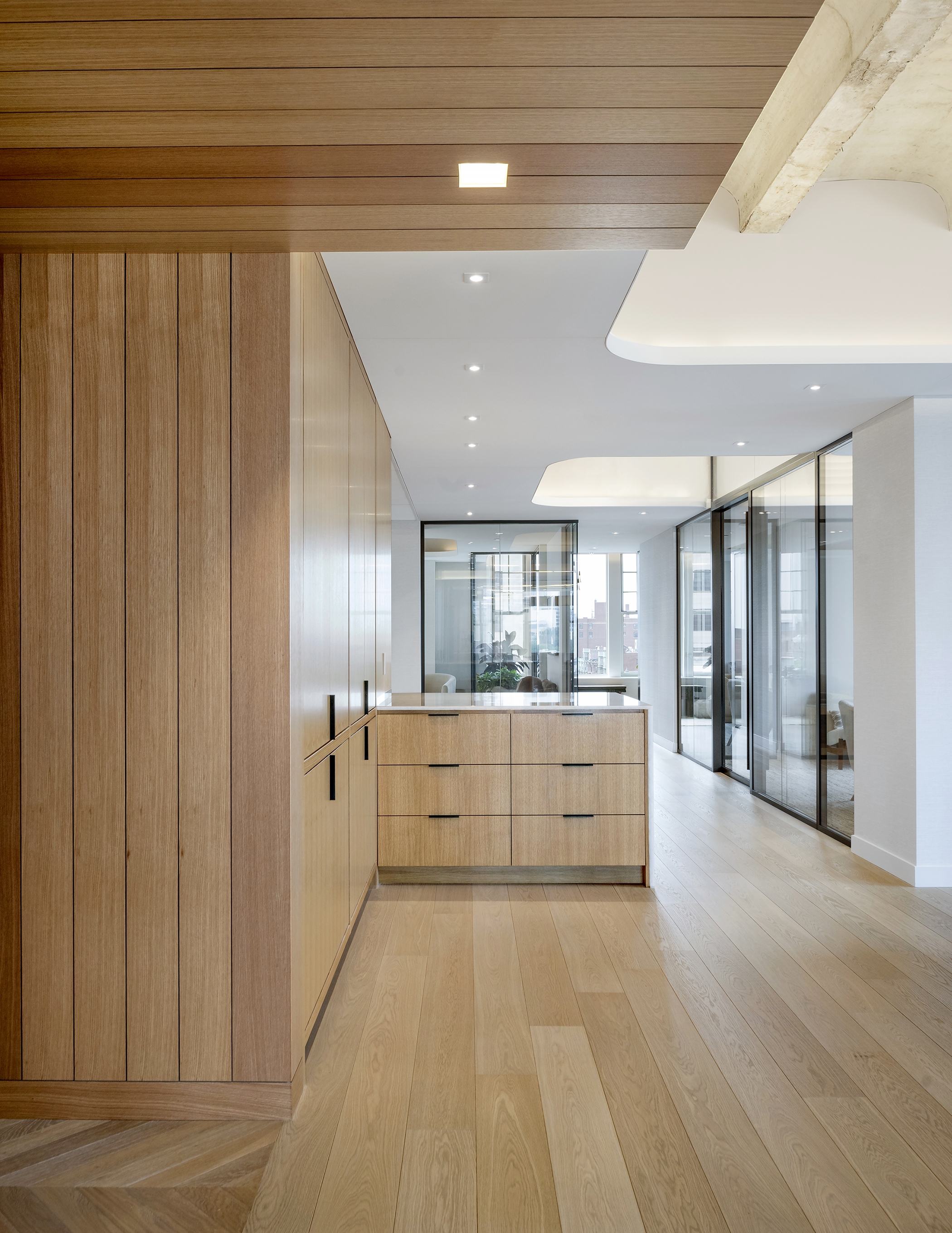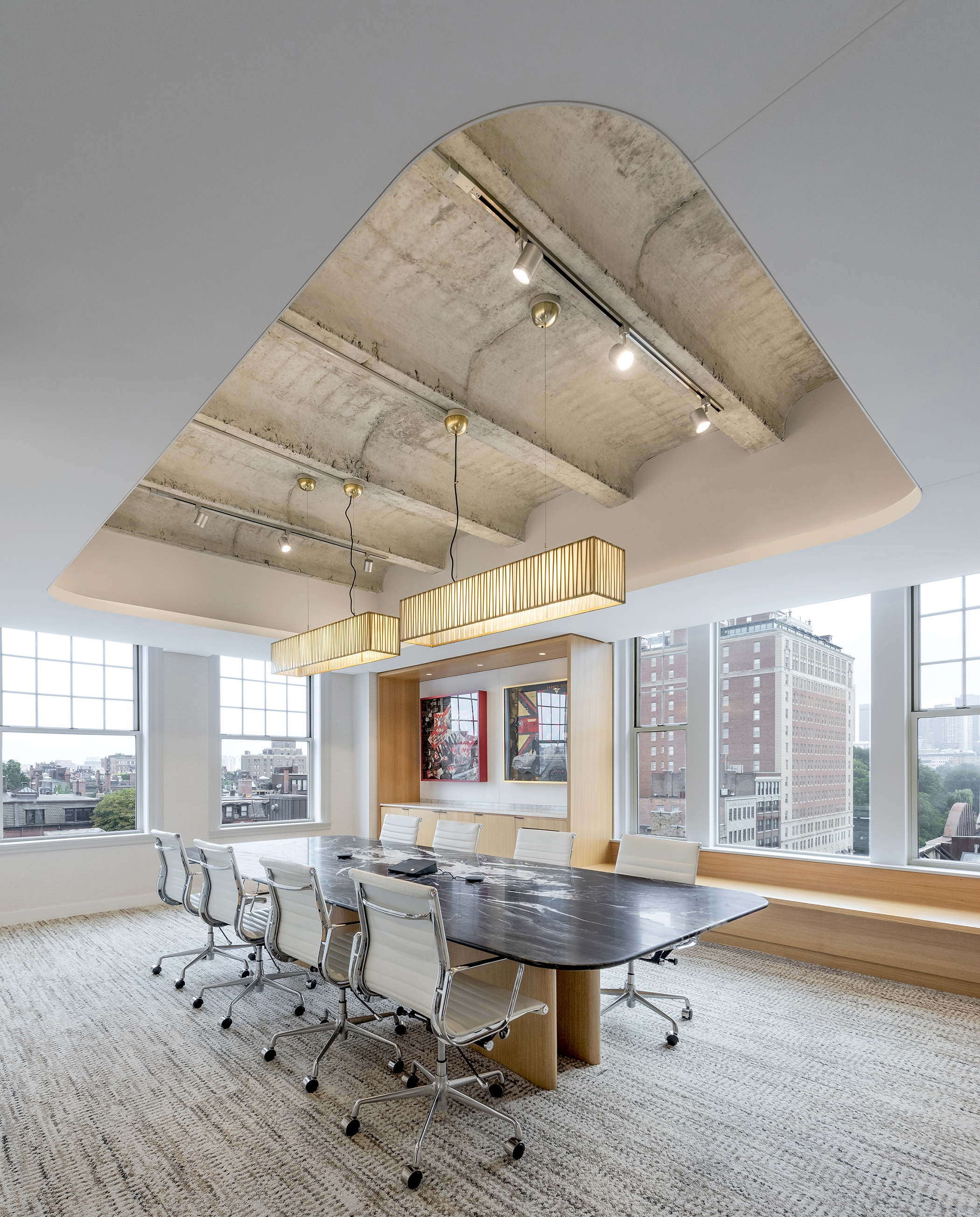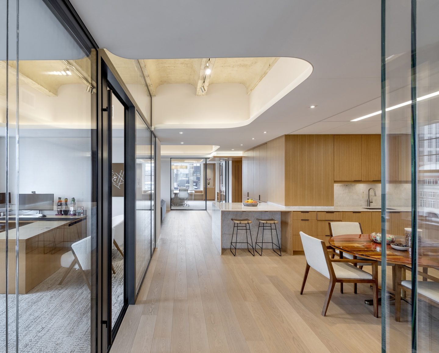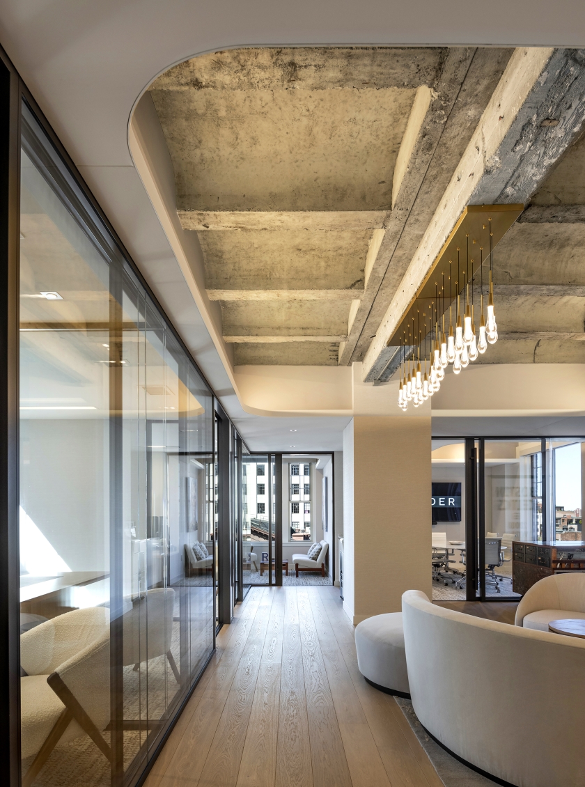 Residentially inspired gathering areas offer opportunities for informal meetings, social interaction, and spontaneous collaboration. In order to achieve acoustic performance while also celebrating the existing hard concrete vaults, we mitigated reverberation through a continuous fabric stretched absorptive ceiling plane with openings to the existing concrete ceiling above. To foster a collaborative and flexible workplace culture, the design emphasizes a layered visual experience. Opaque and transparent surfaces were strategically balanced to offer both privacy and connectivity while existing architectural features were reused or adapted wherever possible. We valued performance, comfortability and beauty in each material selection and design choice, resulting in a harmonious balance between old and new.