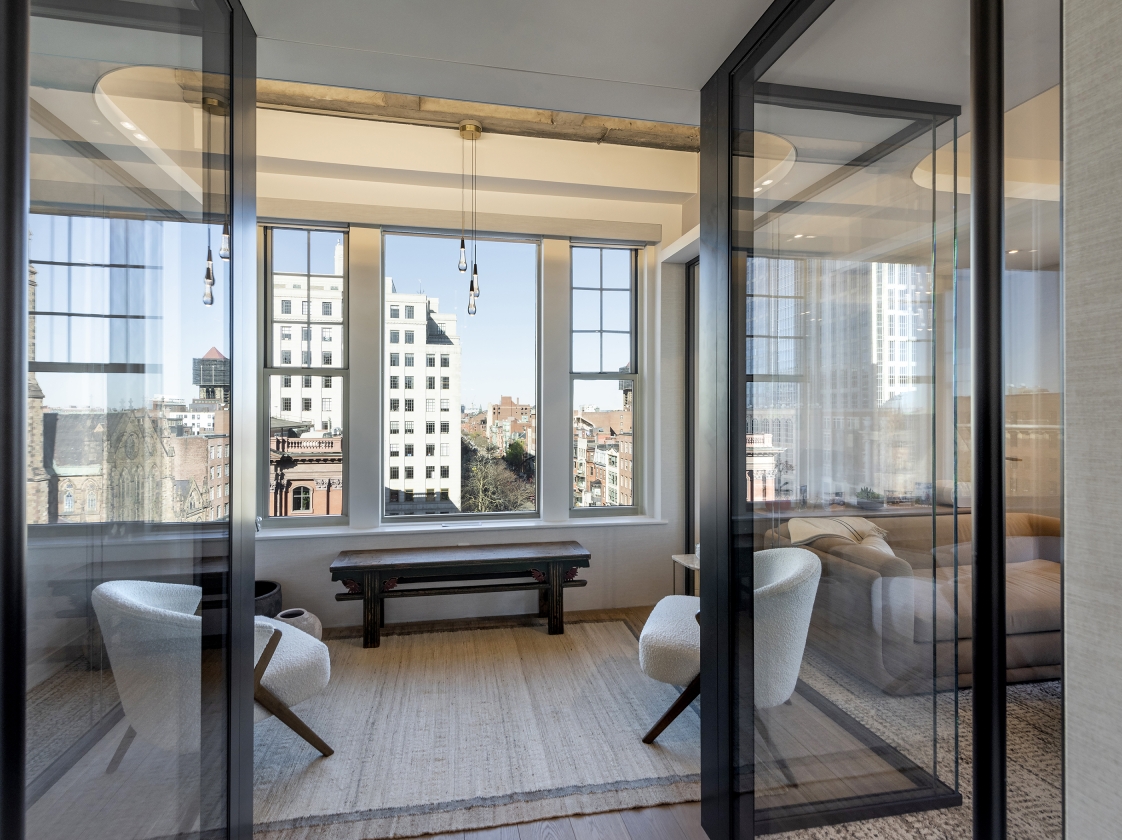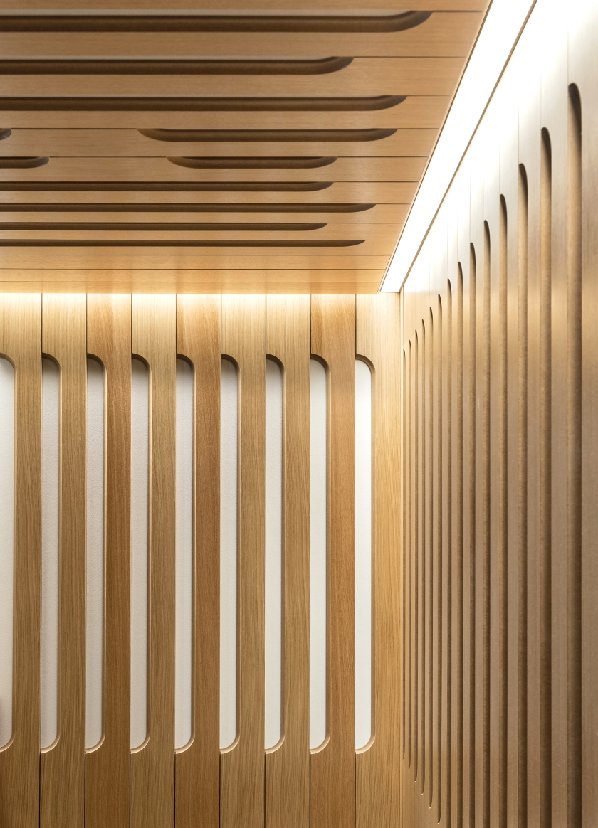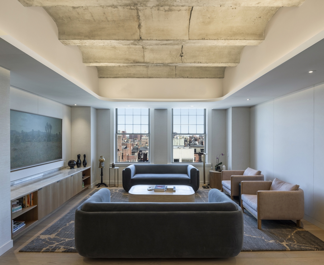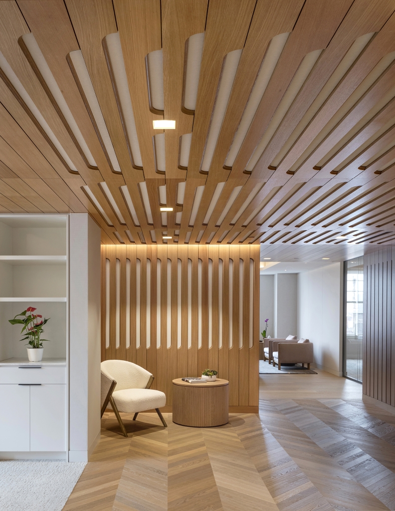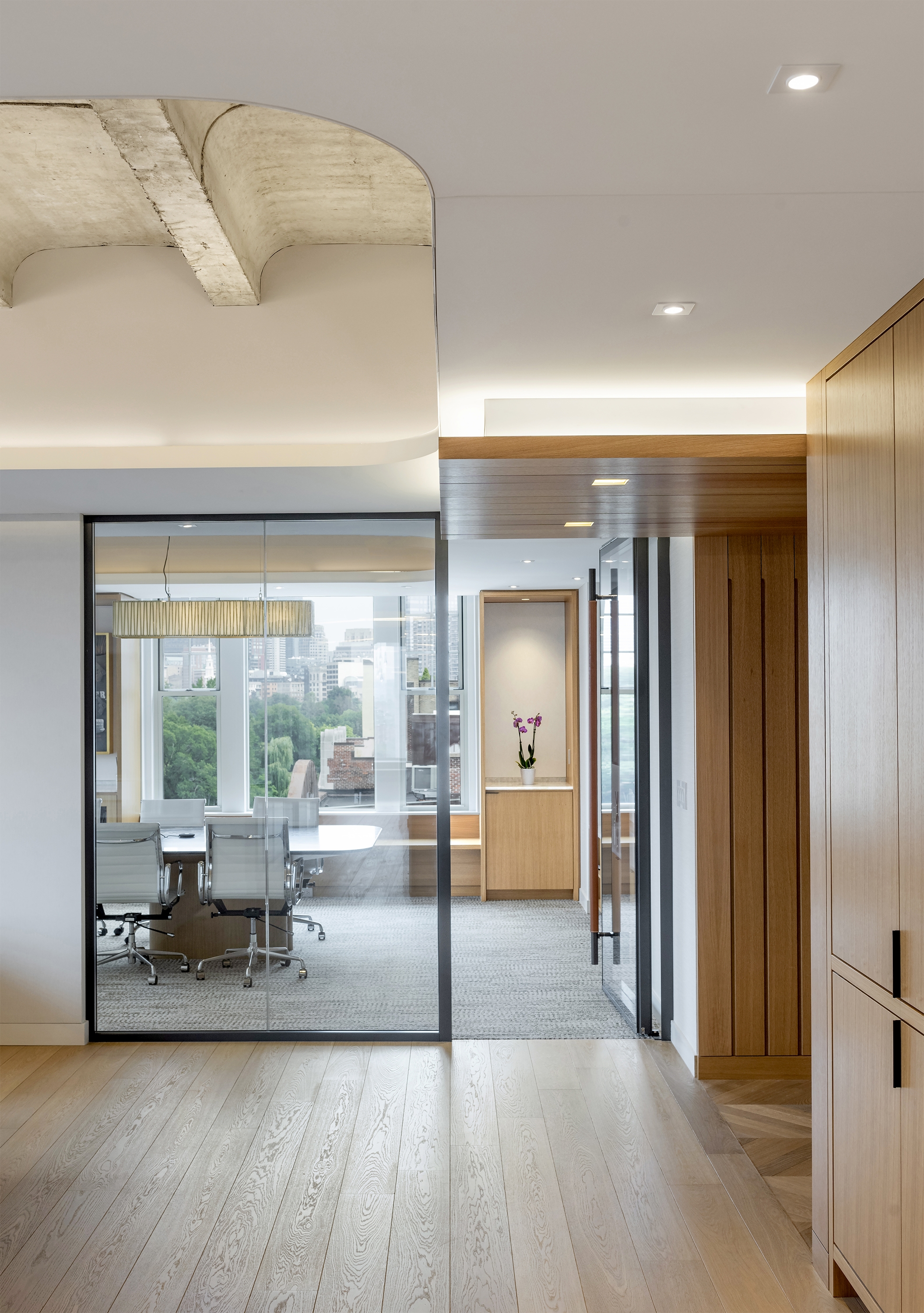 Residentially inspired gathering areas offer opportunities for informal meetings, social interaction, and spontaneous collaboration. In order to achieve acoustic performance while also celebrating the existing hard concrete vaults, we mitigated reverberation through a continuous fabric stretched absorptive ceiling plane with openings to the existing concrete ceiling above. To foster a collaborative and flexible workplace culture, the design emphasizes a layered visual experience. Opaque and transparent surfaces were strategically balanced to offer both privacy and connectivity while existing architectural features were reused or adapted wherever possible. We valued performance, comfortability and beauty in each material selection and design choice, resulting in a harmonious balance between old and new.