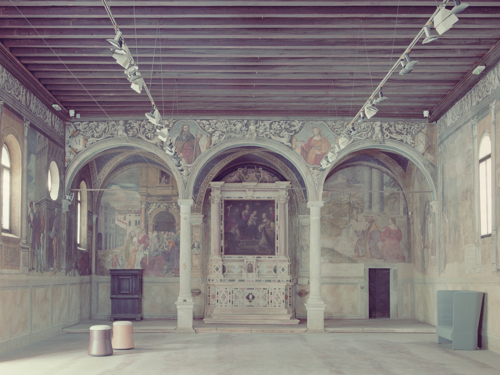 Located in one of the city's oldest districts, the Oratory, constructed between 1521 and 1542, stands opposite the Church of St. Lucia. The building features a large frescoed hall on the raised floor, used for exhibitions, and an upper floor accessible via a steep staircase, housing an altar reredos by Tiziano Minio and frescoes by Campagnola. The monument’s significance and the popularity of temporary exhibitions of jewelry and contemporary art installations highlighted the need for expanded exhibition spaces.