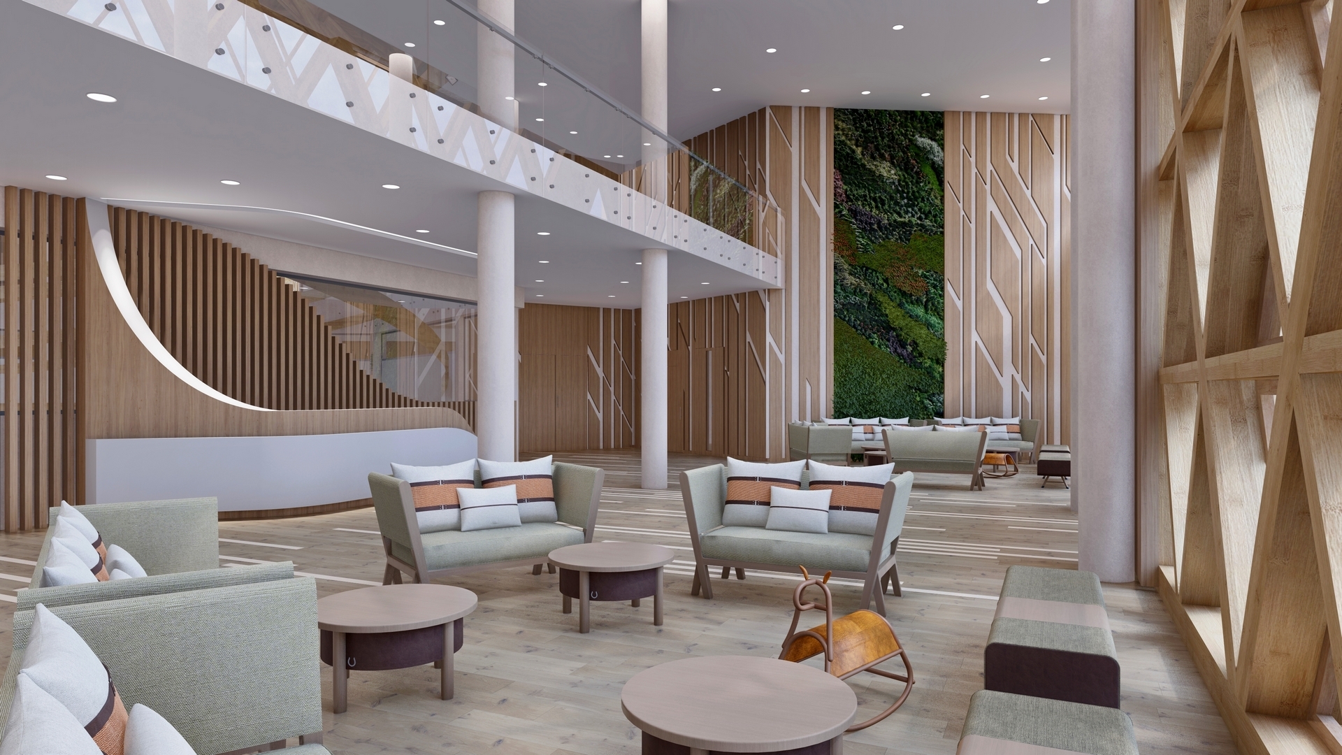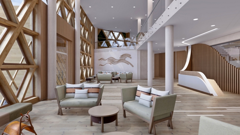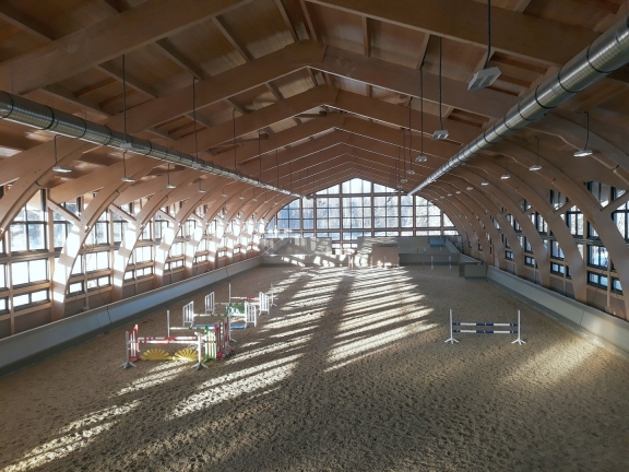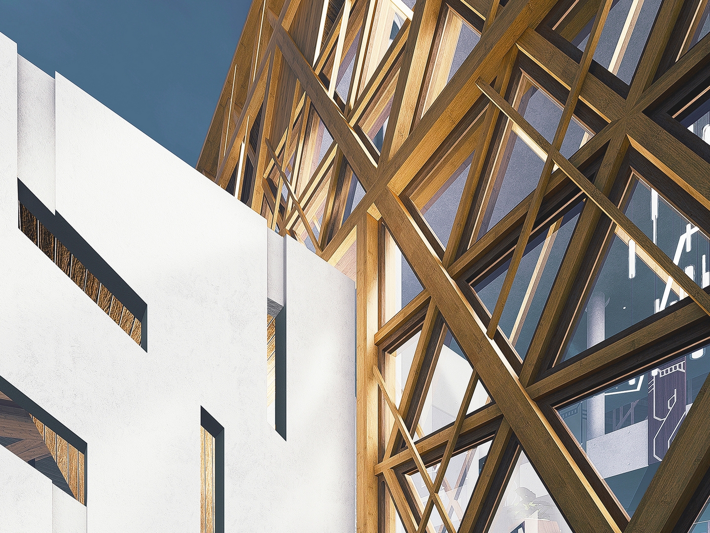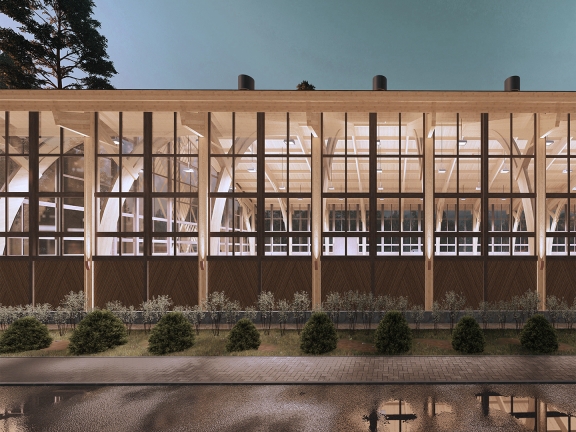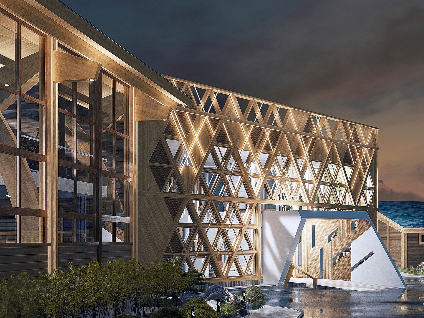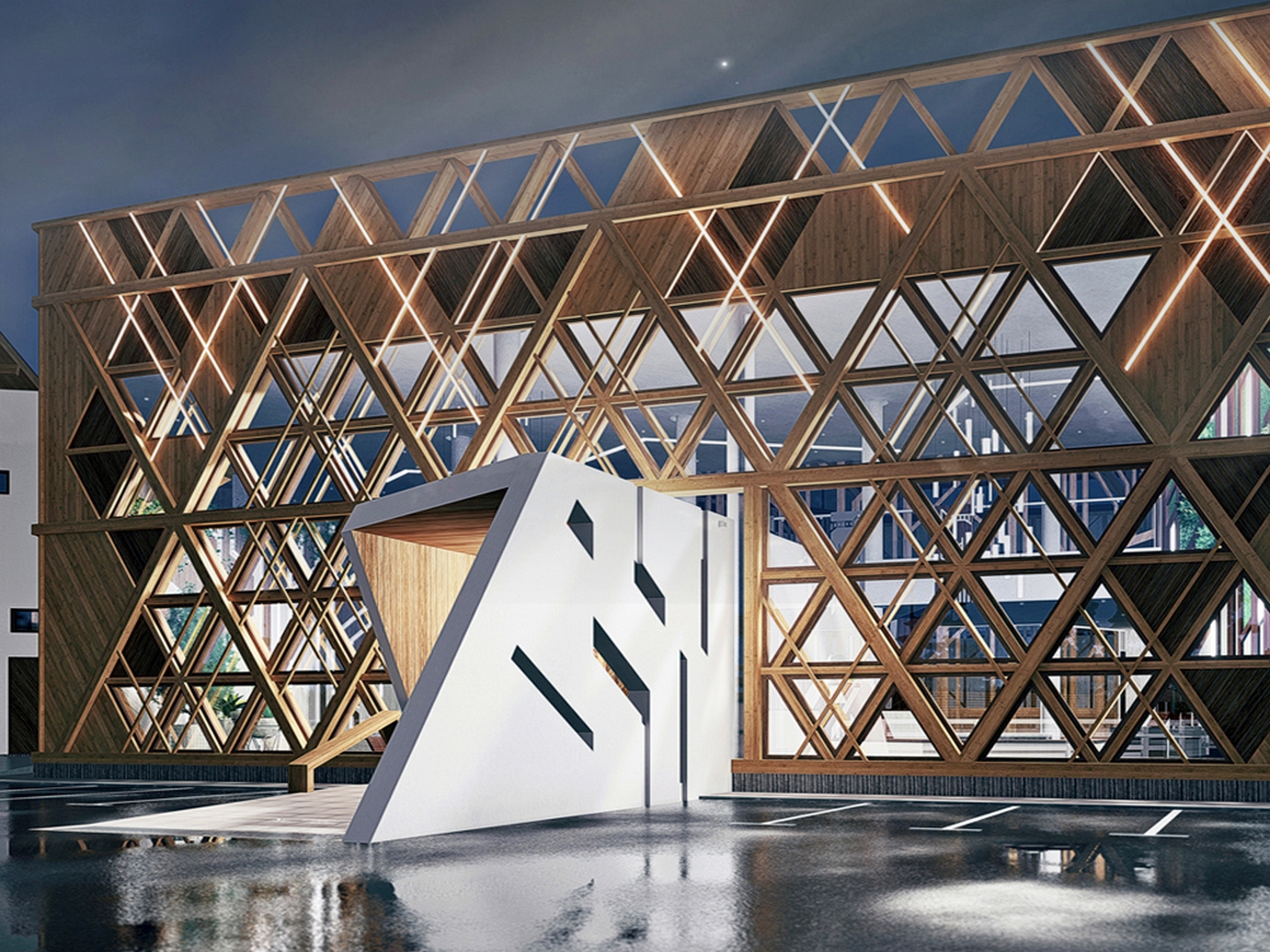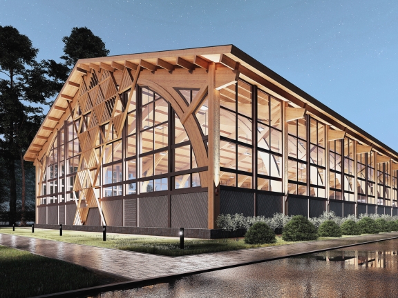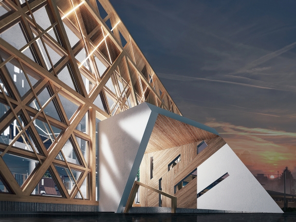 Complex- landmark part of large recreational zone. Multi-functionality is reflected into urban, architecture & design through prism of equestrian technology. Building division consist of six functional blocks: stables, arenas & central administrative part that is served as connecting core. Its structure is similar to crystal lattice of mineral, enlarged by billions times. This coincidence is suggested main idea – gem that sparkles its facets. Holistic architectural & spatial image unites all buildings & reveals functional identity of each with original & non-repeating design. As a result, creating a spectacular image of entire complex, which plays with faces like an emerald. Extended wooden facades is directed to central composite core. Six-sided wooden form is as a jewel rests in golden framed necklace. Wooden material is used as load-bearing structures, facade ornament & all decorative elements. Palette is close to natural wooden colors. Interiors continue theme of wooden facade structures. Crystal shape - main element of both interior & exterior, where transparent web is perceived environmentally. Each element of interior space expresses horseracing & continues main movement up.