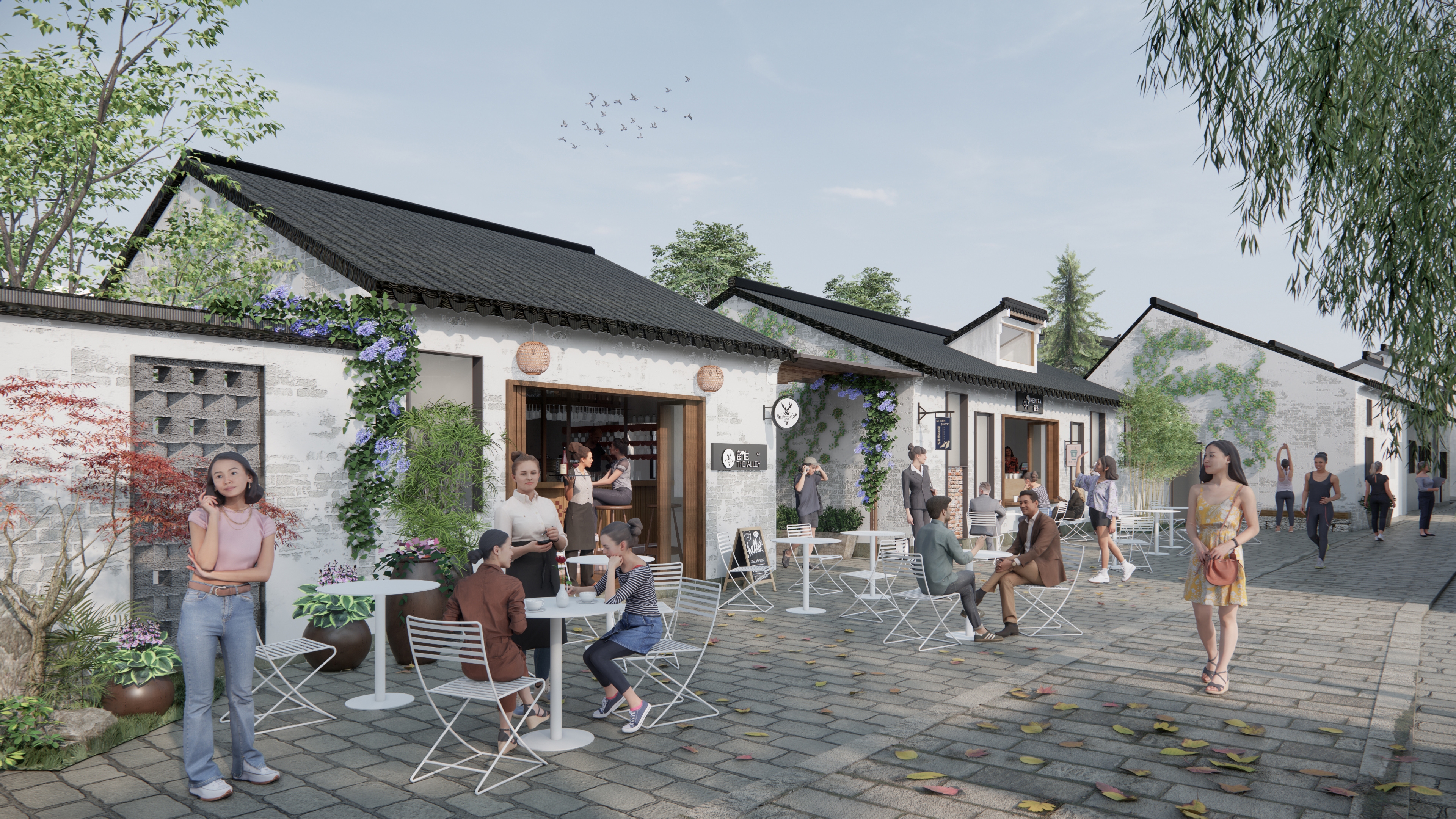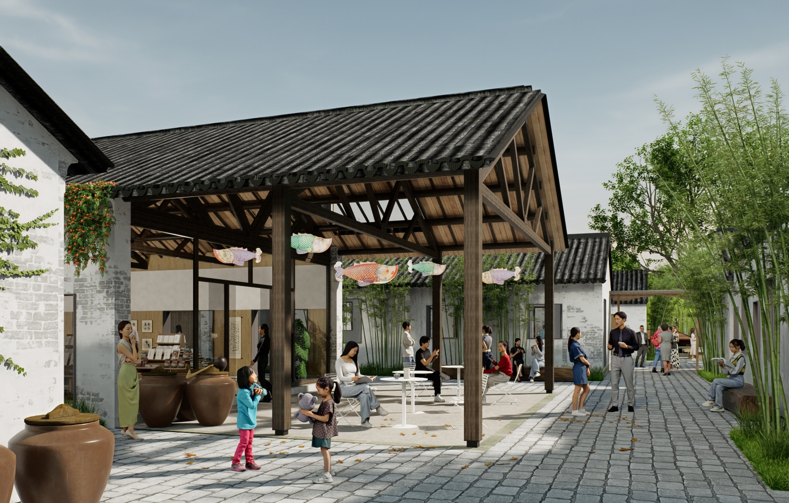 To enhance spatial quality within the sauce workshop, partial walls were demolished to expose preserved triangular roof trusses (Republic of China-era factory), transforming them into vibrant public spaces. A brick-carved gate tower within the sauce workshop, featuring rustic style, defines a small outdoor performance space. It creates a distinctive scene for the sauce workshop.