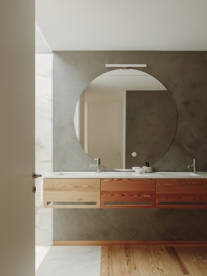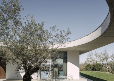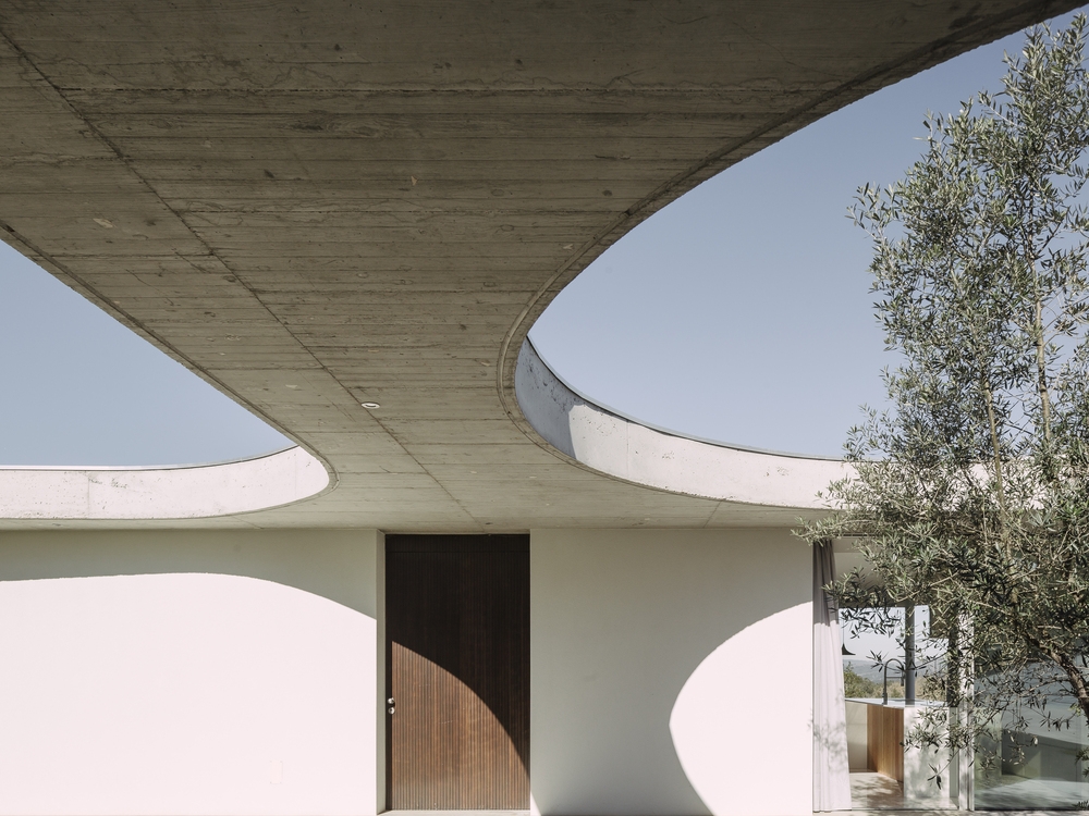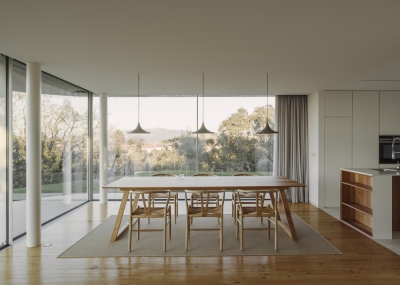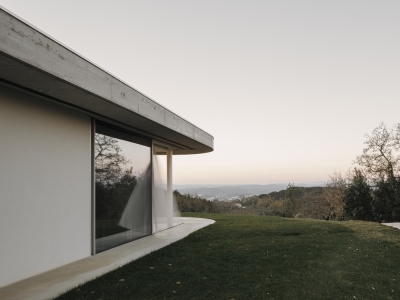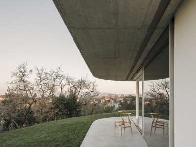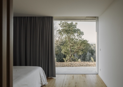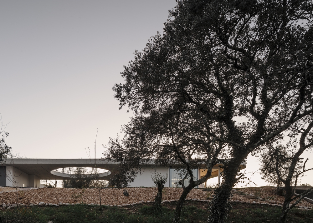 Casa Chouso is located in a humble village which is part of Ansião, on a piece of land with a superb view over both the village and the hills of Sicó. The general idea was defined from the primary analysis when first visiting the site. The land presented great natural surroundings, overflowing with clusters of trees and rocks. Furthermore, we were also bestowed with fragments of history that go back to old folk traditions. Namely, as the land was primarily used for animal pastures, we found a threshing floor that was used not only for threshing, but also where people socialised. It is from this first impression that the concept for this project comes to us, Casa Chouso. “CHOUSO” means a fenced or closed area; hedge grown by shepherds to hold the cattle. Taking advantage of the particularities of the land, Casa Chouso was built to be in tune with its surroundings and emerge from the enveloping nature, as well as coming together as the ideal answer to what our customers had pictured for a home. Thus, it was essential to come up with a project that would not only provide privacy from the nearby road, but also spaces that would allow to fully enjoy the enveloping landscapes.