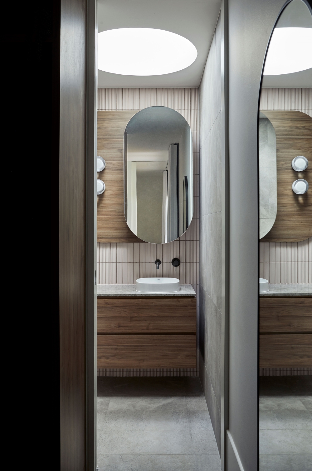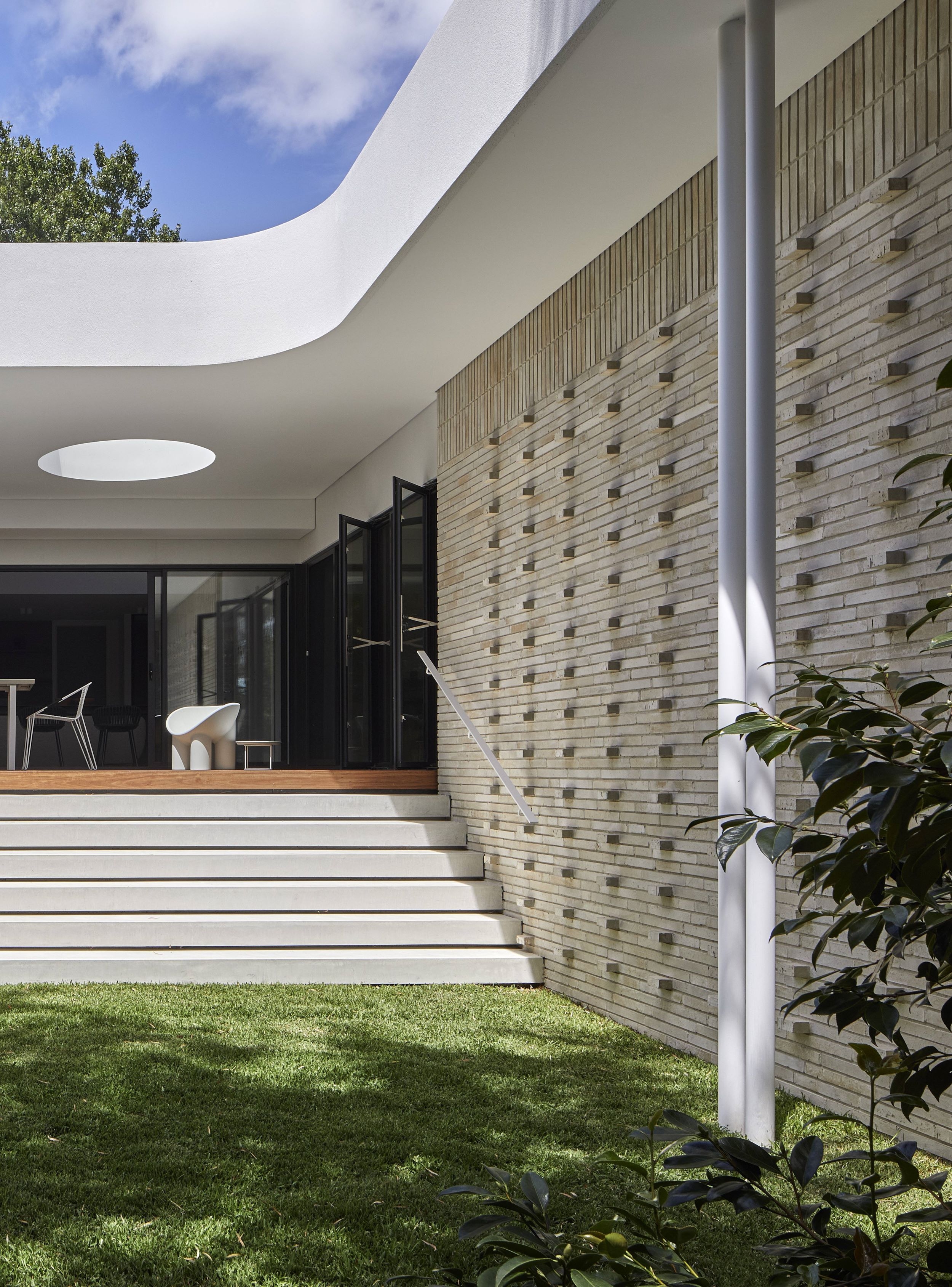 The light filled sheltered area sits delicately over the outdoor space with twin rod columns supporting the main structure and twin oculus roof openings allowing indoor and outdoor spaces to experience views through to the tree tops and gardens beyond.
