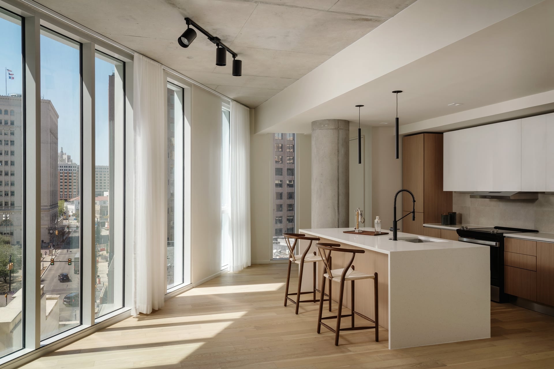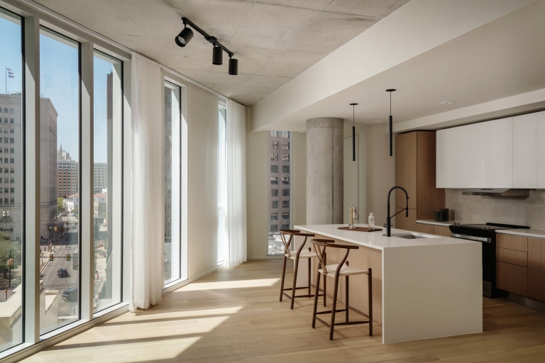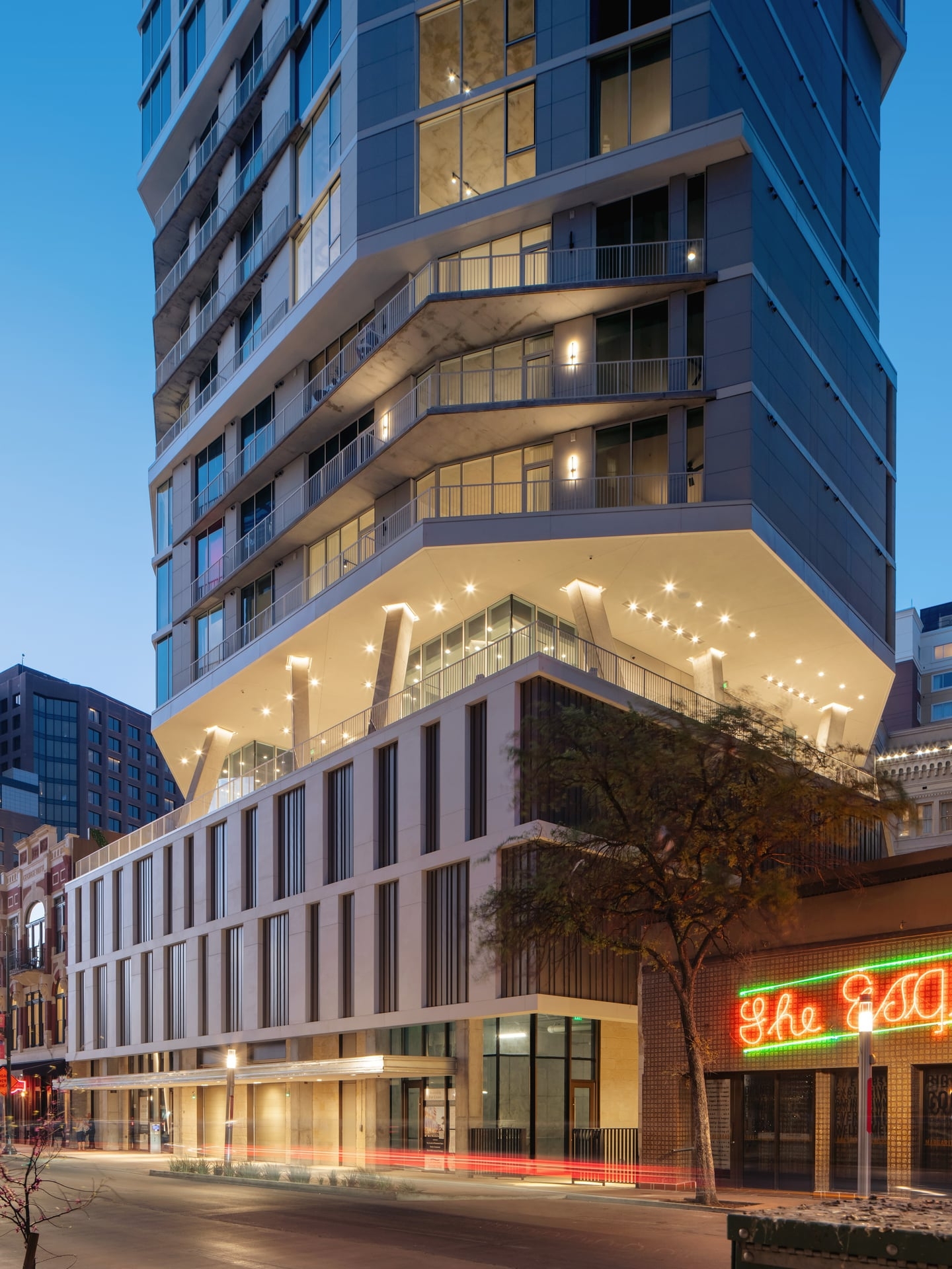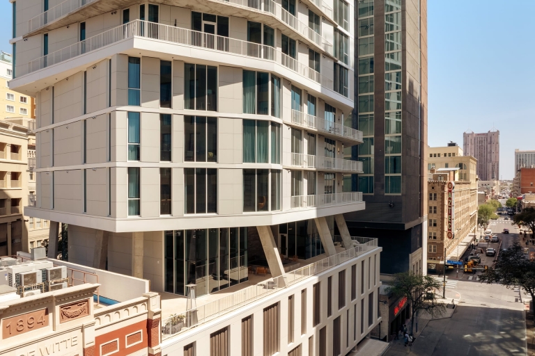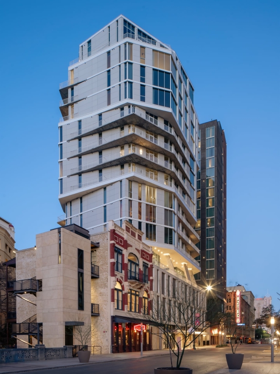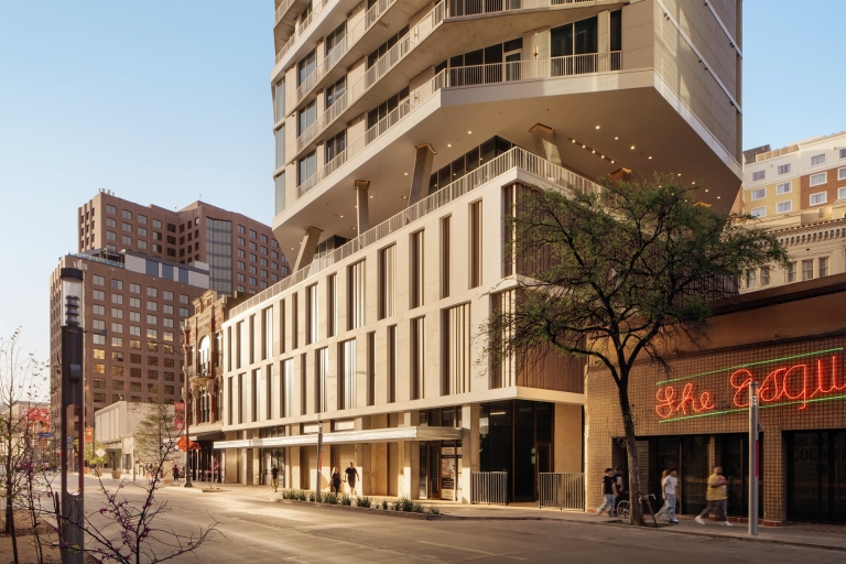 Located on a dense urban site, Floodgate is a sculptural apartment tower in San Antonio, Texas. Floodgate features twisting floorplates that respond to various viewsheds throughout the city and preserve daylight on the River Walk below. A fully autonomous vehicle parking system, housed on two levels above the ground floor, is the first implementation of this technology in Texas and can be repurposed for housing in the future should parking become obsolete.