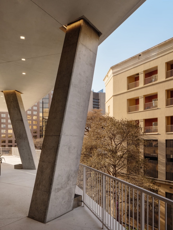 At the river level, the limestone block of a historic floodwall is restored and reincorporated into a new series of walls and portals holding to the original wall line. Floating above this patio is a balcony for the upper restaurant, which also provides outdoor seating in a dramatically narrow space along the sidewalk next to the newly exposed stone demising wall of the adjacent historic building, connecting the urban thoroughfare of Commerce Street with the River Walk.