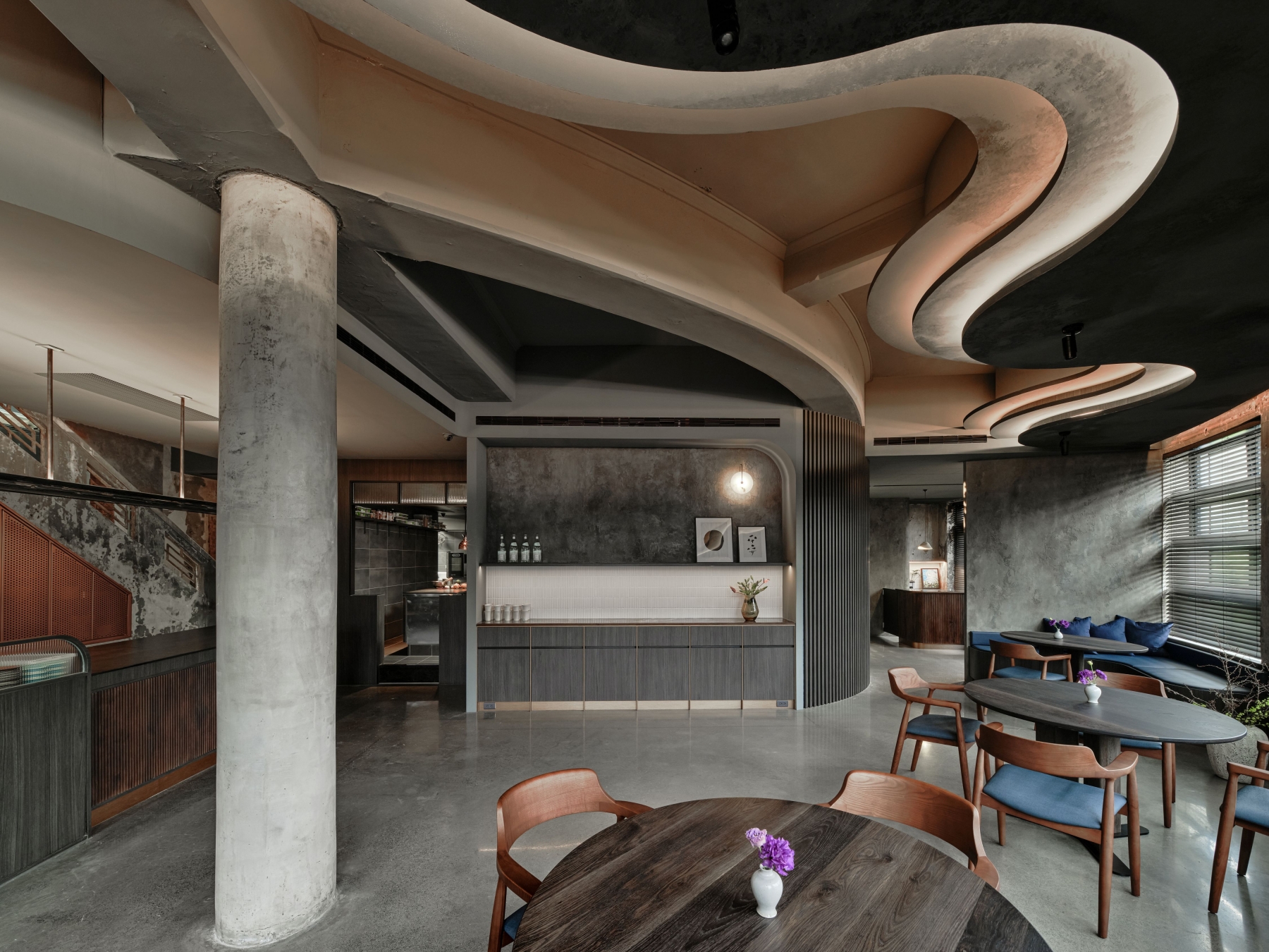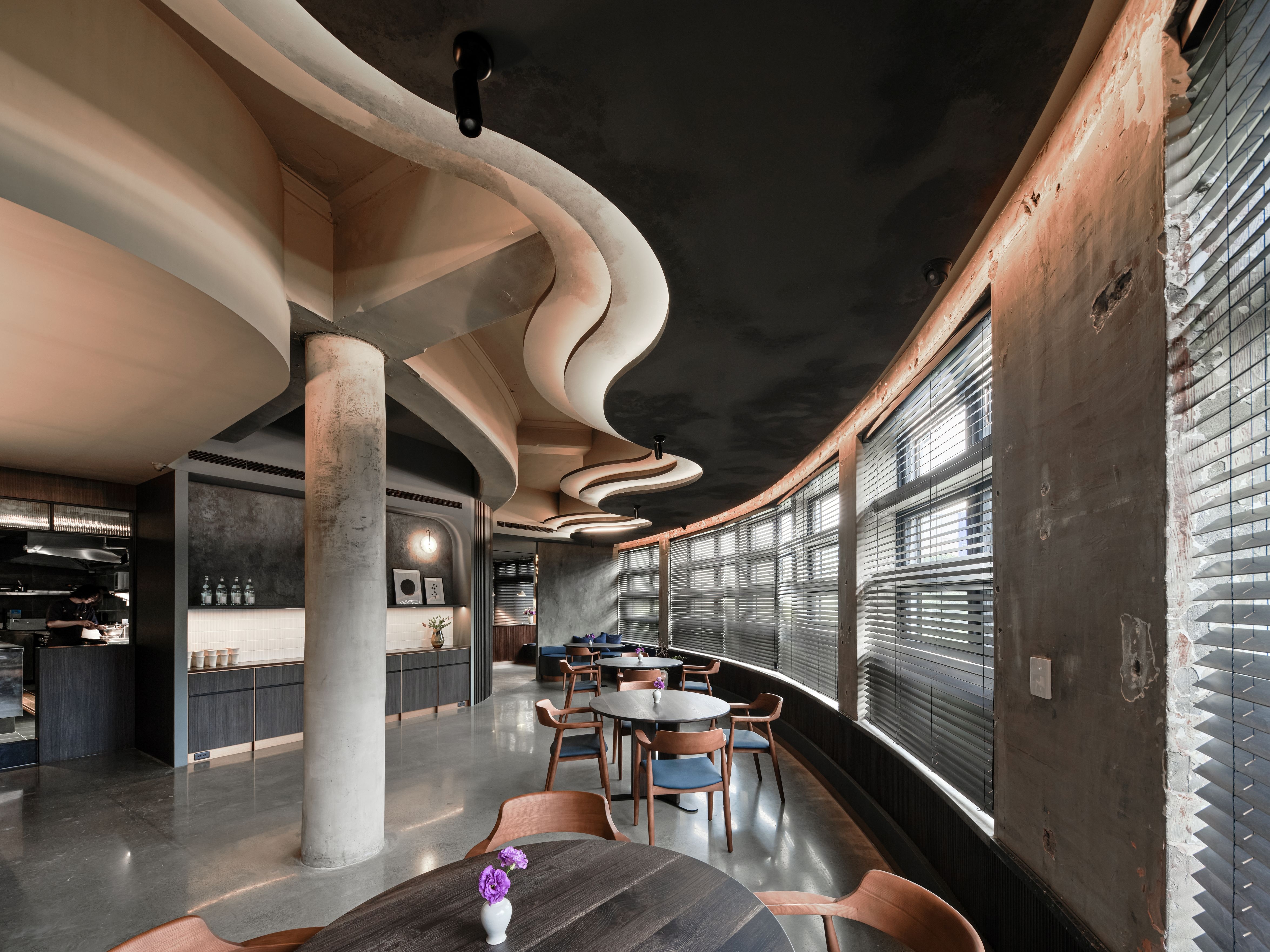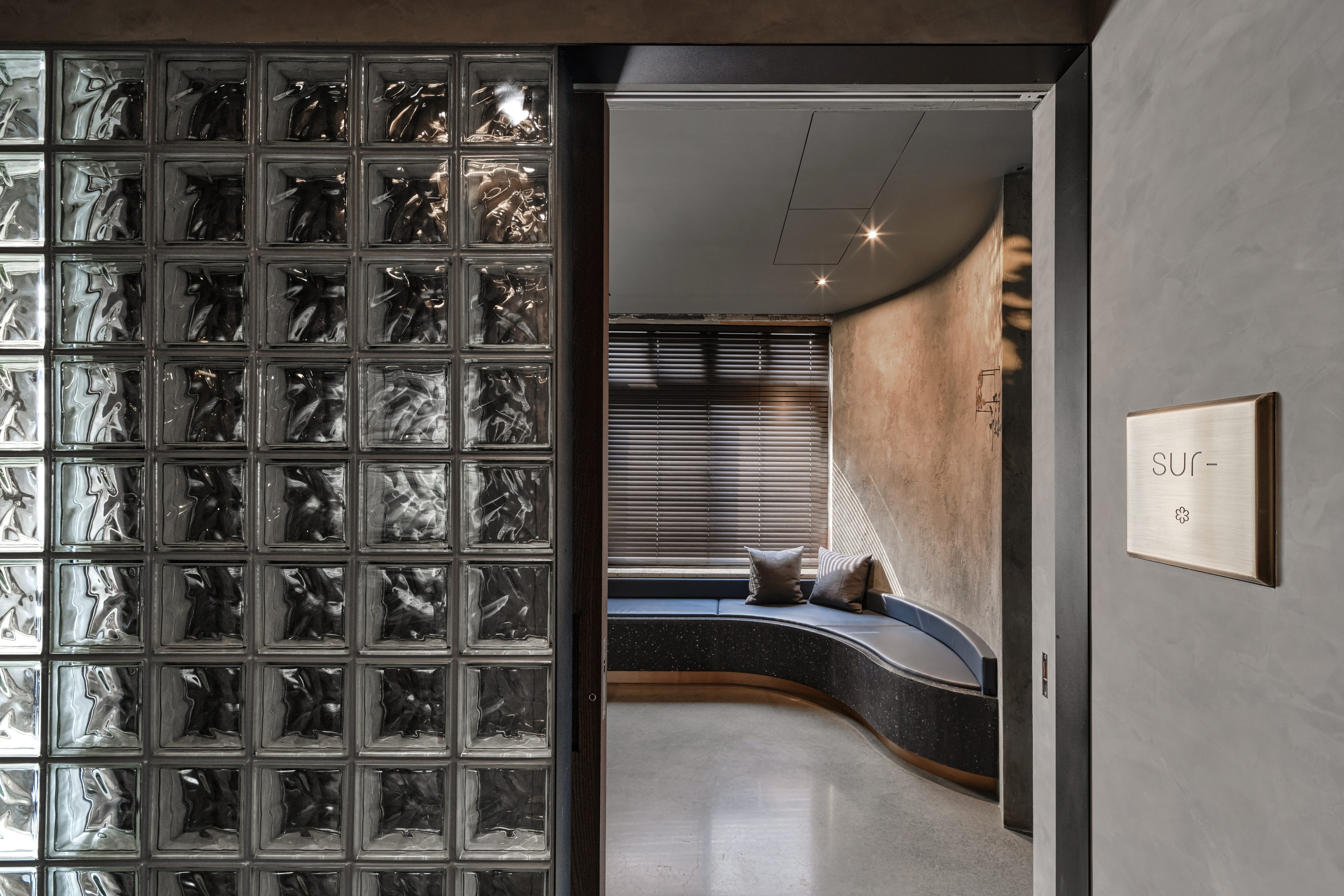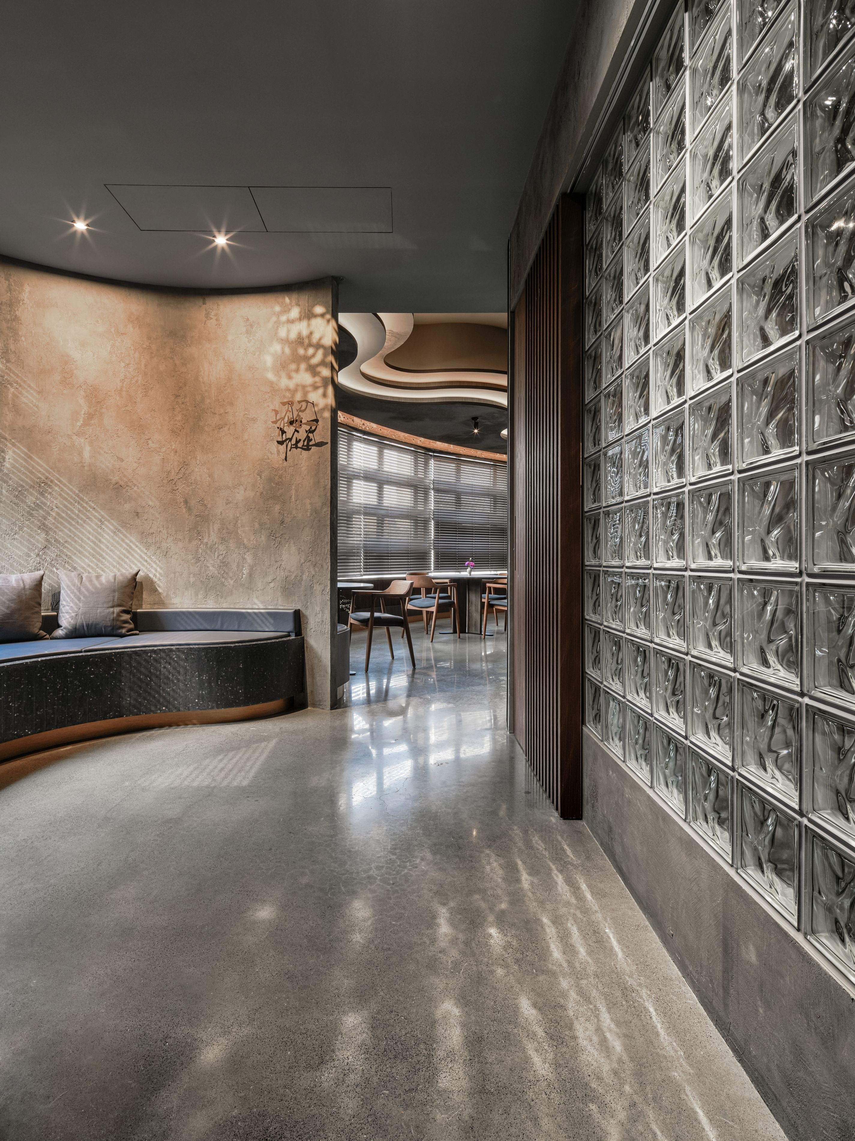 SUR restaurant is located along the Green River in Taichung, in a building that once housed a 1950s soap factory. The design concept, “infinite continuation,” reflects the chef’s philosophy of culinary innovation and initiates a dialogue between contemporary design language and historical architecture. Original structural elements—circular columns, arched beams, and exposed concrete walls—are preserved, allowing the passage of time to become part of the space’s aesthetic. A wave-like ceiling symbolizes the flow of creativity, enhanced by layered lighting in three color temperatures that create a dynamic play of light and shadow. Five dining tables are arranged around an open kitchen, representing the outward expansion of culinary inspiration from a central source. The use of reclaimed Taiwanese cedar and traditional joinery craftsmanship infuses local culture into the dining experience. A wall of glass bricks at the entrance serves as a transitional threshold, guiding guests across time into a contemporary expression of memory, creativity, and the senses. SUR is not merely a restaurant—it is a cultural space that bridges the past and the future.