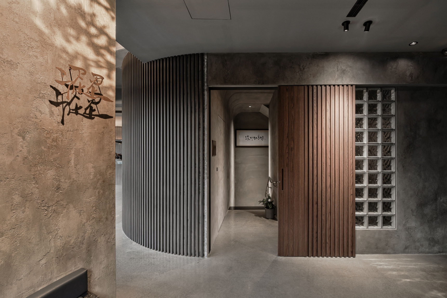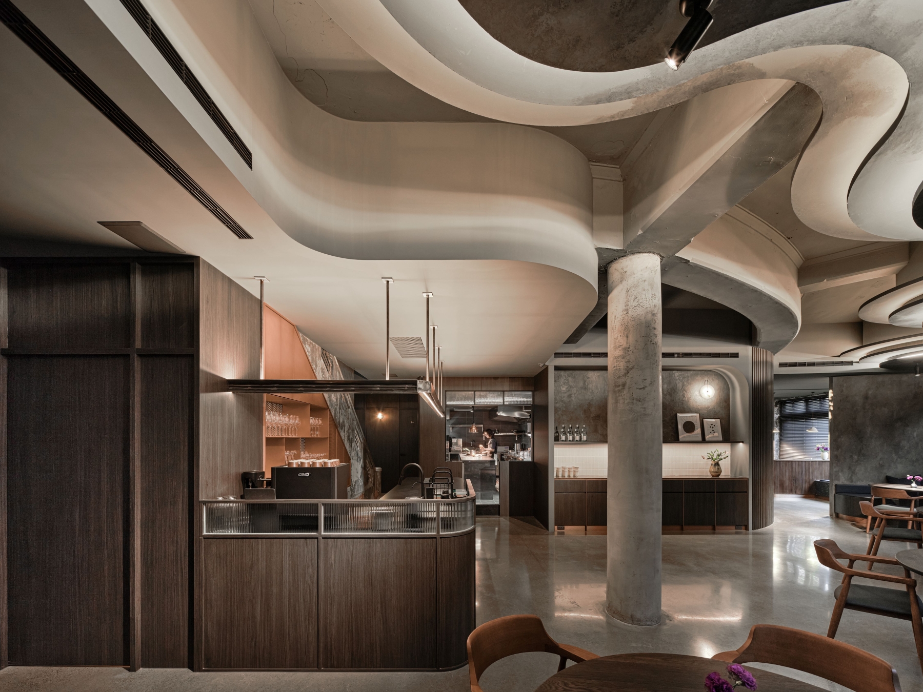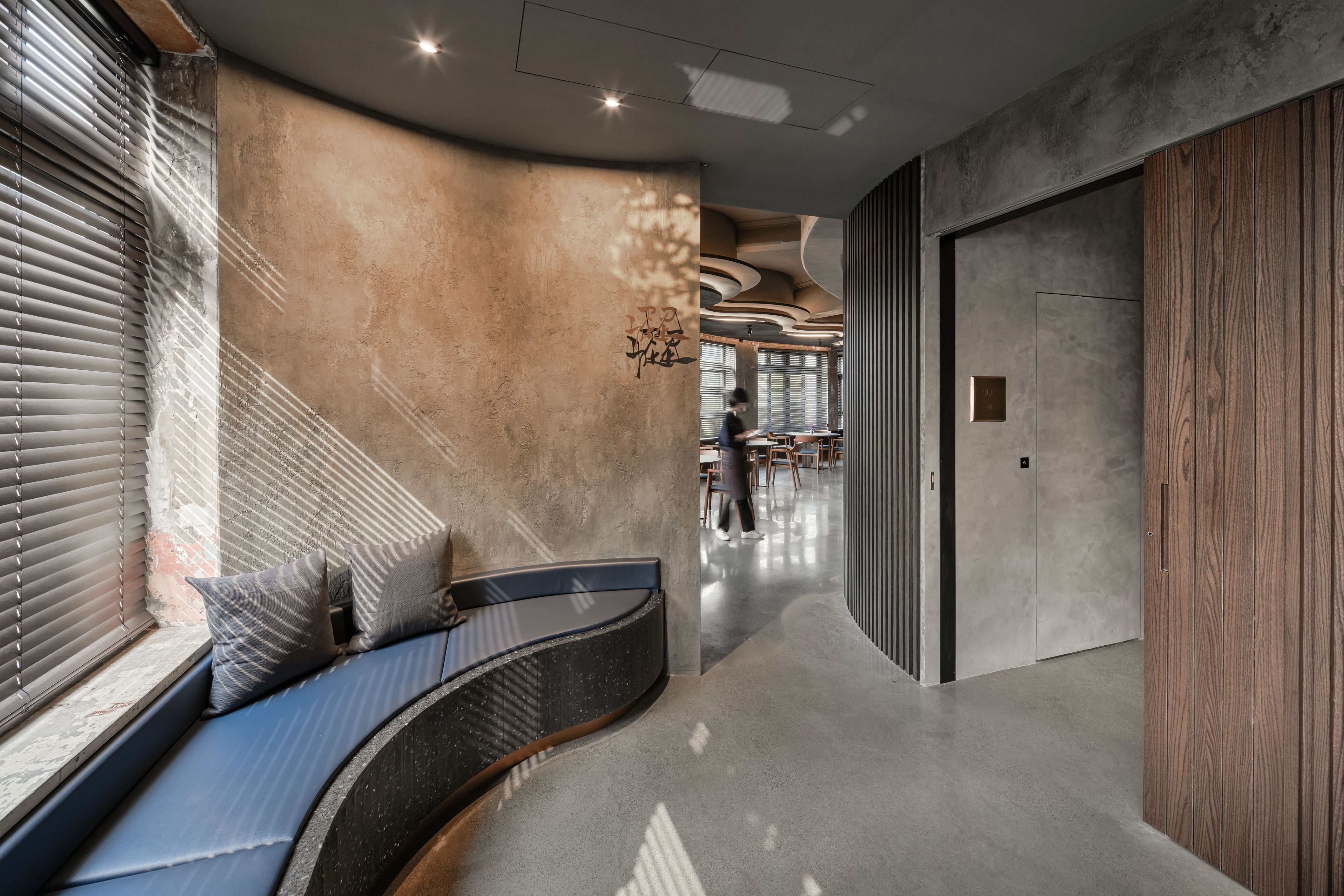 SUR restaurant is located along the Green River in Taichung, in a building that once housed a 1950s soap factory. The design concept, “infinite continuation,” reflects the chef’s philosophy of culinary innovation and initiates a dialogue between contemporary design language and historical architecture. Original structural elements—circular columns, arched beams, and exposed concrete walls—are preserved, allowing the passage of time to become part of the space’s aesthetic. A wave-like ceiling symbolizes the flow of creativity, enhanced by layered lighting in three color temperatures that create a dynamic play of light and shadow. Five dining tables are arranged around an open kitchen, representing the outward expansion of culinary inspiration from a central source. The use of reclaimed Taiwanese cedar and traditional joinery craftsmanship infuses local culture into the dining experience. A wall of glass bricks at the entrance serves as a transitional threshold, guiding guests across time into a contemporary expression of memory, creativity, and the senses. SUR is not merely a restaurant—it is a cultural space that bridges the past and the future.