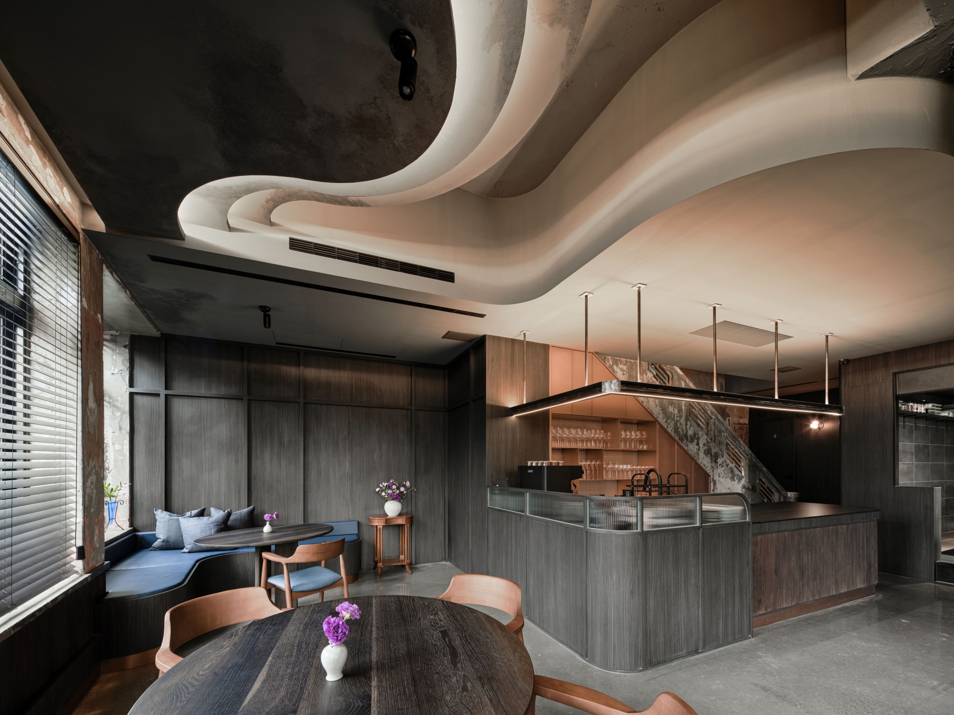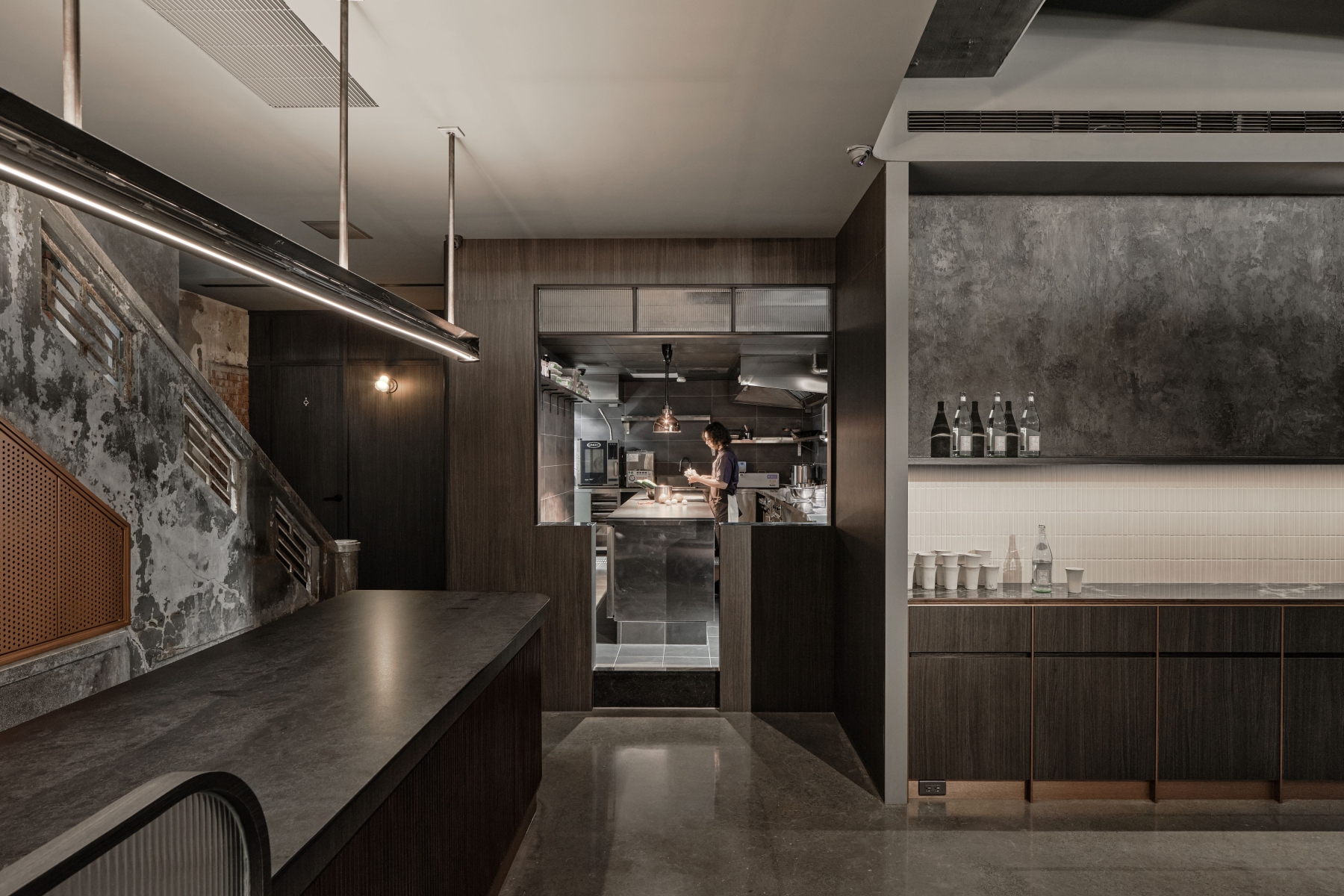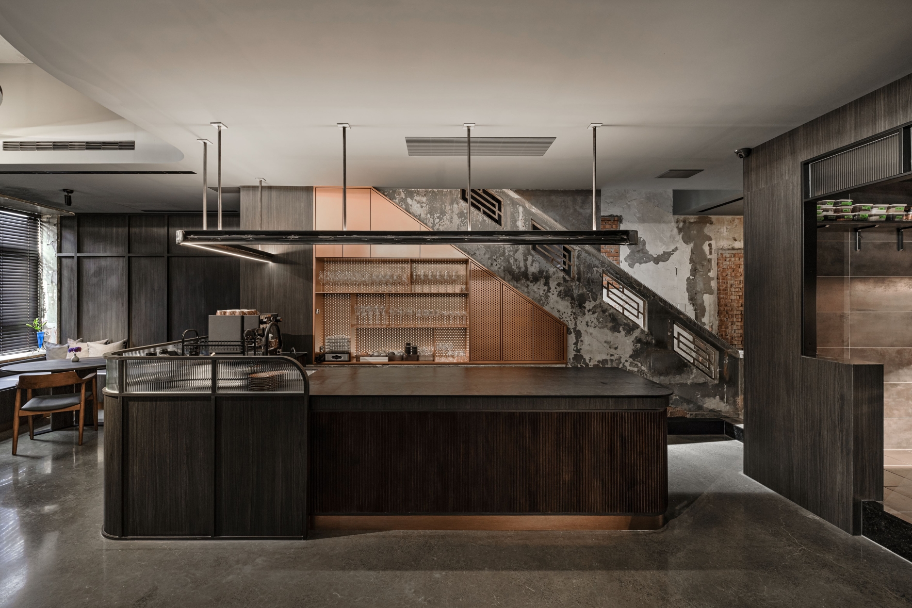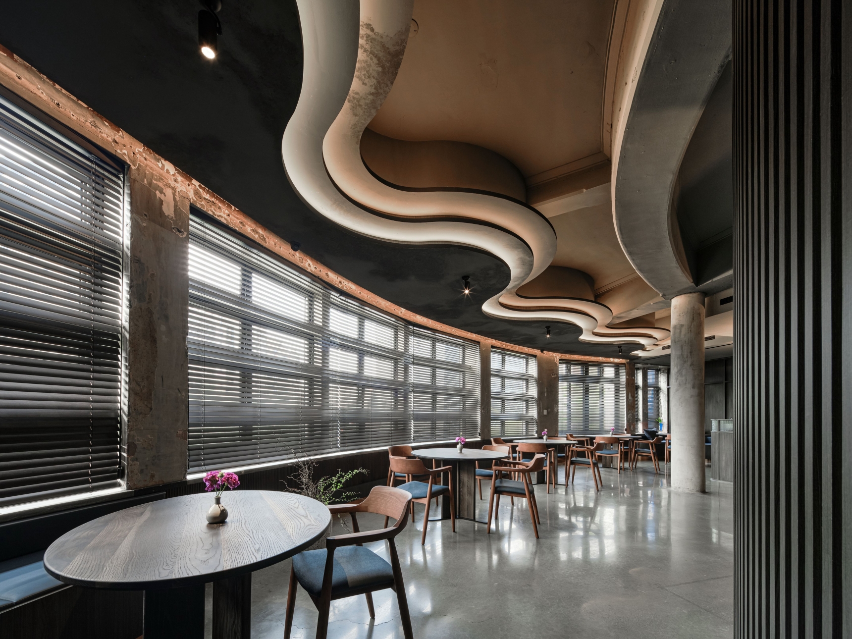 SUR restaurant is located along the Green River in Taichung, in a building that once housed a 1950s soap factory. The design concept, “infinite continuation,” reflects the chef’s philosophy of culinary innovation and initiates a dialogue between contemporary design language and historical architecture. Original structural elements—circular columns, arched beams, and exposed concrete walls—are preserved, allowing the passage of time to become part of the space’s aesthetic. A wave-like ceiling symbolizes the flow of creativity, enhanced by layered lighting in three color temperatures that create a dynamic play of light and shadow. Five dining tables are arranged around an open kitchen, representing the outward expansion of culinary inspiration from a central source. The use of reclaimed Taiwanese cedar and traditional joinery craftsmanship infuses local culture into the dining experience. A wall of glass bricks at the entrance serves as a transitional threshold, guiding guests across time into a contemporary expression of memory, creativity, and the senses. SUR is not merely a restaurant—it is a cultural space that bridges the past and the future.