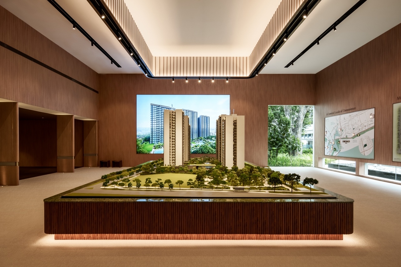 Set in eastern Singapore near the country’s most iconic beach, Emerald of Katong is a luxurious condominium with a sales gallery designed to evoke a refined resort atmosphere. Named by the client, the project embraces green as its accent colour—echoing the "emerald" and reinforcing its connection to nature.