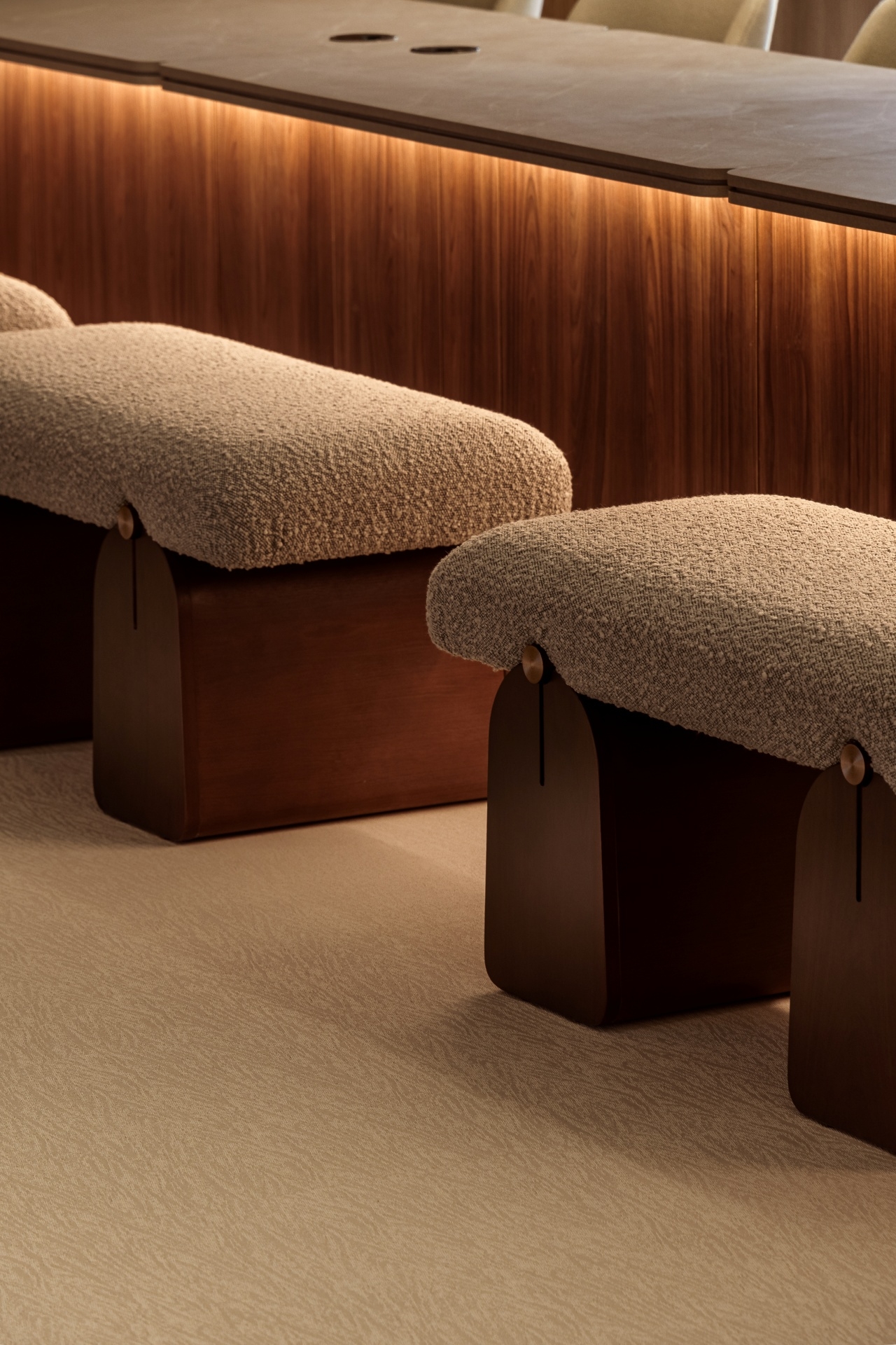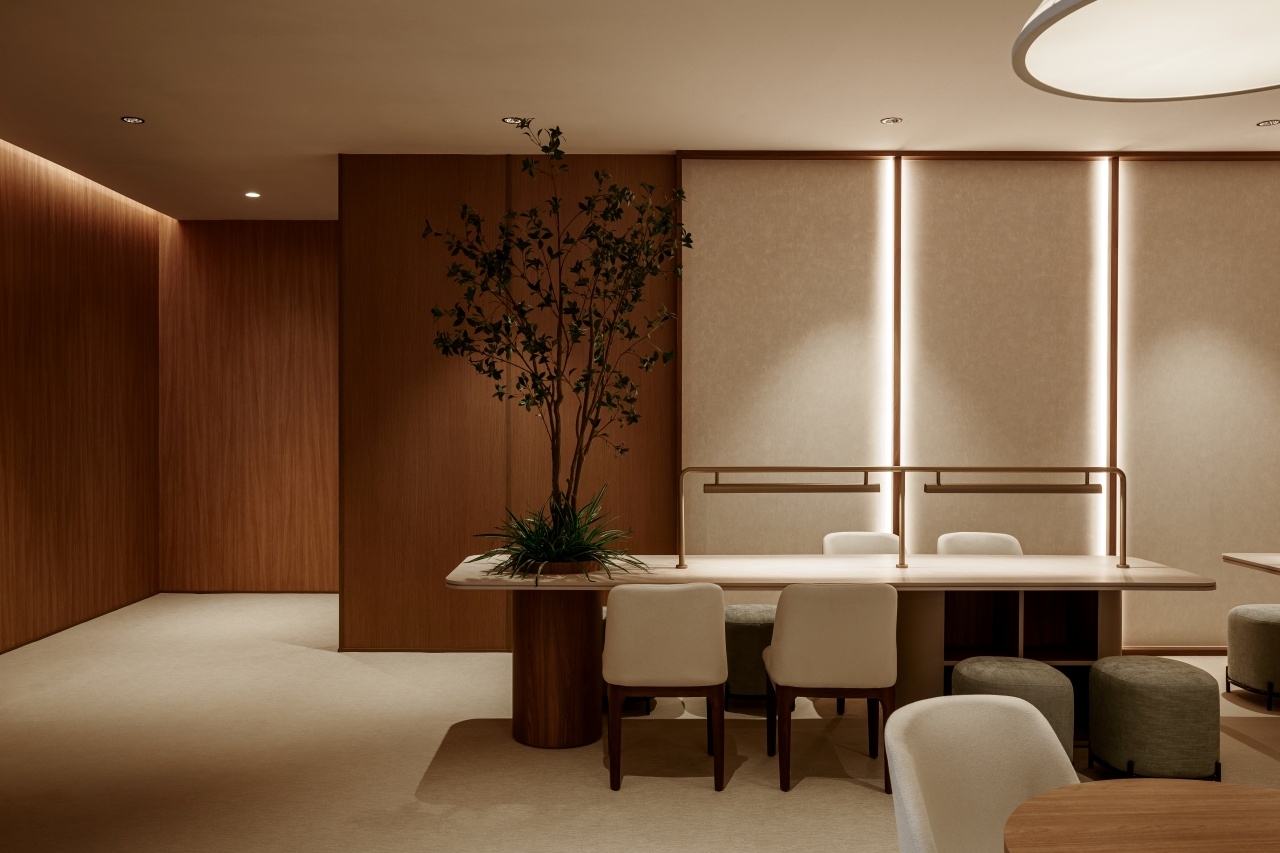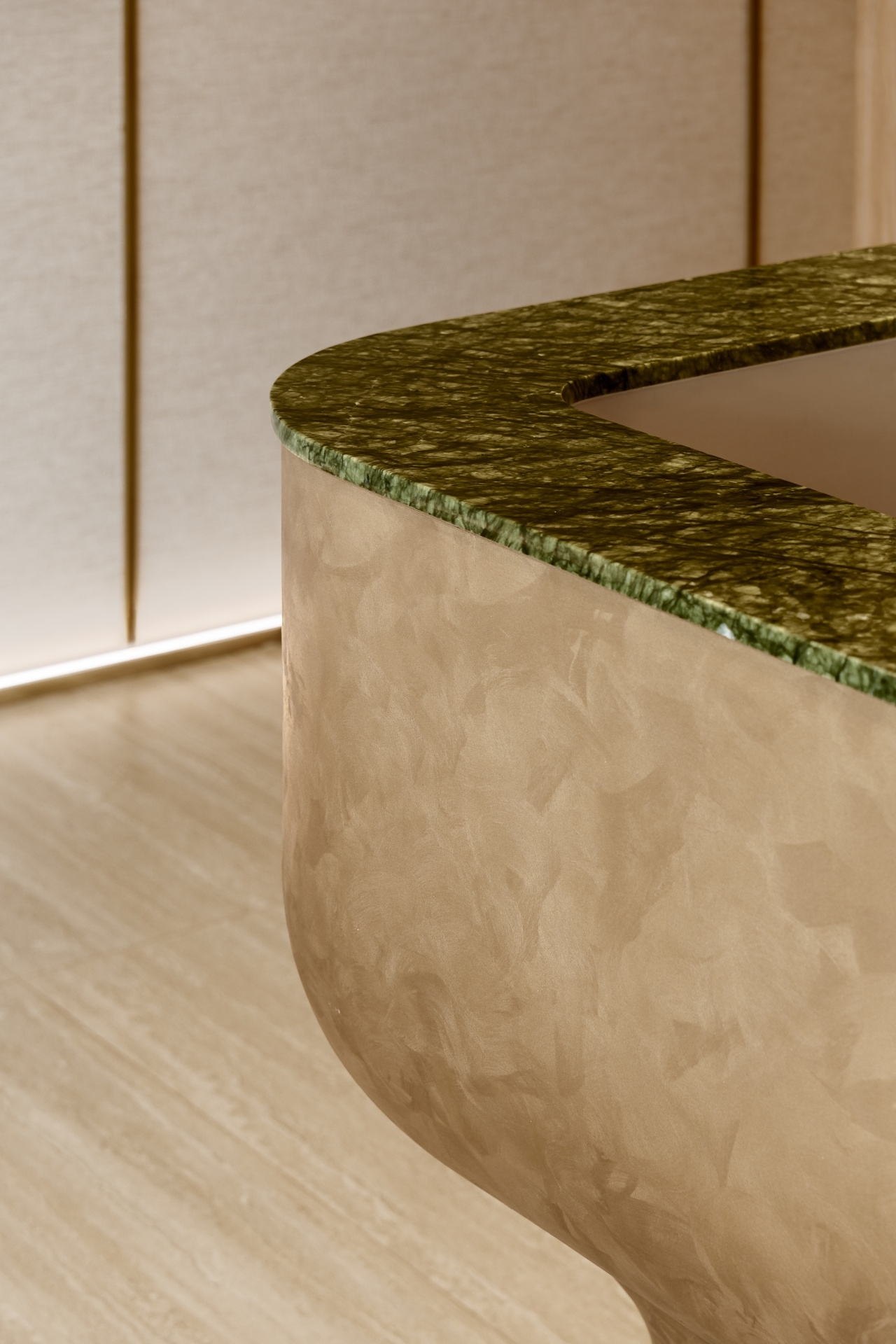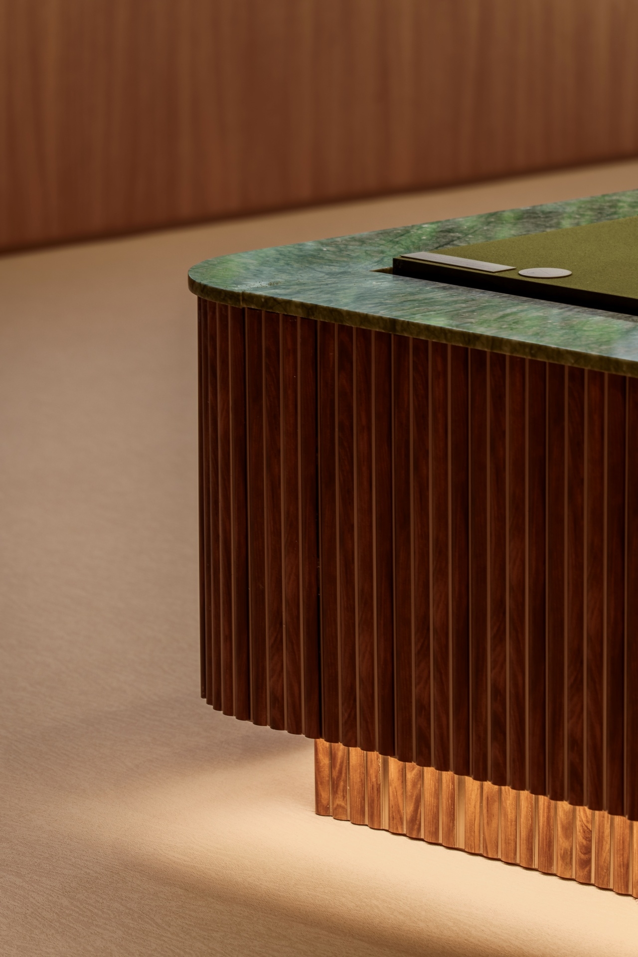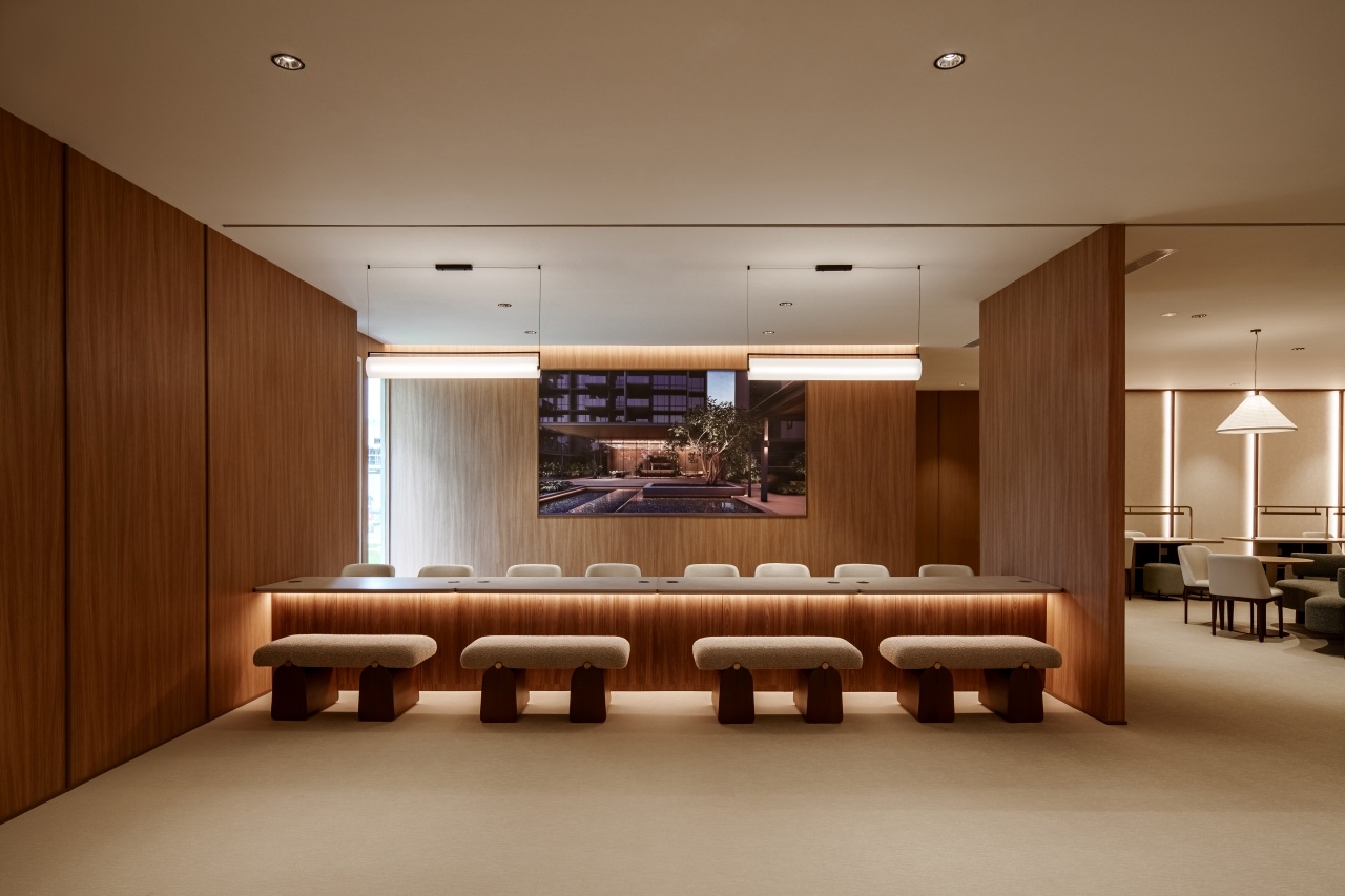 Natural wood paneling and green marble continue into the model area, creating a cohesive visual identity. Wooden screens with metal inlays subtly guide visitors toward the discussion zone. Upthrown lighting softens the overall ambiance, while thoughtfully designed semi-private pockets add depth and encourage exploration.