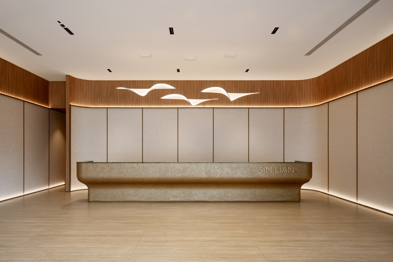 The reception area is intentionally understated, featuring soft lighting and a sculptural, custom reception counter finished in textured metallic paint with a green marble top. Above, pendant lights shaped like birds in flight add a poetic, idyllic touch.