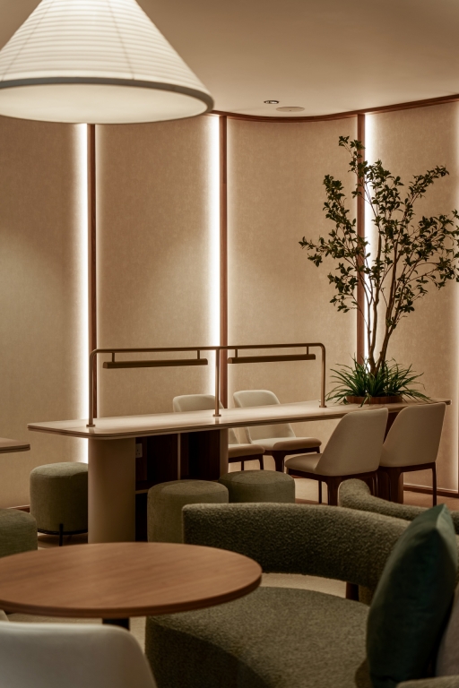 Lush indoor greenery, seamlessly integrated with the furniture, reinforces the project’s coastal inspiration—bringing nature indoors in a modern, elegant way.