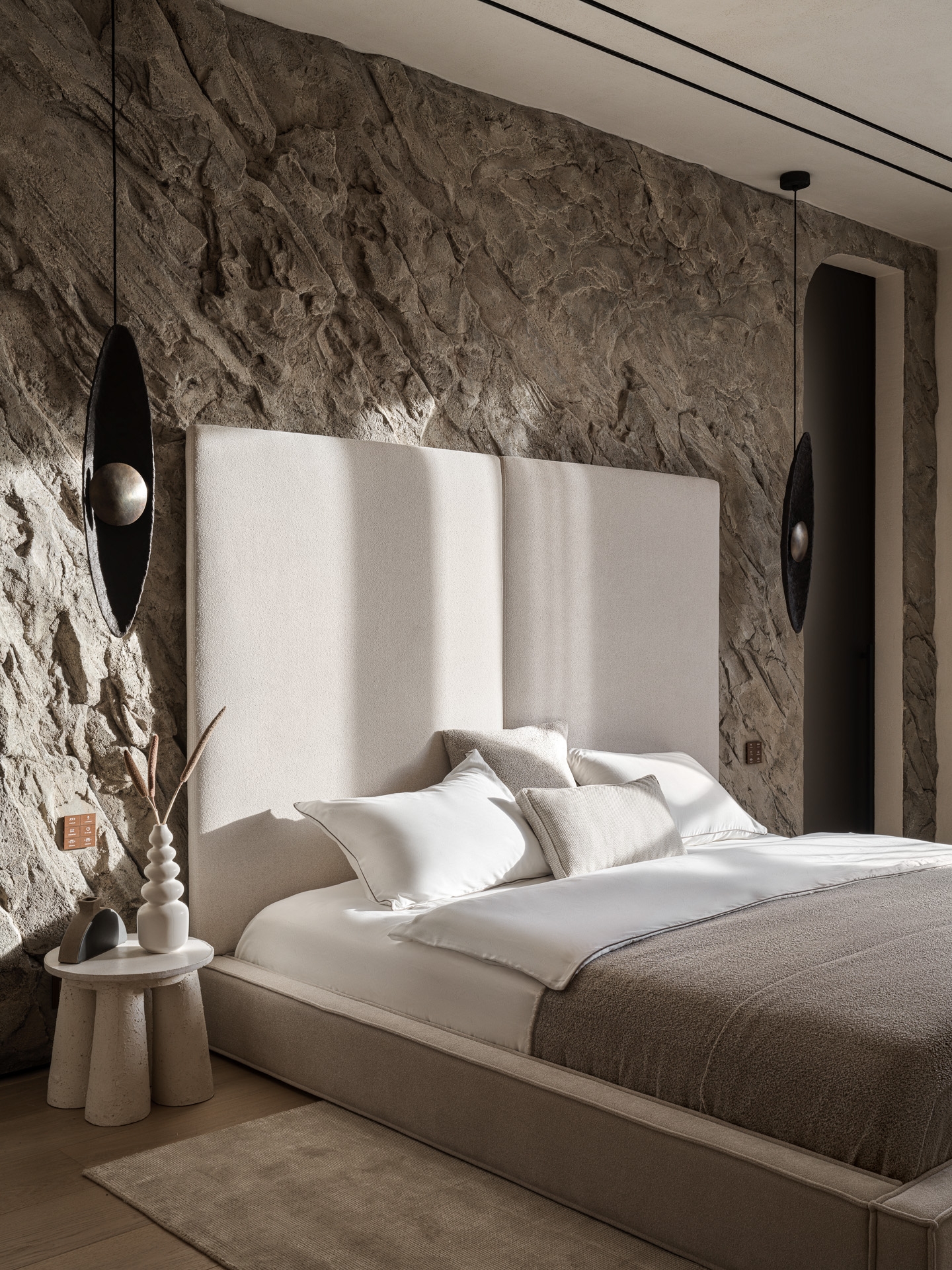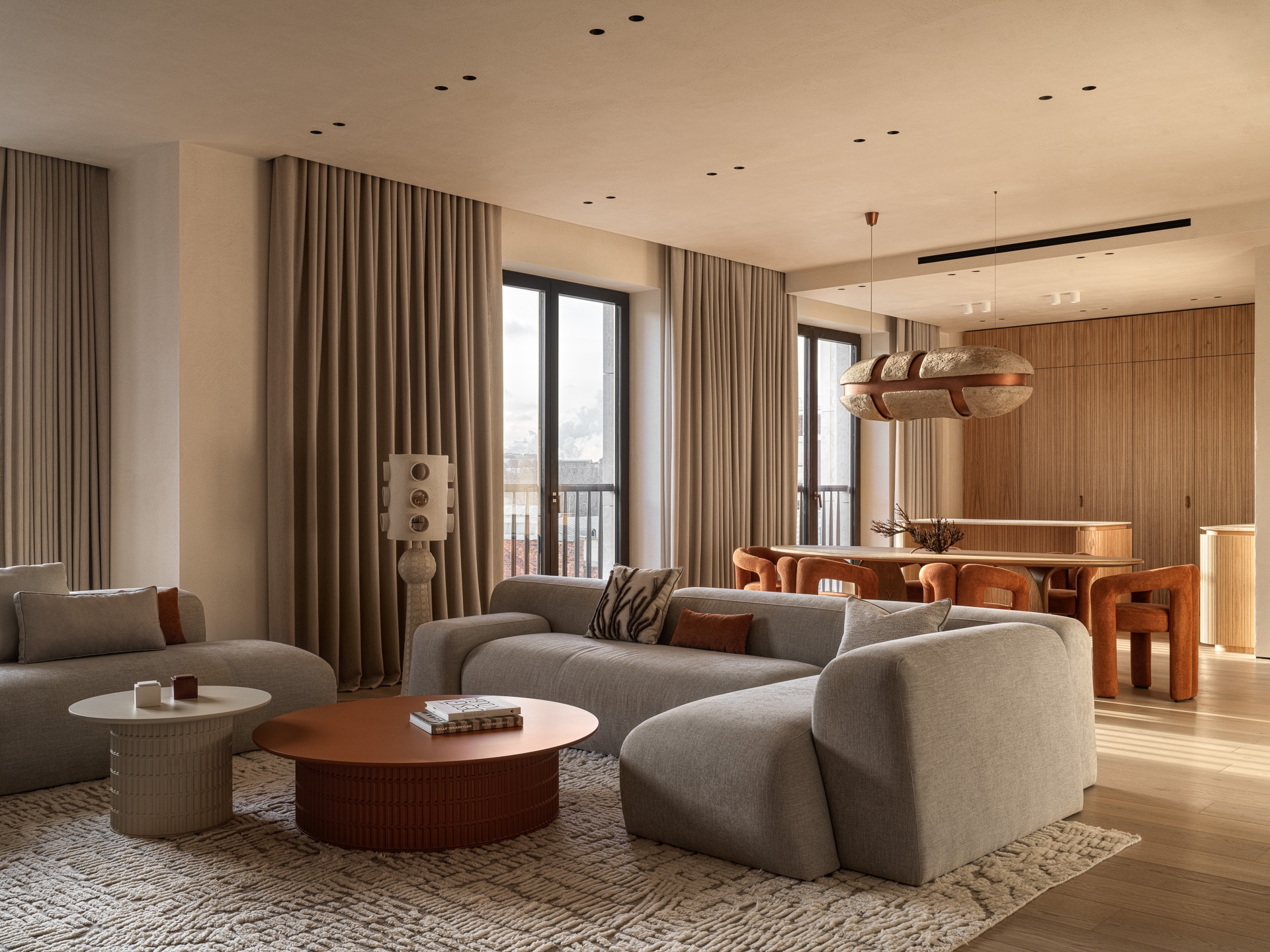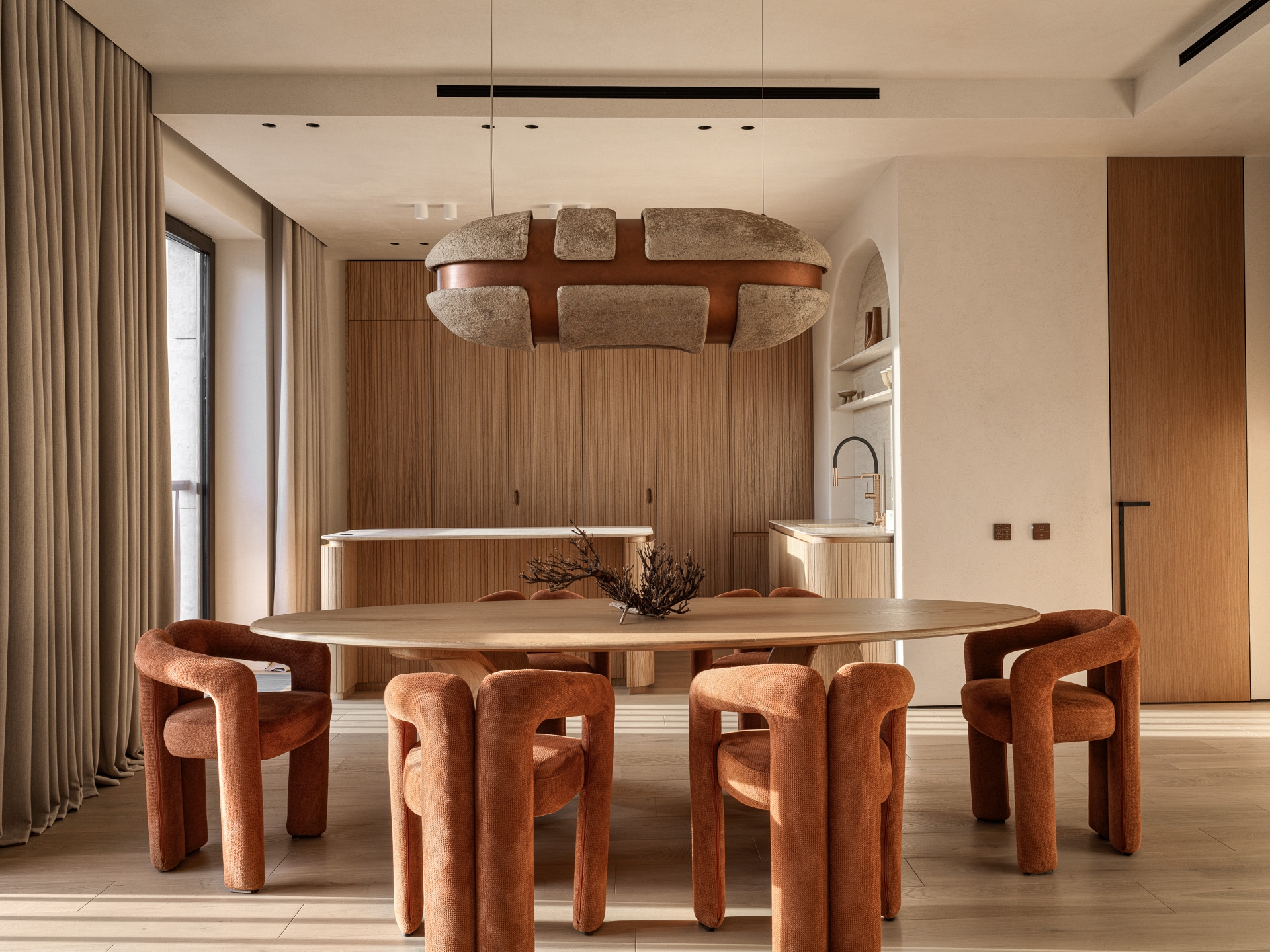 The project was a real challenge for me - to create an interior in the Japandi style, which at the time I started work was still rare and unusual for residential properties. The design is based on natural materials, textures and calm natural shades. Many elements - from lamps to decorative panels - are handmade according to the author's sketches, which gives the interior a special uniqueness. Among them are ‘stone’ lamps, ‘rocks’ on the walls, felt and wool products and art objects. This creative approach filled the space with warmth and soulfulness. I make interiors as if for myself. As a result, we got the most logical and comfortable configuration of rooms, where each element of the interior is filled with meaning and carefully thought out. This project became not just a job, but a real creative union between the designer and the clients. The result is a timeless interior.