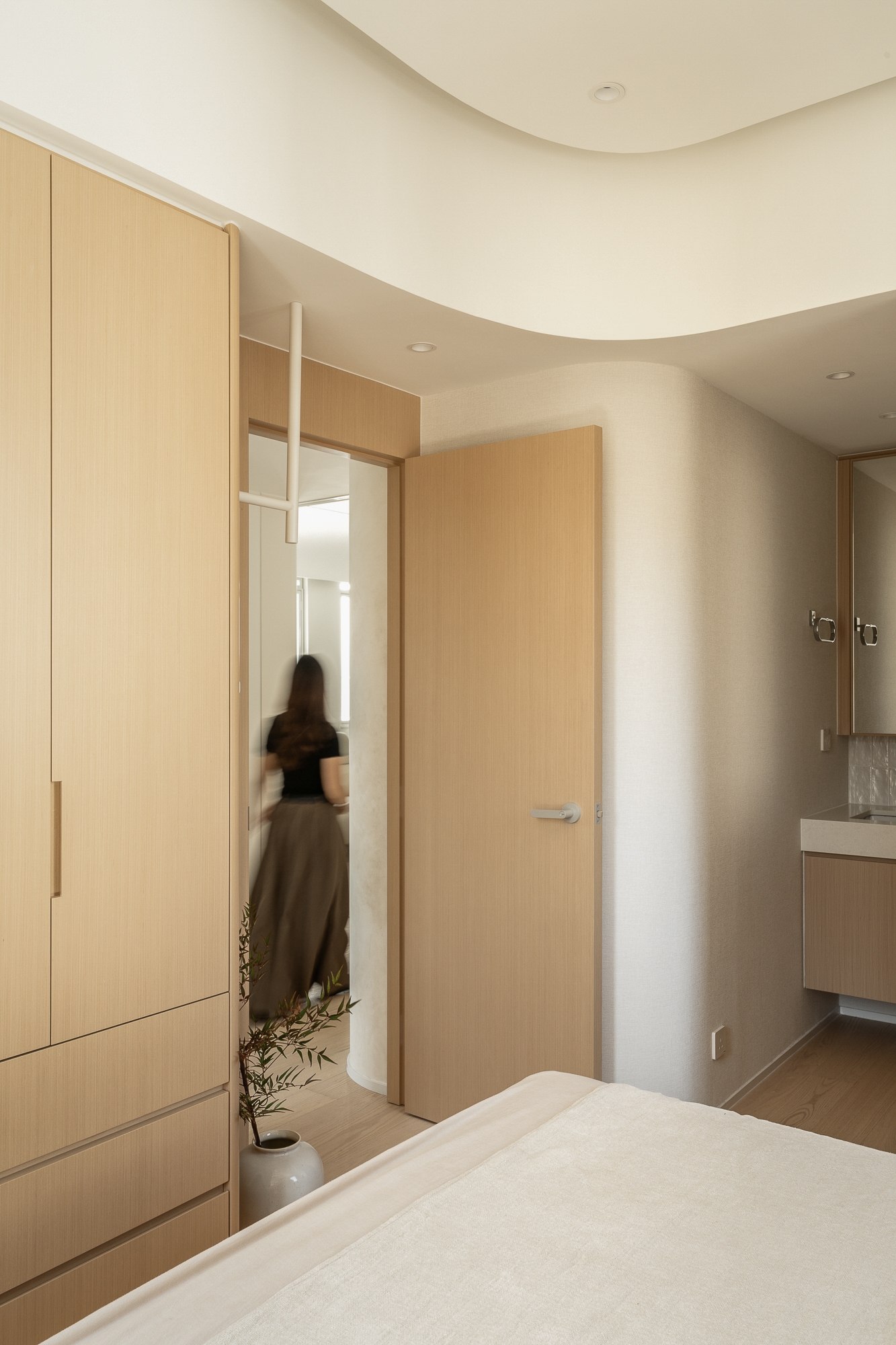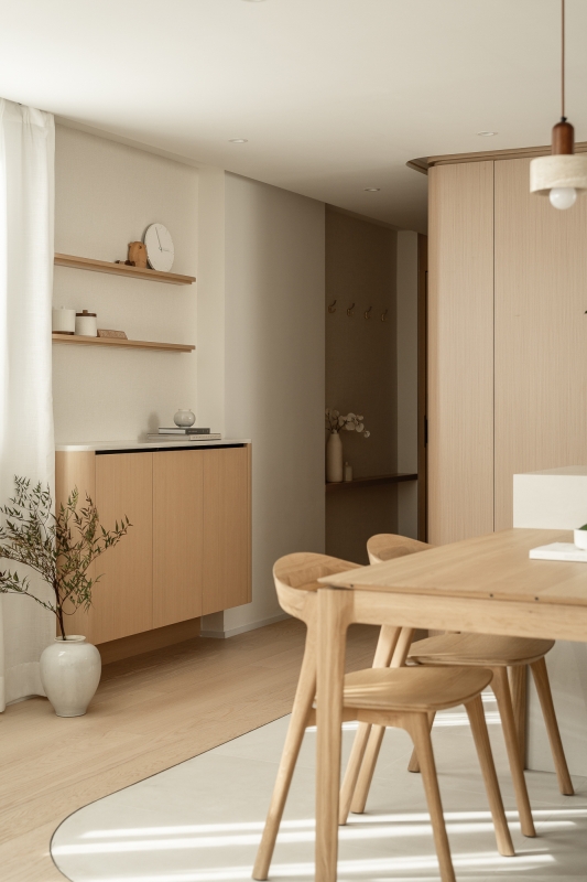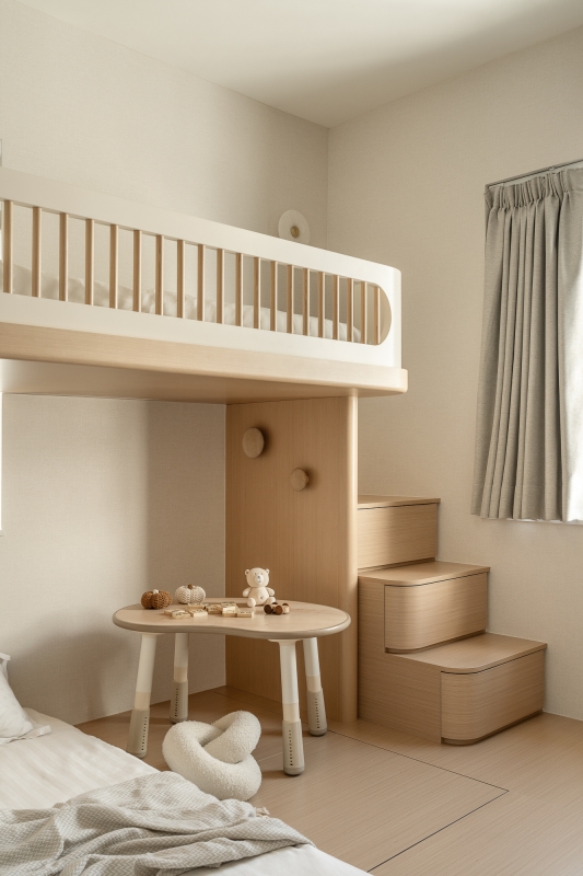 Pale oak timber, mineral-based wall finishes, and soft off-white tones form the material core of the project, offering a muted yet tactile palette that mediates between calm and resilience. Rounded wall edges soften transitions between zones, while furniture selections in natural oak maintain a consistent visual language across the interior. Dedicated spaces for children include a bunk bed arrangement to offer future flexibility, while an adjacent nursery — positioned beside the helper’s room — enables seamless caregiving.