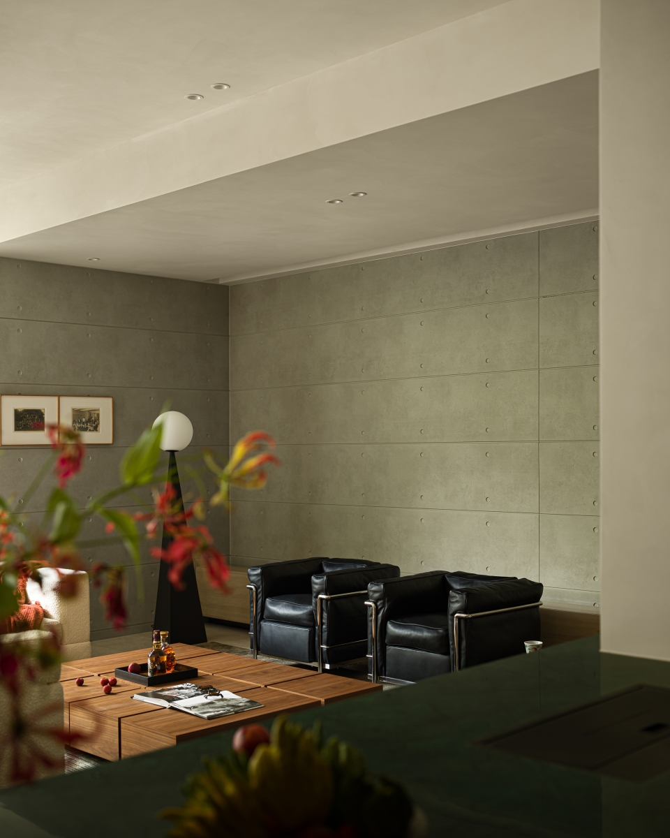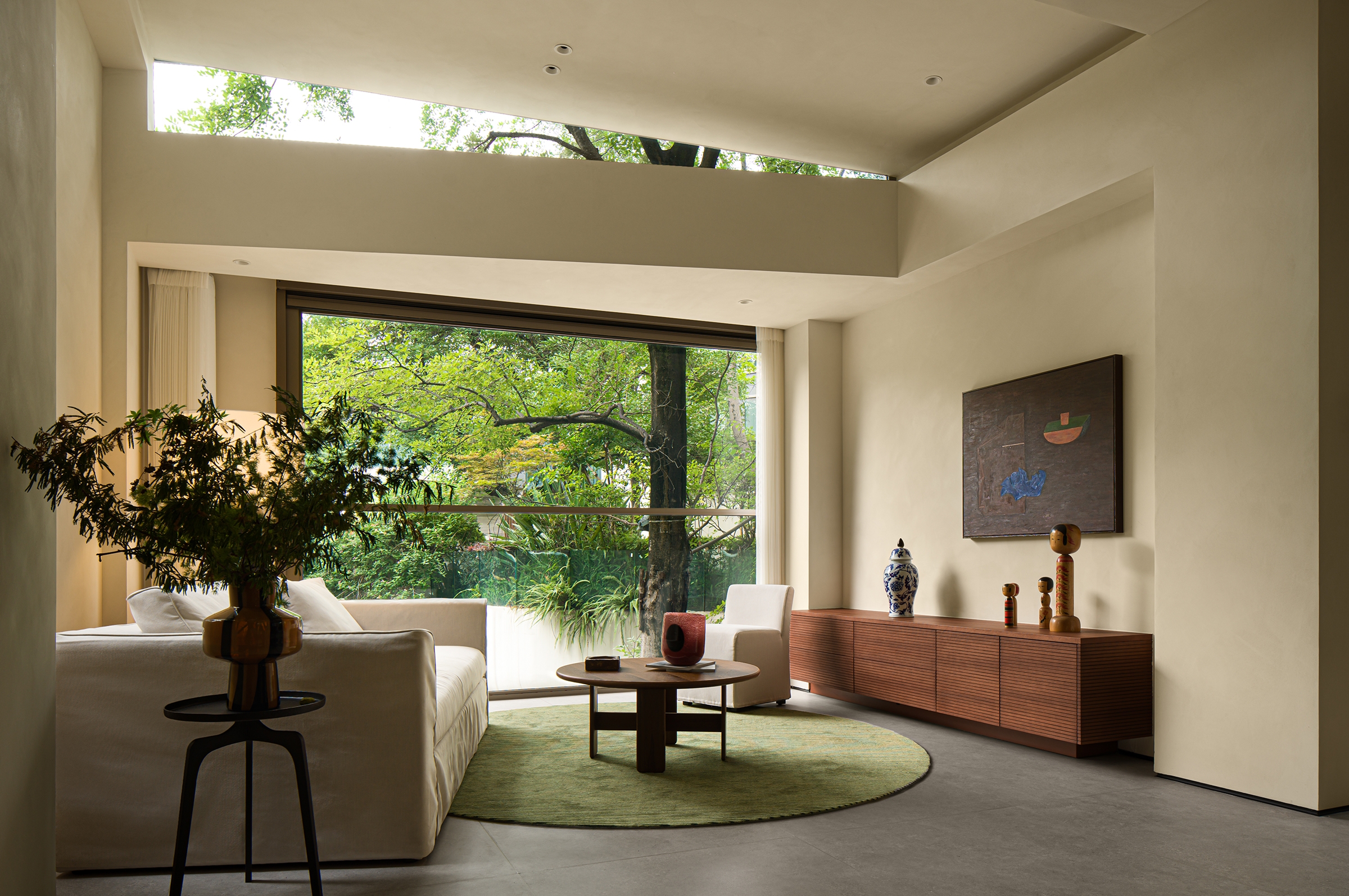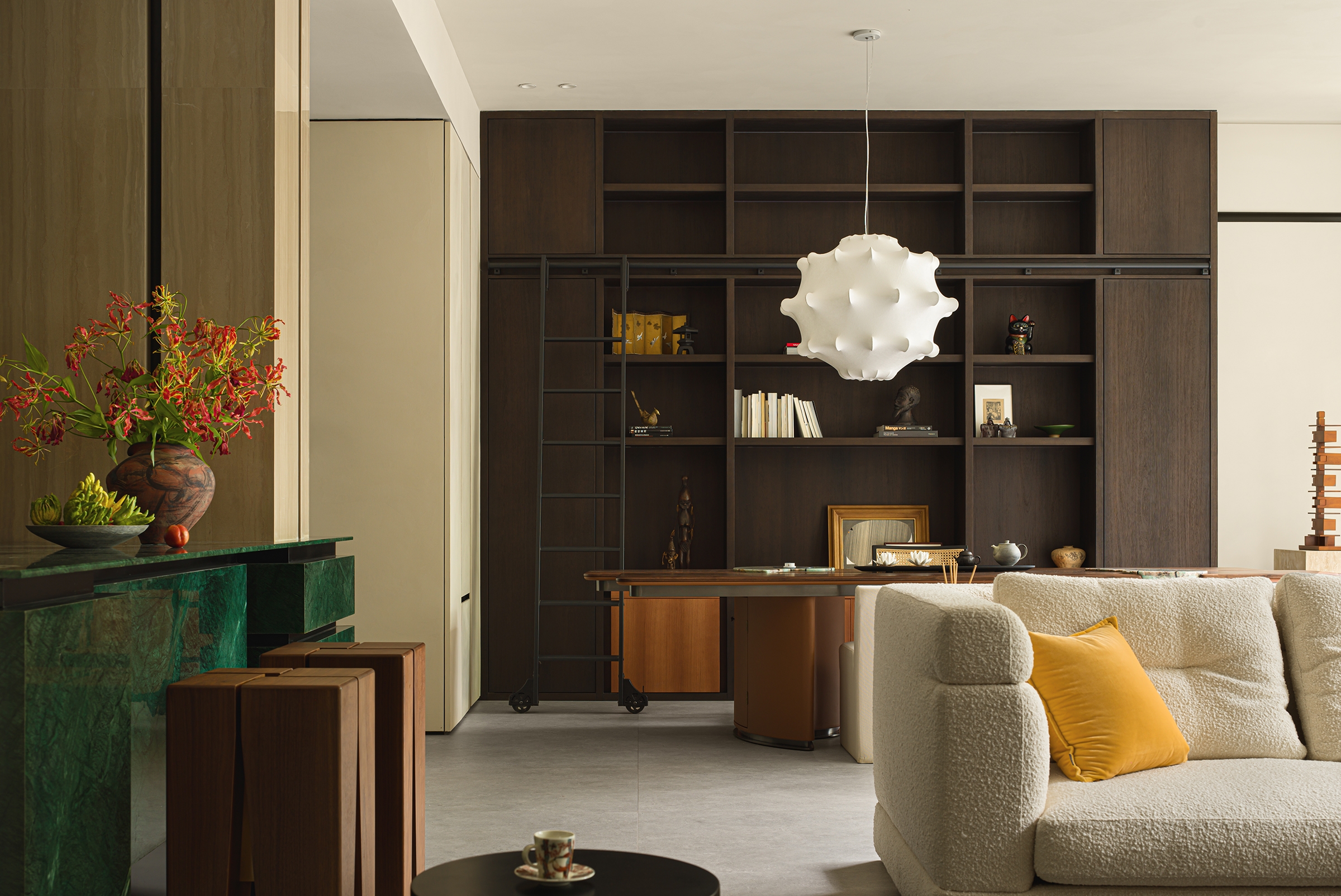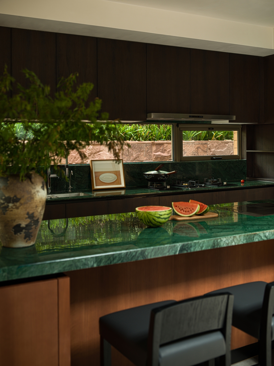 The design concept is rooted in respect and understanding of the natural environment. Vegetation is cleverly used in the courtyard, and the landscape changes with the passage of time, offering various levels of diversity. The garden centers around “trees,” creating a natural oxygen bar and creating an approachable reception area under the trees. Newly constructed low walls enhance the sense of enclosure and security, allowing for a comfortable flow of movement. The interior features a warm white color palette, interspersed with natural, textured surfaces. The elegant black walnut wood veneer and stunning green stone surfaces complement the space, while materials like natural stone with a foamy aluminum texture add richness to the space’s layers, creating visual punctuations. The deep-colored finishes exudes a dark luster, alternating with the white walls to create a visual illusion of three-dimensional and two-dimensional transformation within the space. The delicate and rich textures exude an extraordinary sense of grace. Through the changes in light and shadow, the designer imbued each room with a unique atmosphere and story.