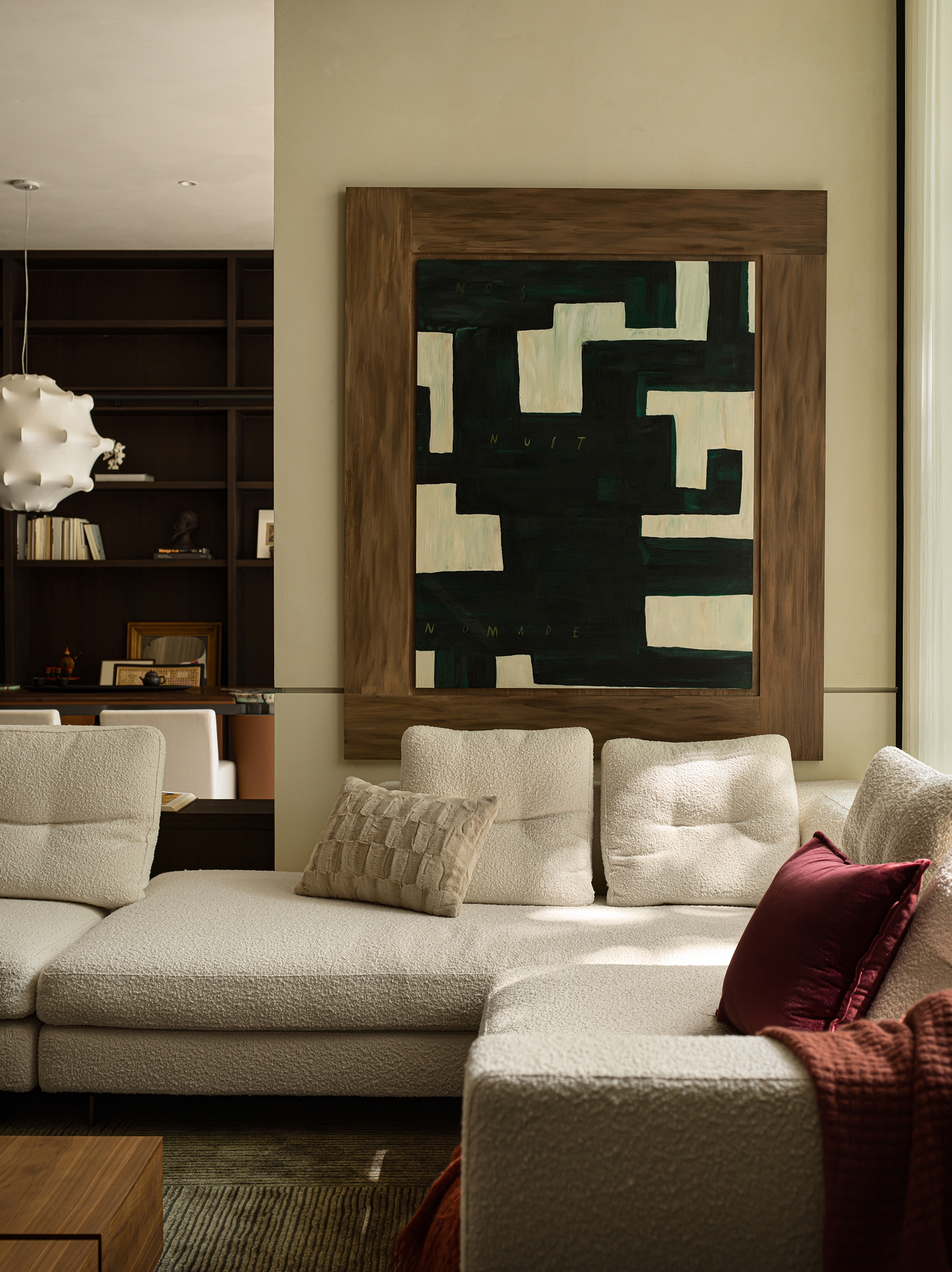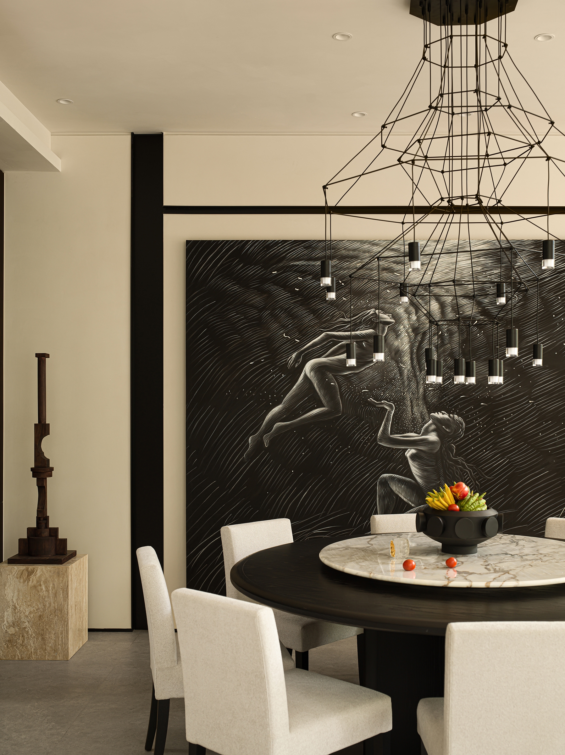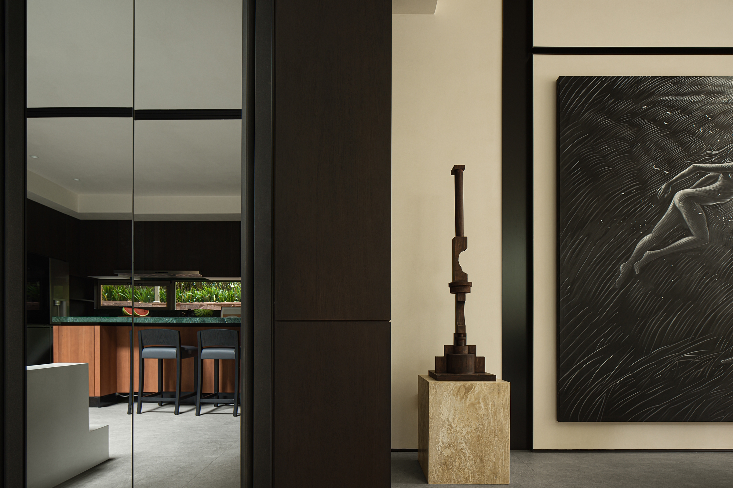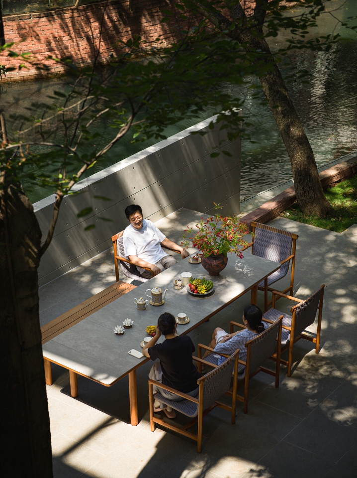 The design concept is rooted in respect and understanding of the natural environment. Vegetation is cleverly used in the courtyard, and the landscape changes with the passage of time, offering various levels of diversity. The garden centers around “trees,” creating a natural oxygen bar and creating an approachable reception area under the trees. Newly constructed low walls enhance the sense of enclosure and security, allowing for a comfortable flow of movement. The interior features a warm white color palette, interspersed with natural, textured surfaces. The elegant black walnut wood veneer and stunning green stone surfaces complement the space, while materials like natural stone with a foamy aluminum texture add richness to the space’s layers, creating visual punctuations. The deep-colored finishes exudes a dark luster, alternating with the white walls to create a visual illusion of three-dimensional and two-dimensional transformation within the space. The delicate and rich textures exude an extraordinary sense of grace. Through the changes in light and shadow, the designer imbued each room with a unique atmosphere and story.