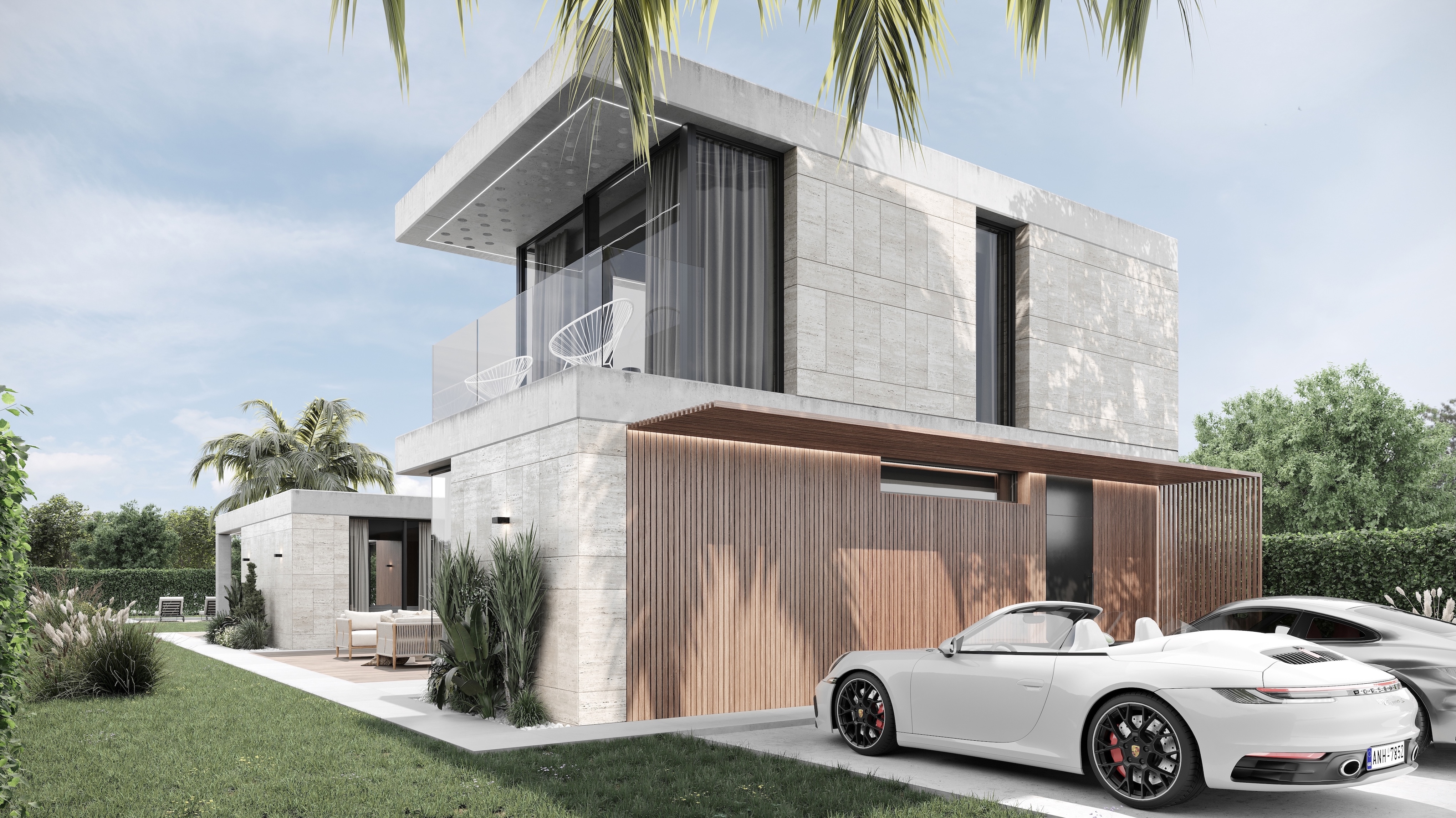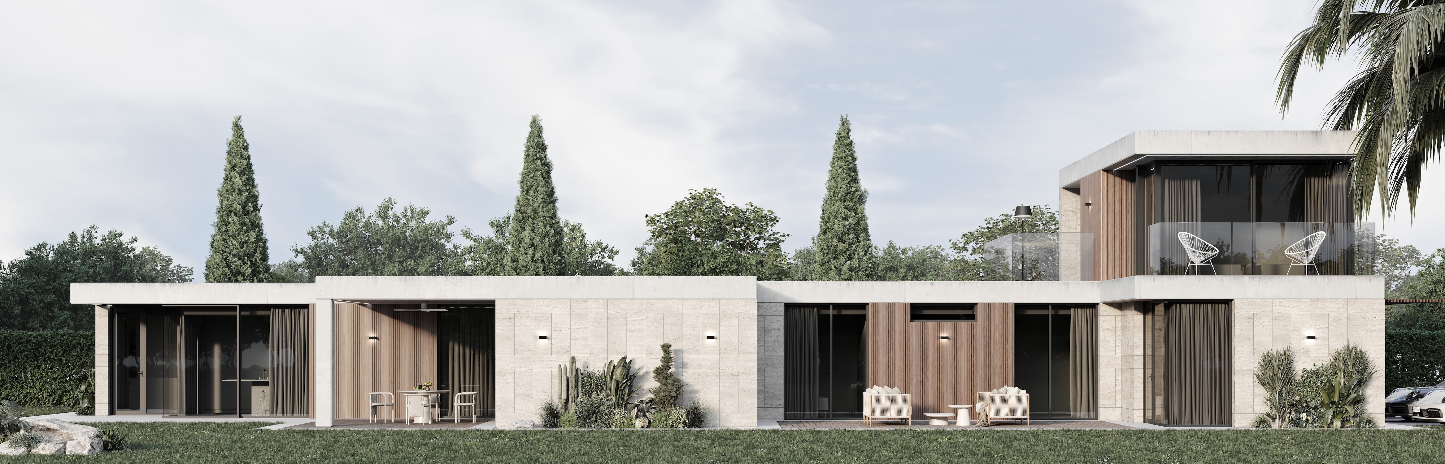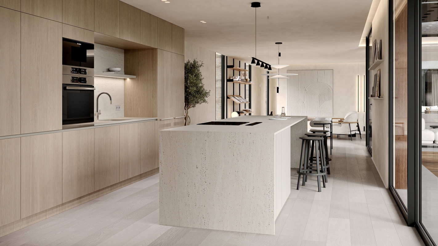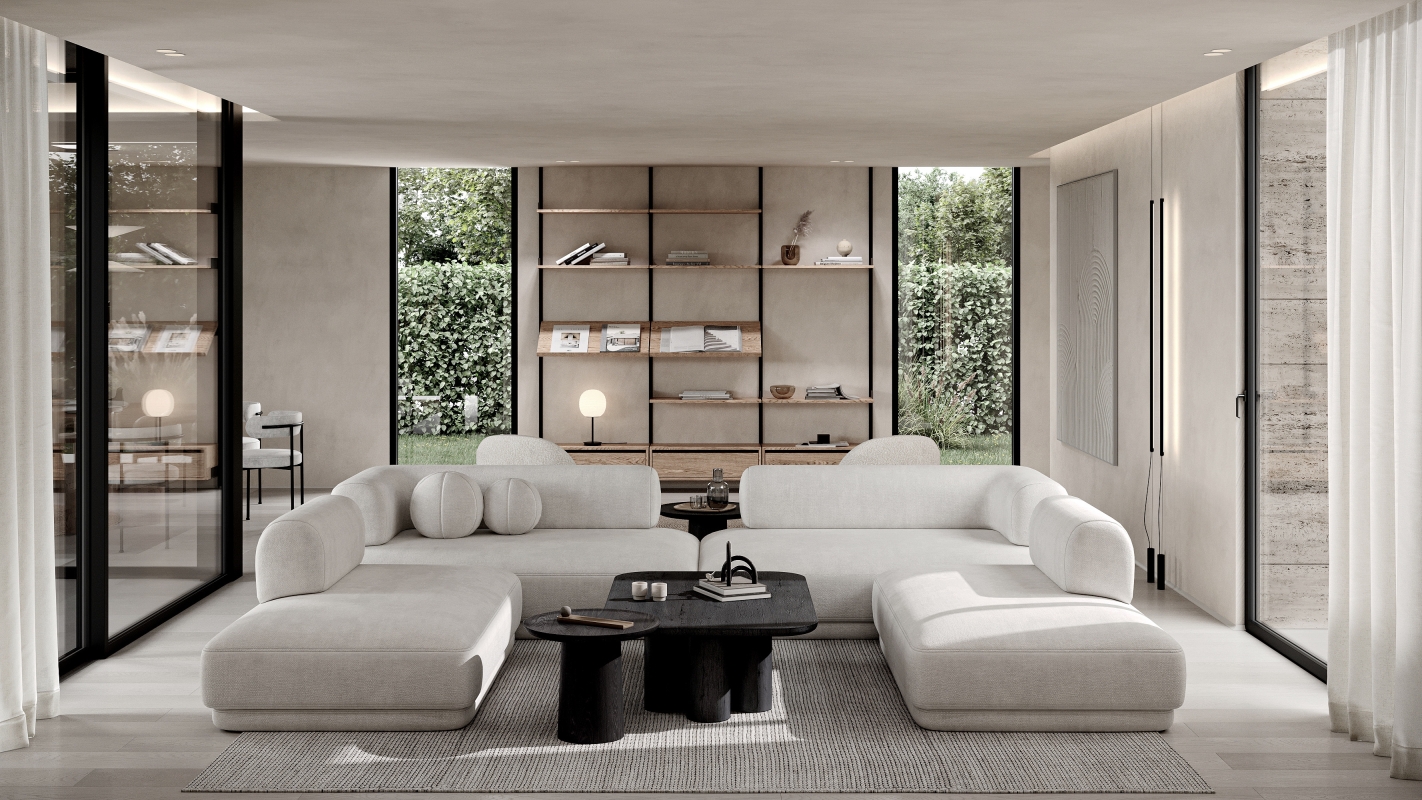 The design establishes a seamless connection between the interior and the exterior. Here, the Mediterranean landscape becomes an integral part of the indoor space, naturally enhancing it. Panoramic windows flood the rooms with light, while the fa?ade of travertine and wood blends effortlessly with the surrounding landscape.